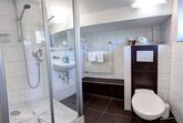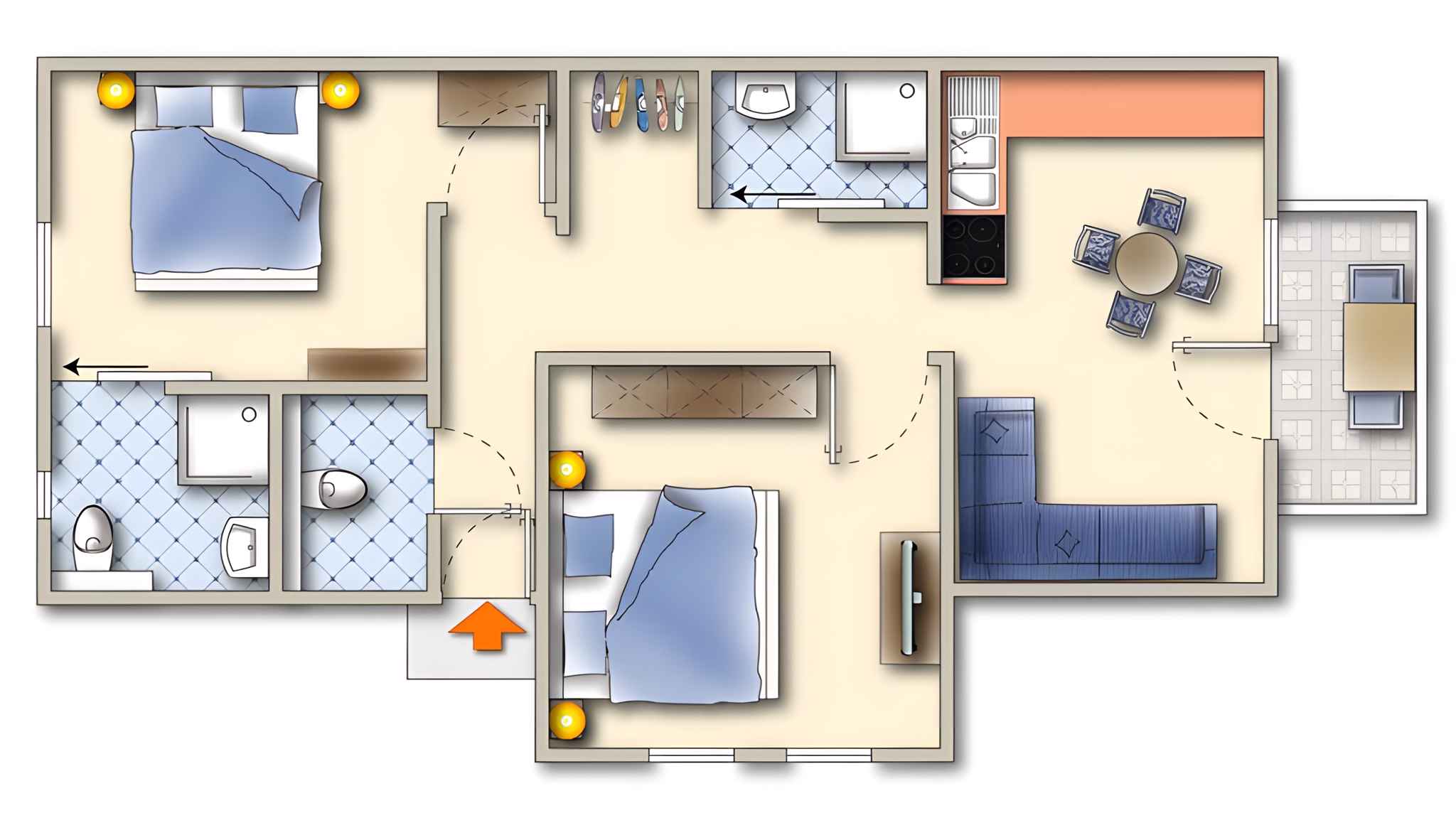Ihre Ferienwohnung erstreckt sich über 2 Etagen, 3 Zimmer (davon 2 Schlafzimmer), ist 50 qm groß und ist für maximal 4 Personen geeignet. An kälteren Tagen kann Ihre Ferienwohnung beheizt werden mit Zentralheizung. Das Rauchen ist in Innenräumen nicht gestattet. Der Eingang ist im Dachgeschoss und führt über eine Innentreppe direkt in den Vorraum mit Garderobe. Dachschräge. Die Zimmer teilen sich wie folgt auf: Wohnküche mit Sitzecke, Essecke, TV und Dachschräge. Die Essecke bietet Platz für 4 Personen. Sie haben Zugang zum überdachten Balkon mit Gartenmöbeln, 1 Tisch und 3 Stühlen. Schlafzimmer mit 1 Doppelbett. Schlafzimmer mit 1 Doppelbett und TV. Kochecke in der Wohnküche mit Essecke, Geschirrspüler, Elektroherd (Cerankochfeld, 2 Platten), Kühlschrank (Eisfach), Mikrowelle, Kaffeemaschine, Toaster und elektrischem Wasserkocher. Die Essecke bietet Platz für 4 Personen. Bad mit Dusche, 1 Waschbecken, WC, Föhn und Fenster. Bad mit Dusche, 1 Waschbecken und Föhn. Separates WC mit WC. Darüber hinaus ist Ihre Ferienwohnung mit WLAN- Internetzugang, Gitterbett und Kinderstuhl ausgestattet. TV- bzw. Rundfunksender können per Satellit empfangen werden.