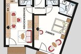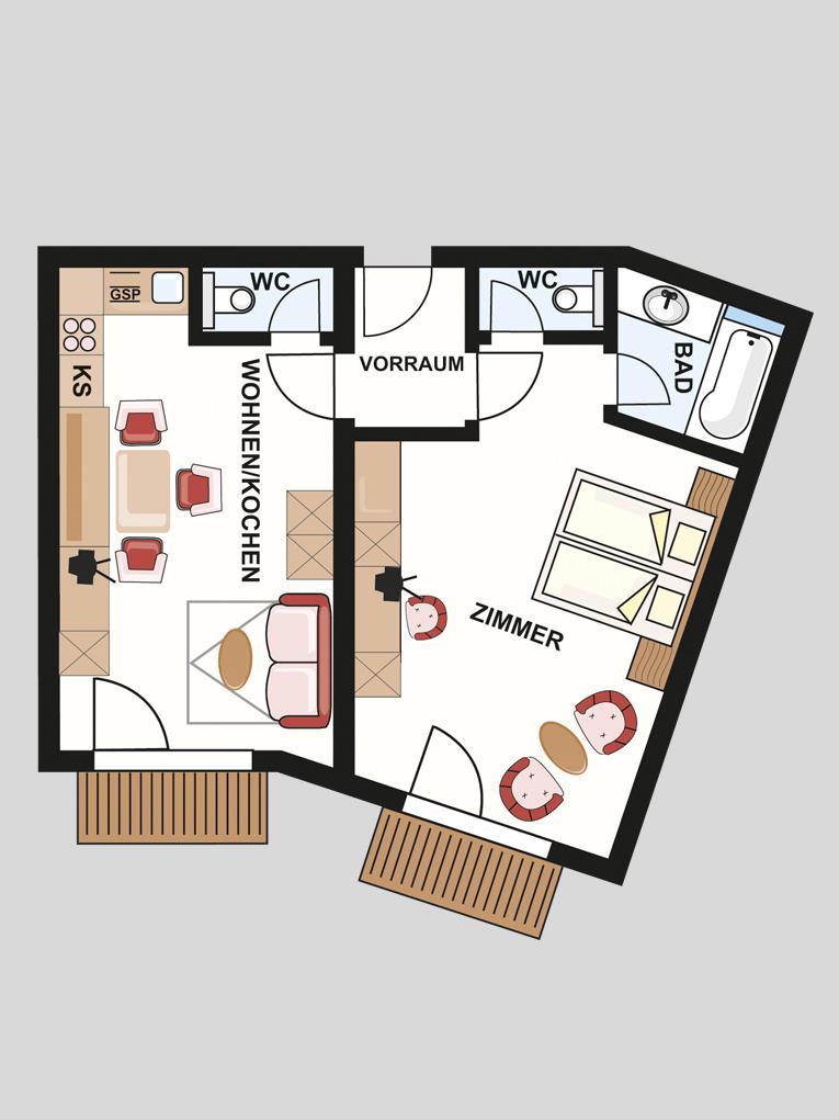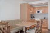 Appartement (ca. 60 m²): 1 Doppelzimmer mit einer Ausziehcouch, 1 Badezimmer mit Bad, WC getrennt, 1 Wohnküche mit Essplatz, Couchecke (teils ausziehbar), Kabel-TV, 4-Platten-Herd, Mikrowelle, Geschirrspüler, Garten oder Balkon, Südlage. Zur Grundausstattung gehören: Bettwäsche, Handtücher, Geschirrtücher, Ess- und Kochgeschirr, Wasserkocher, Safe, Haarfön, Kosmetikspiegel.