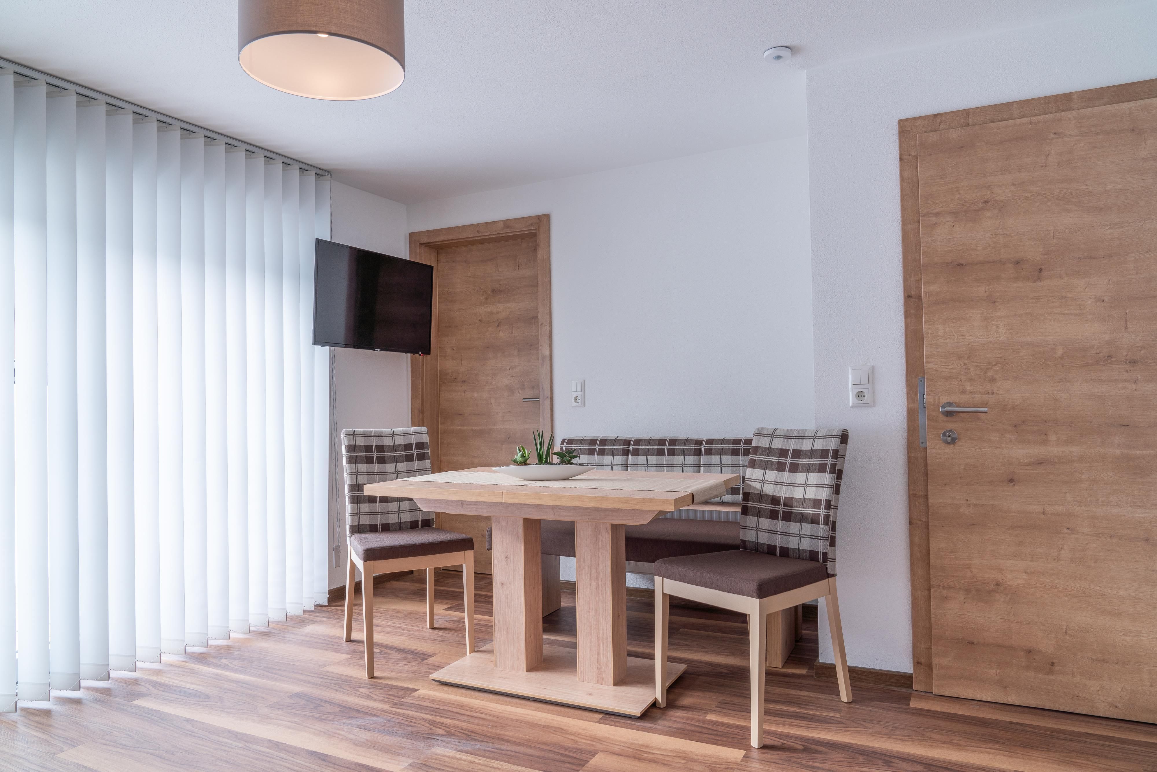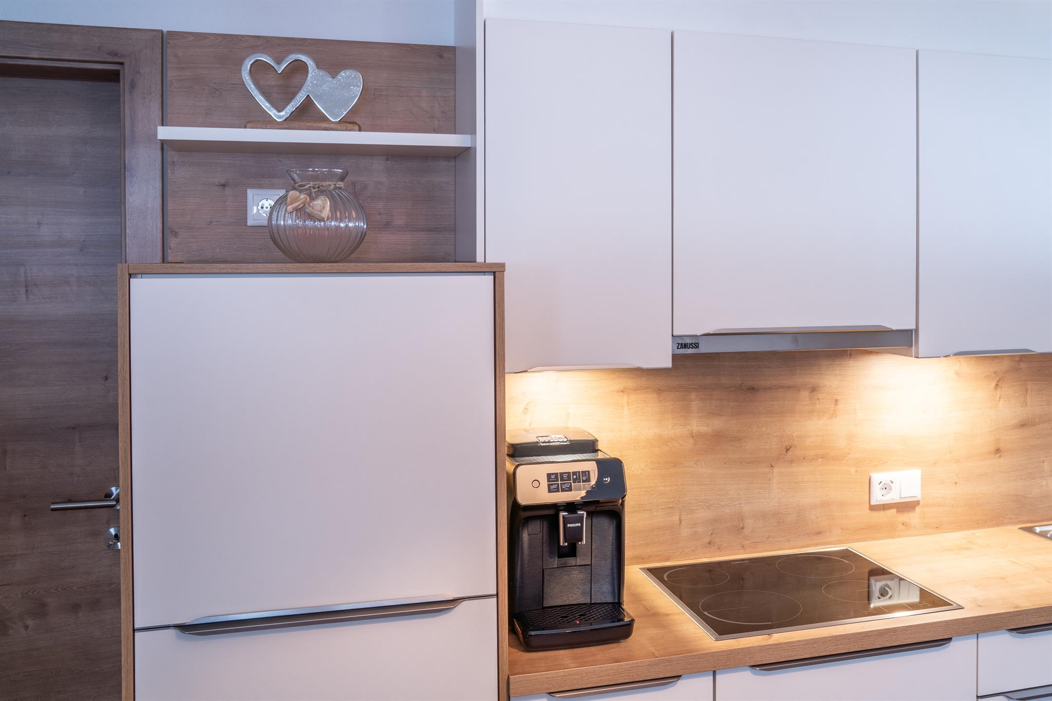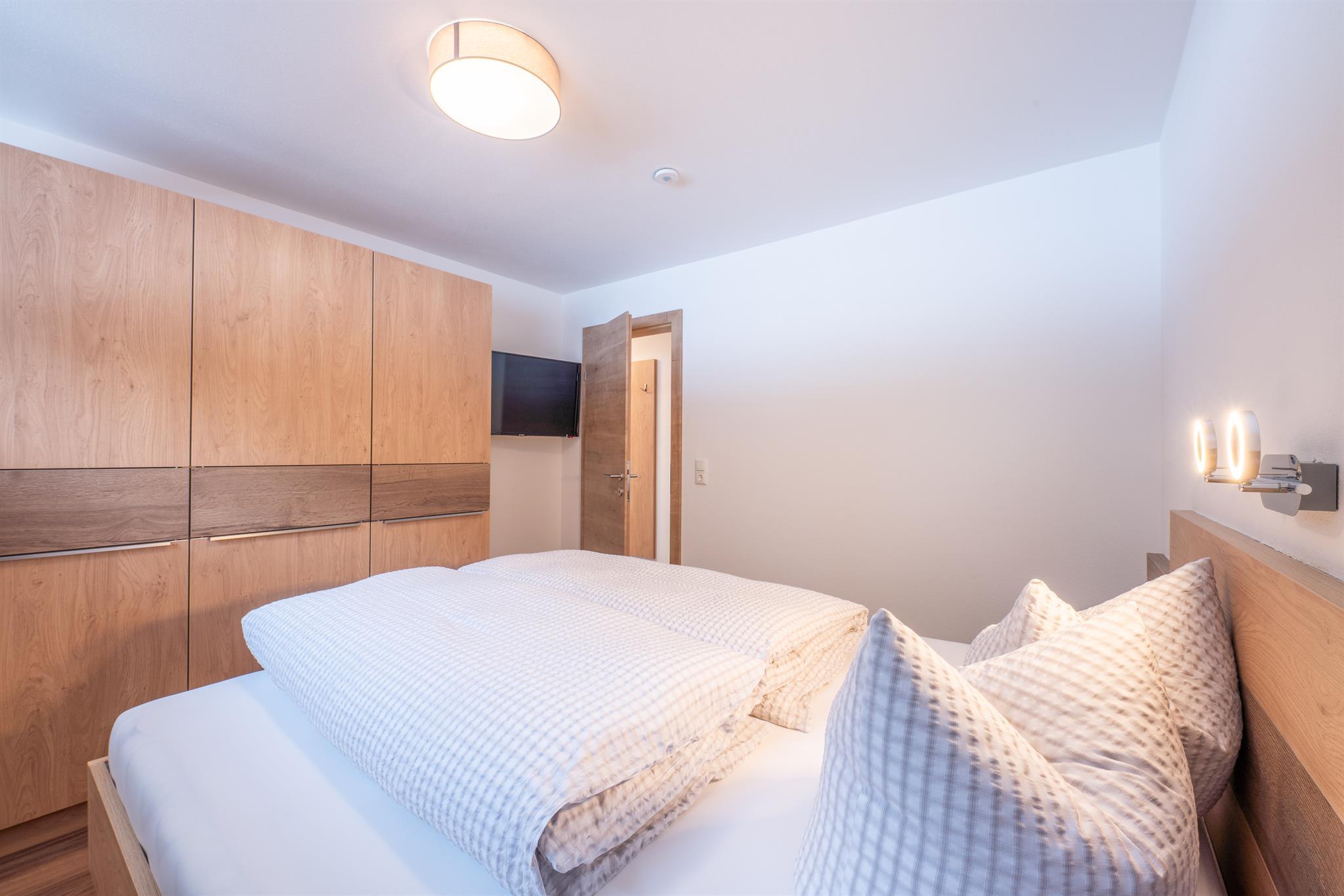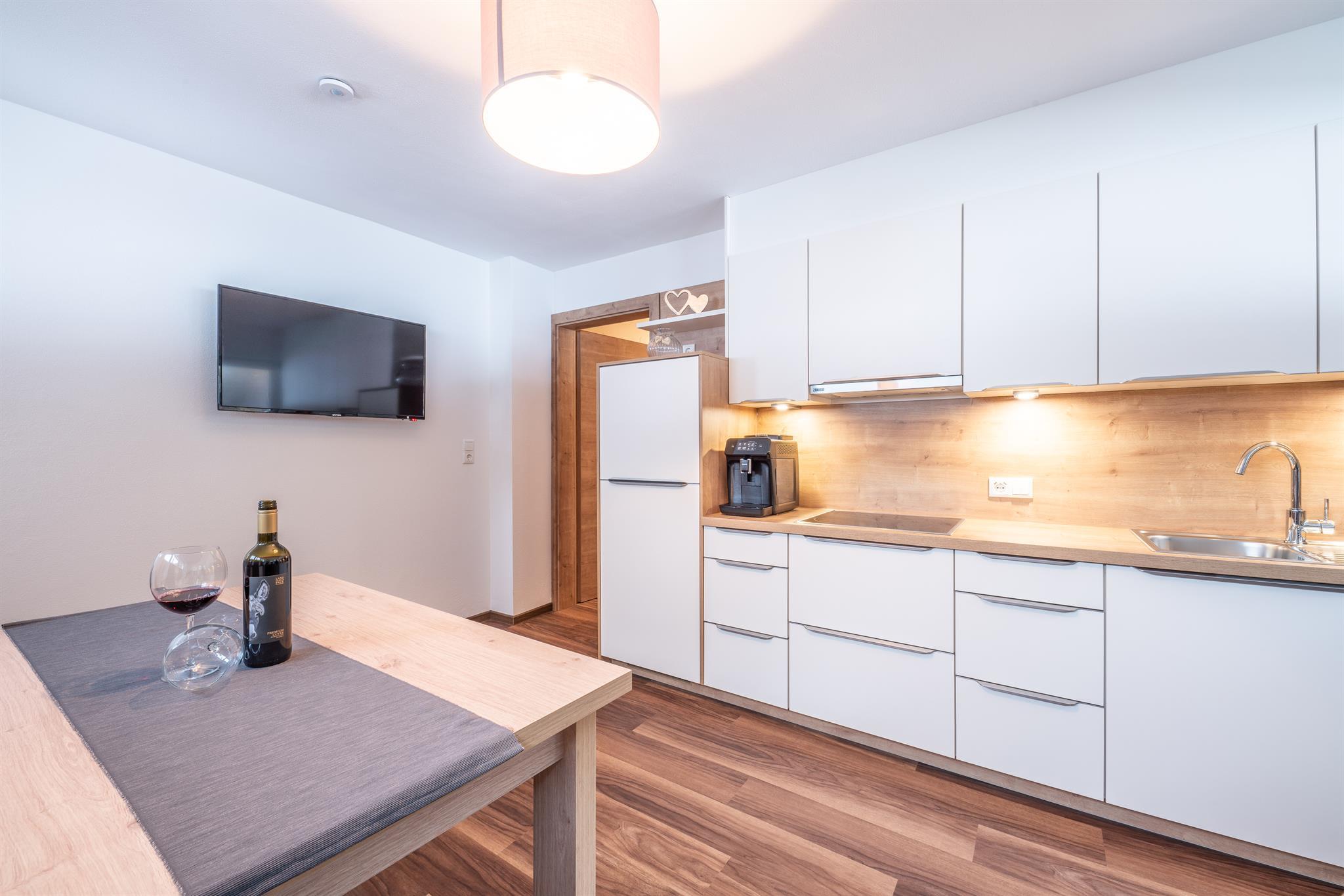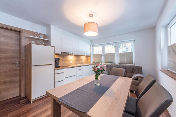 Appartement Bergkristall mit ca. 43 m²: 1 Doppelzimmer, 1 Badezimmer mit Dusche, 1 separates WC, eine vollausgestattete Wohnküche (Kühlschrank mit Tiefkühlfach, Kaffeevollautomat, Wasserkocher, Cerankochfeld, Mikrowelle, Geschirrspüler uvm.) mit Essbereich und ausziehbarem Sofa für 2 weitere Personen. Genießen Sie die umliegende Bergwelt auf der möblierten Südterrasse oder in unserem „Gemeinschaftsgarten“.