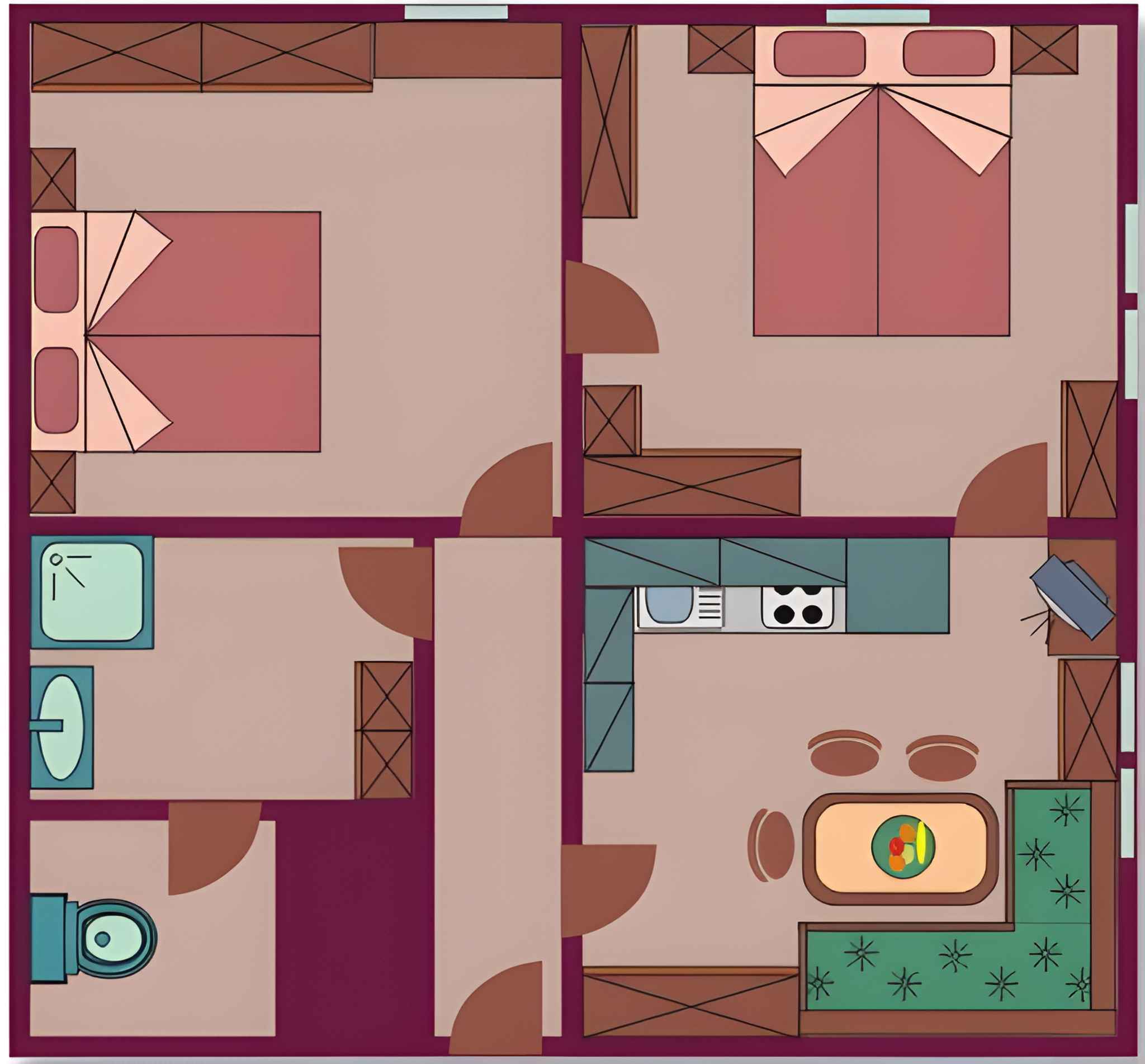Ihre Ferienwohnung erstreckt sich über 1 Etage, 3 Zimmer (davon 2 Schlafzimmer), ist 51 qm groß und ist für maximal 4 Personen geeignet. An kälteren Tagen kann Ihre Ferienwohnung beheizt werden mit Zentralheizung. Der Eingang ist ebenerdig und führt direkt in den Vorraum mit Garderobe. Die Zimmer teilen sich wie folgt auf: Wohnküche mit Sitzecke, Essecke und TV. 2 Schlafzimmer jeweils mit 1 Doppelbett. Kochecke in der Wohnküche mit TV, Geschirrspüler, Elektroherd (Cerankochfeld), Backofen, Kühlschrank, Mikrowelle und Kaffeemaschine. Bad mit Dusche. Separates WC mit WC. Darüber hinaus ist Ihre Ferienwohnung mit WLAN- Internetzugang ausgestattet. TV- bzw. Rundfunksender können per Kabel empfangen werden.
