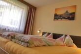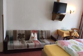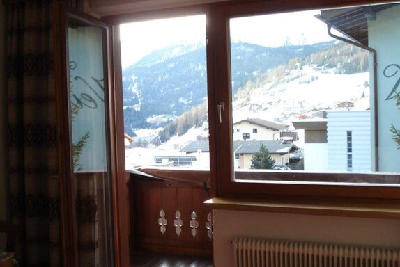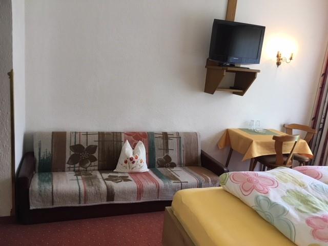 Gemütliches mit modernen Möbeln eingerichtetes Doppelzimmer (ca. 25 m²) mit ausziehbarem Sofa. Badewanne oder Dusche/WC, Kosmetikspiegel, Flat-TV, Radio und teilweise Balkon, mit herrlichem Rundblick auf die Bergwelt der Ötztaler Alpen.