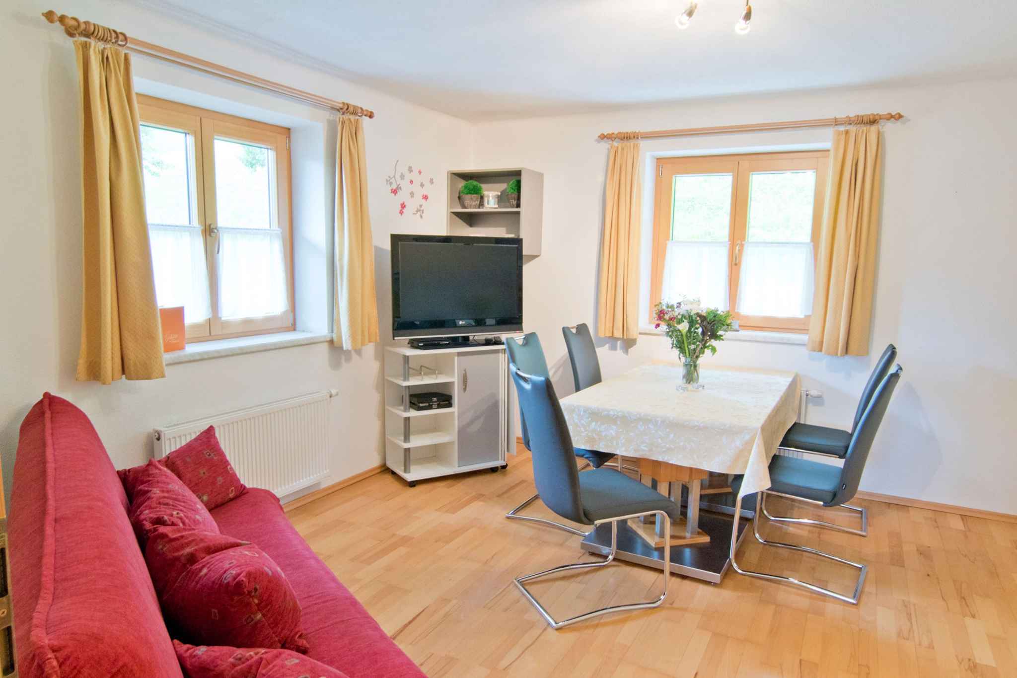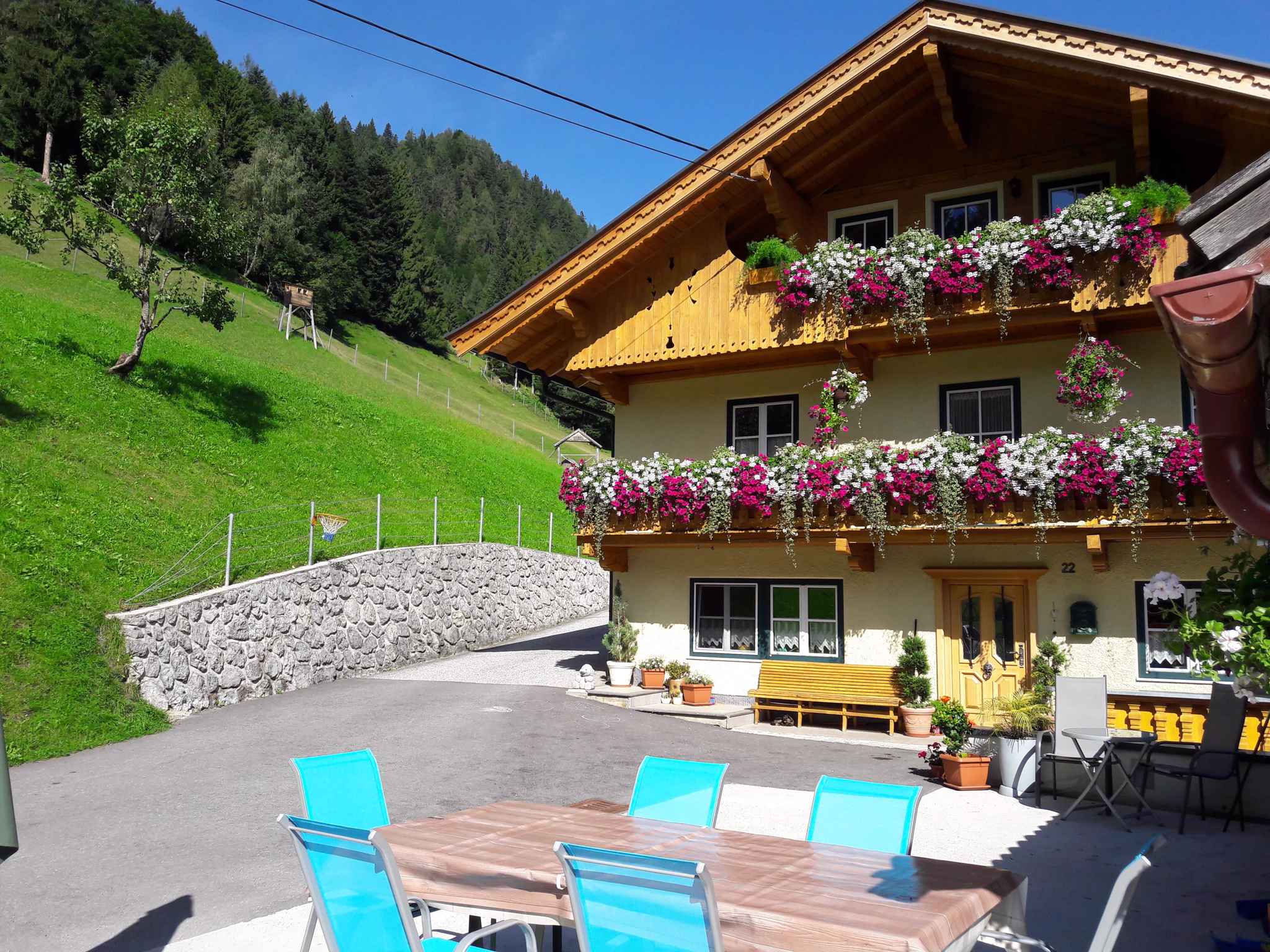 Der Hof verfügt über Kinderspielplatz, Schaukel, Sandkasten, Gartenmöbel und Grillmöglichkeit. Rückerstattung der Kaution spätestens 7 Tage nach Abreise per Überweisung.Lage: Schlitters, Ortsteil Schlitterberg, 890 mNN. Die Ferienwohnung befindet sich in einem 1950 erbauten einzeln stehenden Einfamilienhaus, wurde im Jahr 2007 renoviert und ist modern und zweckmäßig eingerichtet. Das Grundstück liegt auf einem Bauernhof. Auch wegen des Ausblicks in das Tal und der ruhigen und sonnigen Hanglage am Waldrand ist das Domizil beliebt. Die 2800 m lange Zufahrt zum Grundstück erfolgt über eine asphaltierte Bergstraße. Im Winter sind Schneeketten empfohlen. Am Haus stehen Parkplätze auf dem Grundstück zur Verfügung. Zufahrt erfolgt über eine asphaltierte Bergstraße. Schneeketten sollten mitgeführt werden, kommen aber nur selten zum Einsatz. Anreisebeschreibung vom Vermieter unbedingt einhalten, nicht blind mit Navigation fahren! Die nächste Einkaufsmöglichkeit ist 4 km entfernt, Restaurant 3 km und Ortszentrum 6 km. Sauna in Fügen 15 km. Flughafen in Innsbruck 40 km. Apotheke in Jenbach 1000 m. Bahnhof in Rotholz 3 km. Arzt in Schlittres 6 km. Bank in Strass 4 km. Hauptstraße 3 km. Wanderwege und Bikerstrecken ab Haus. Erlebnistherme 15 km.Im Sommer: Schlitter See in Schlitters 6 km, Badestrand mit Wiese und Kies. Weitere Sport- und Freizeitangebote warten auf Sie in der Umgebung. Zum Beispiel Tennis in Stans 10 km. Golf in Uderns 10 km. Wandern, Mountainbiken, Reiten, Waldfrüchte sammeln (gutes Pilzgebiet) in unmittelbarer Nähe.Im Winter: Der nächste Skilift befindet sich in 20 km Entfernung in Fügen. Das nächstgelegene Skigebiet Spieljoch - Hochfügen ist 20 km entfernt und befindet sich in Fügen. Der Skibus fährt 2,7 km von Ihrem Feriendomizil. Weiterhin gibt es eine Loipe in Achensee, 5 km und eine Eislaufbahn in Schwaz, 10 km. Eine Rodelbahn erwartet Sie in Fügenberg, 15 km. Skiverleih, Skischule jeweils 15 km in Fügen. Skigebiet Rofanseilbahn in Maurach 15 km. Kellerjochbahn 15 km in Schwaz. Zillertaltherme und Eislaufen in Fügen.
