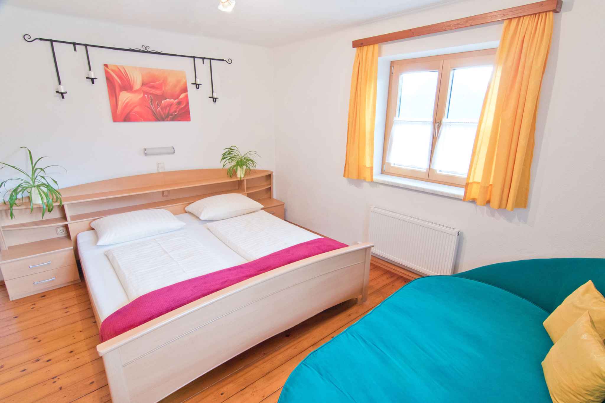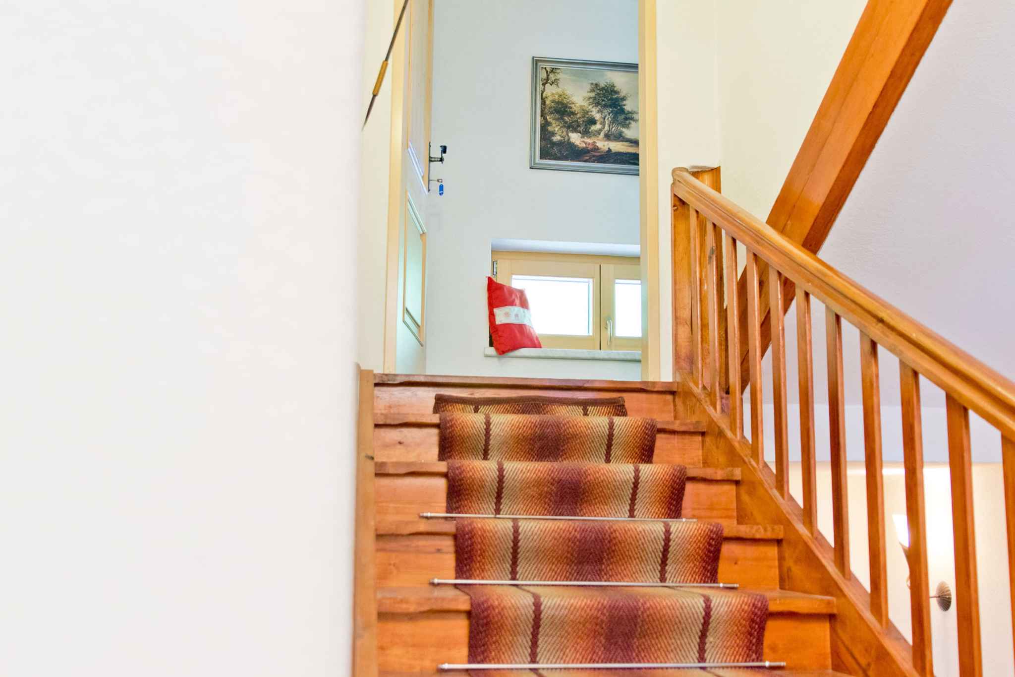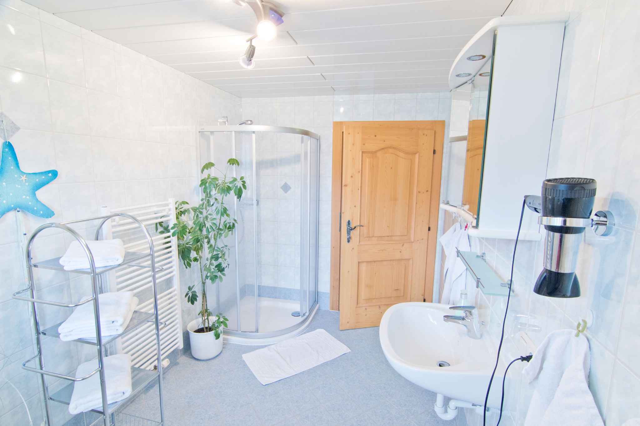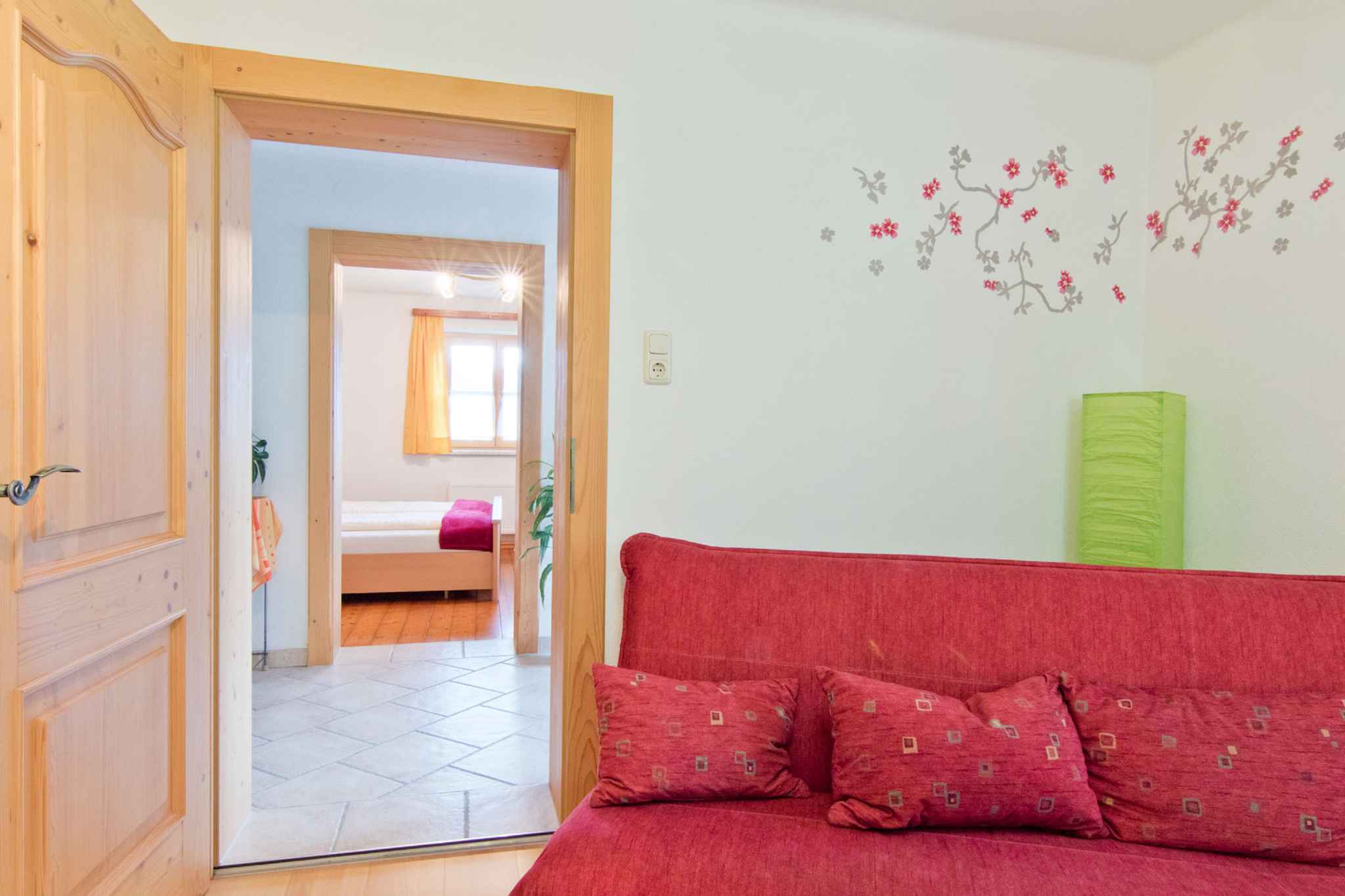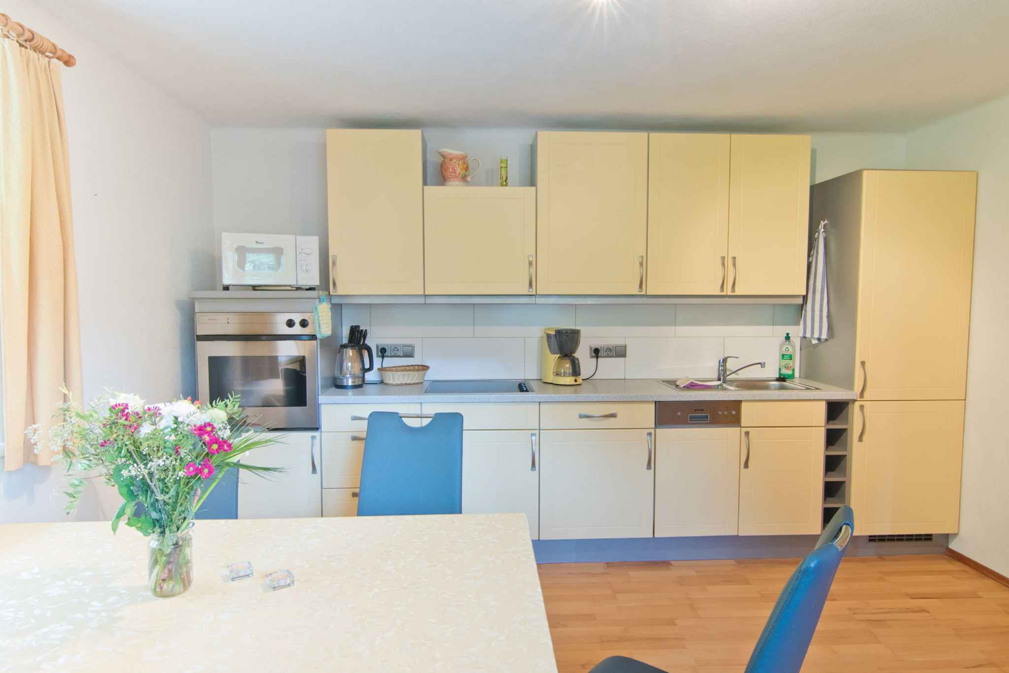 und führt über eine Innentreppe direkt in den Flur mit Türen zu allen Räumen. Der Flur wird auch vom Eigentümer gelegentlich genutzt. Vom Flur gelangt man auf den 18 qm großen Balkon mit Sitzgelegenheiten und Blick auf Wald und Tal. Die Zimmer teilen sich wie folgt auf: Wohnküche mit Sitzecke, Essecke und TV. Schlafzimmer mit 1 Doppelbett und 1 Zusatzbett auf Couch/Sofa. Schlafzimmer mit 1 Doppelbett und 1 Etagenbett. Amerikanische Küche in der Wohnküche mit Geschirrspüler, Elektroherd (Cerankochfeld), Backofen, Kühlschrank, Mikrowelle, Kaffeemaschine, Toaster und elektrischem Wasserkocher. Bad mit Dusche, 1 Waschbecken, WC und Fenster. Darüber hinaus ist Ihre Ferienwohnung mit WLAN- Internetzugang, Gitterbett und Kinderstuhl ausgestattet. TV- bzw. Rundfunksender können per Satellit empfangen werden.