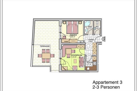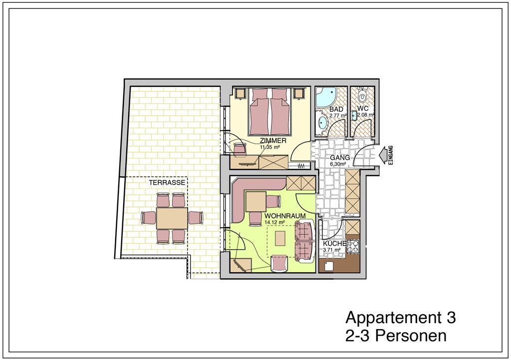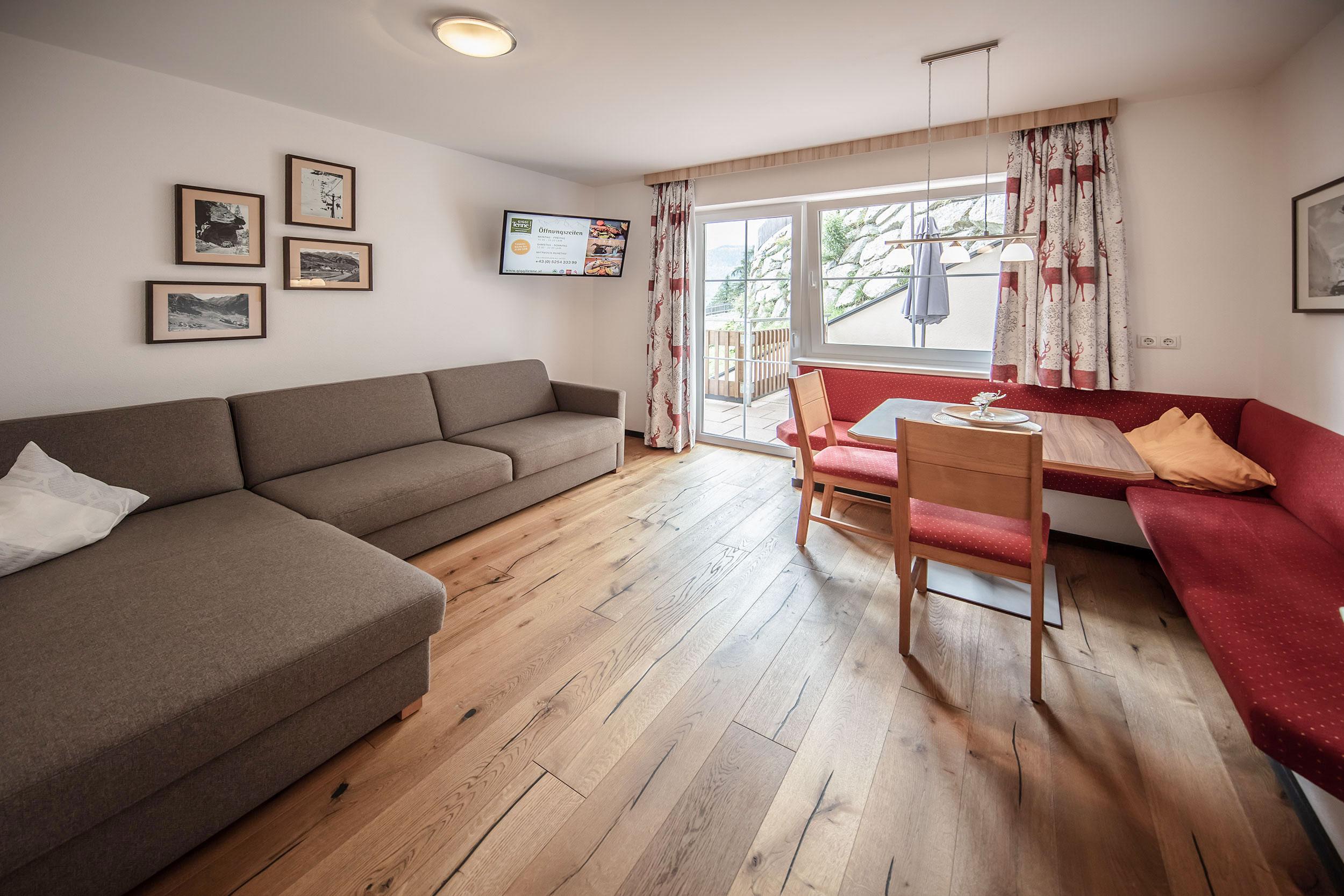 Geräumiges und gemütlich eingerichtetes Appartement (ca. 45 m²) mit Terrasse (ca. 40m²) 1 Doppelzimmer mit trennbaren Betten, Dusche, WC, Fön, Kabel TV, Wireless LAN, Safe komplett ausgestattete Küche (Wasserkocher, Toaster, Kaffeemaschine, Kühlschrank mit Gefrierfach, Herd, Backofen, Spülmaschine), Wohnraum mit Sofa, Sitzecke, TV