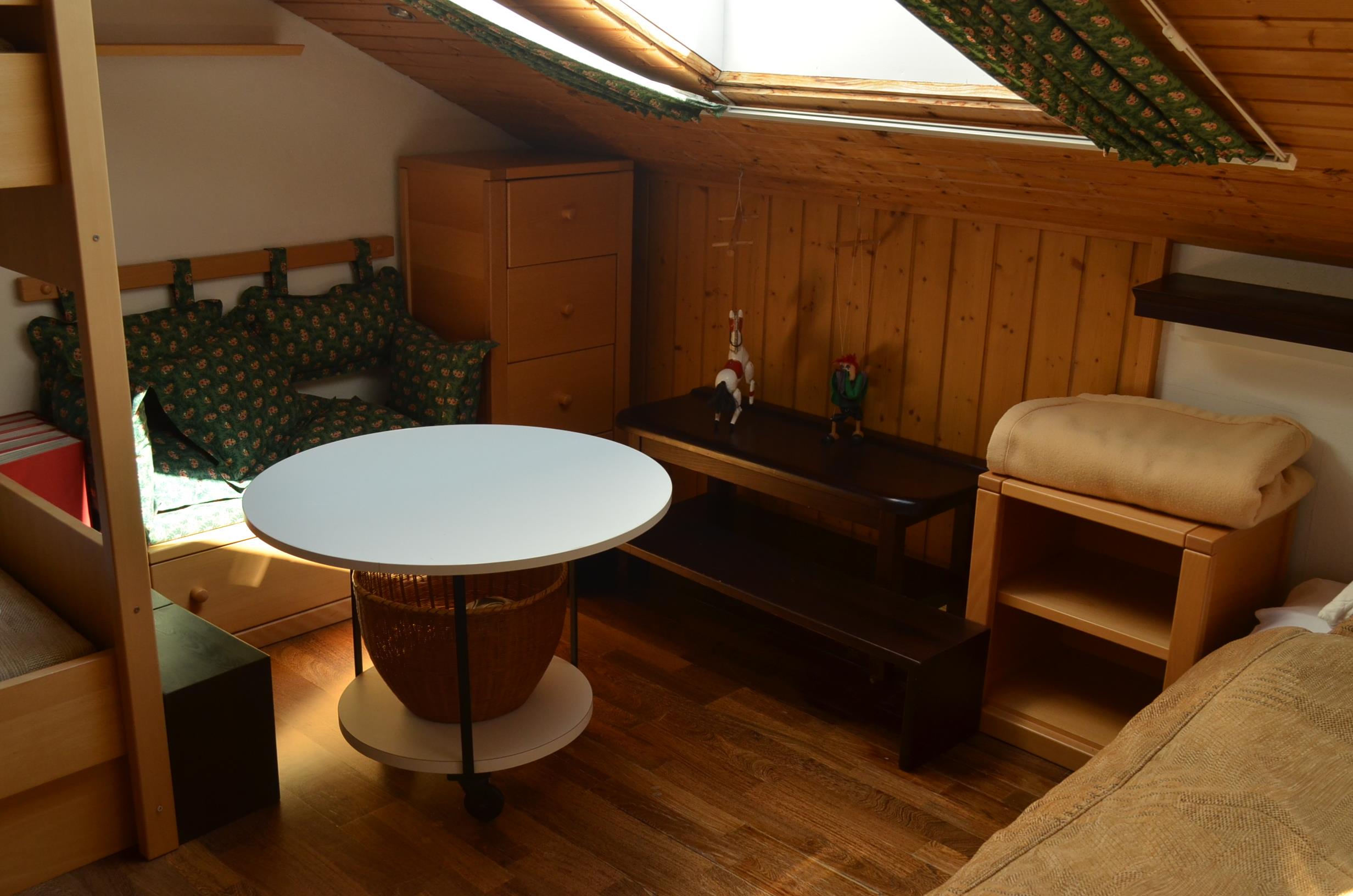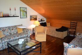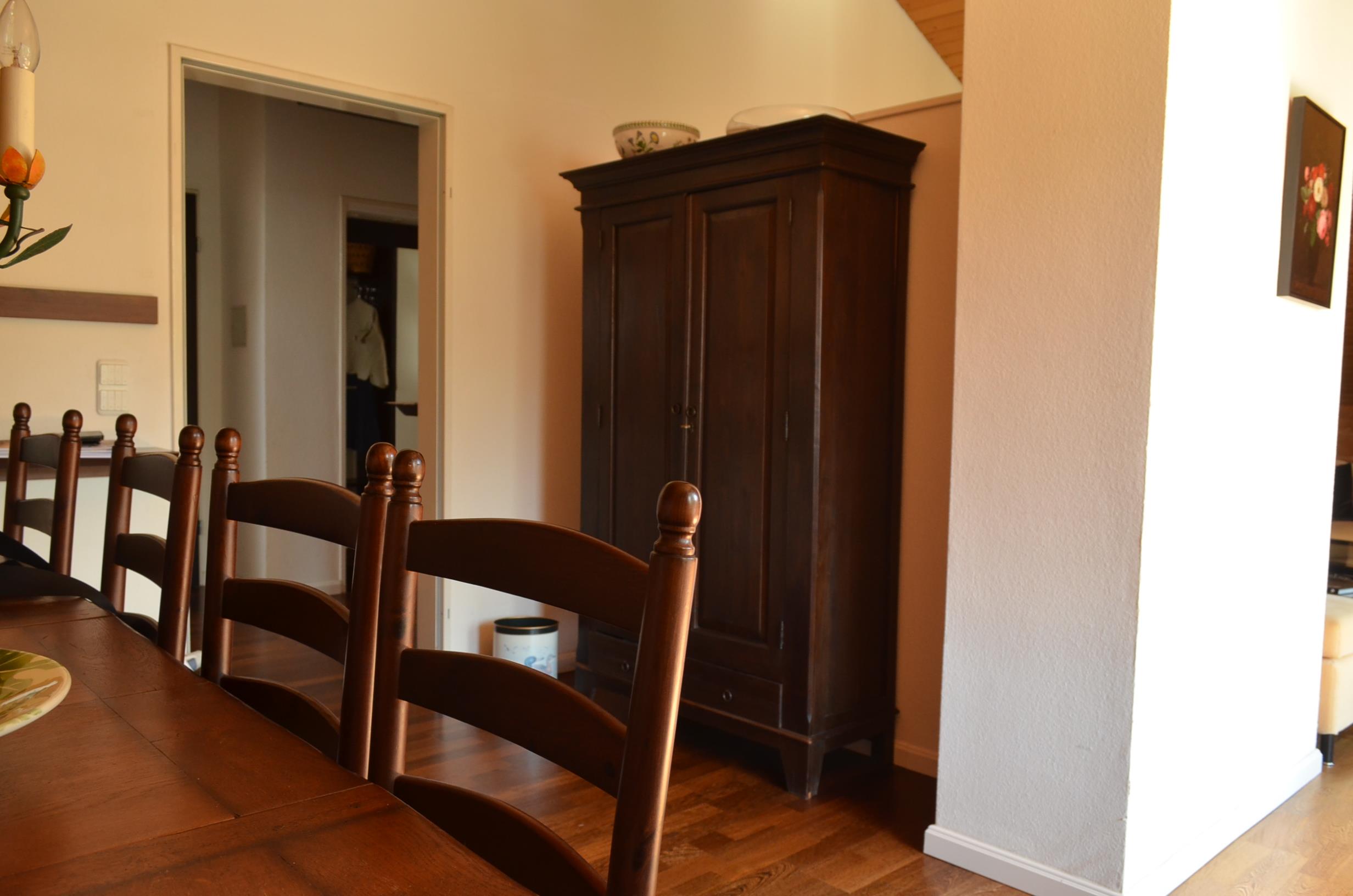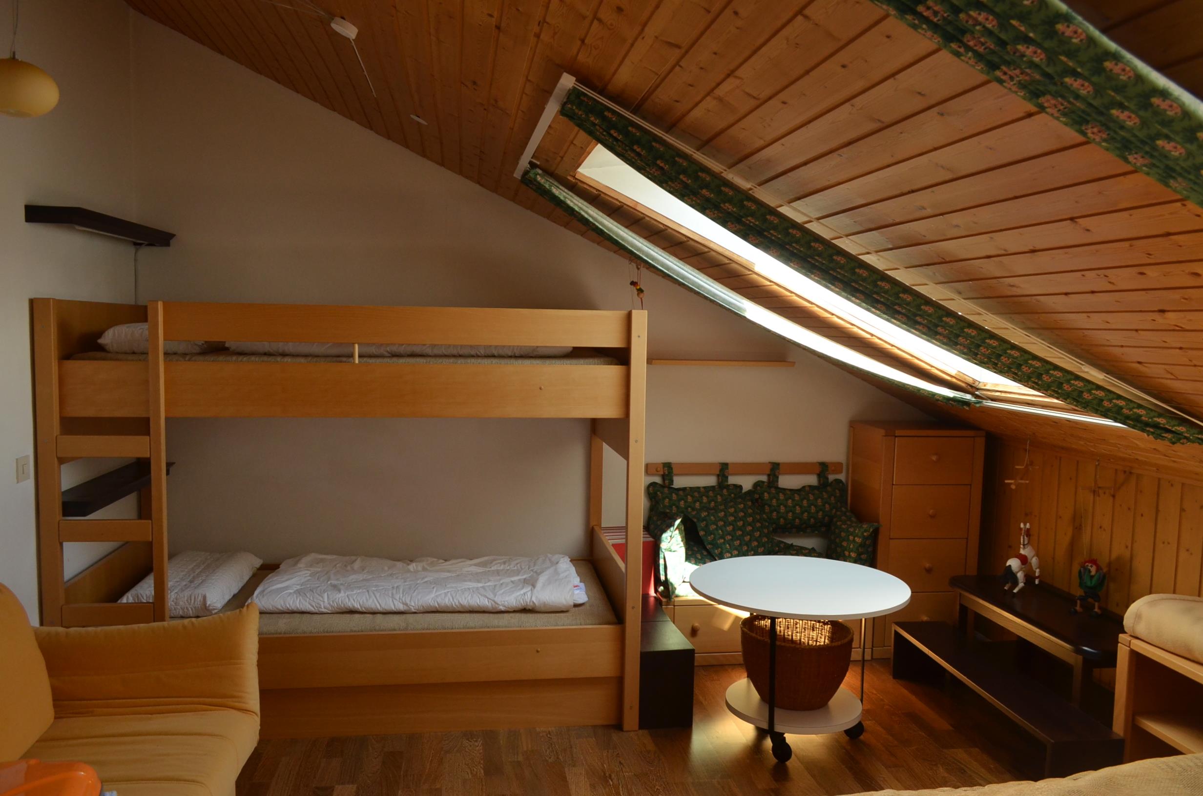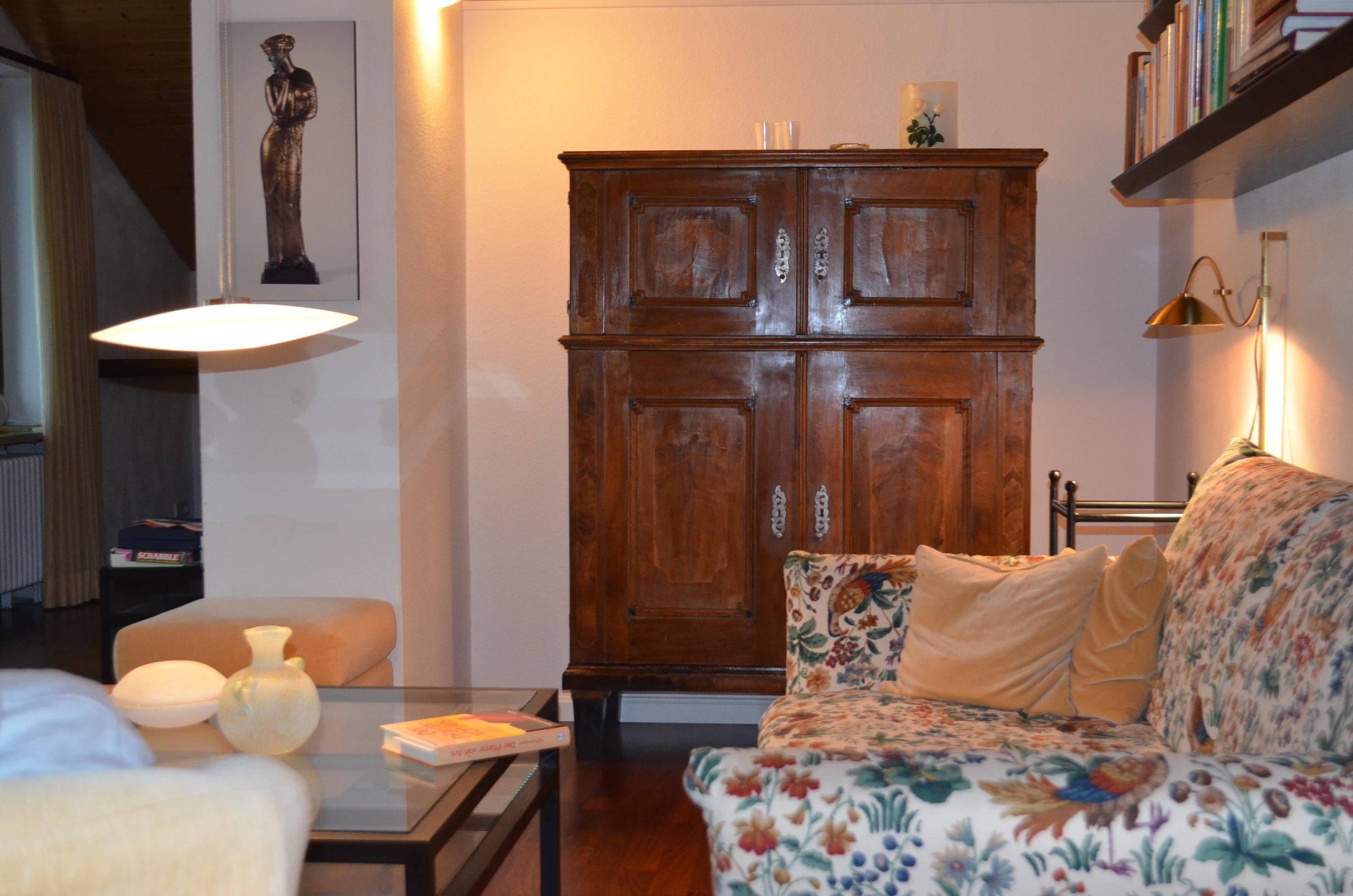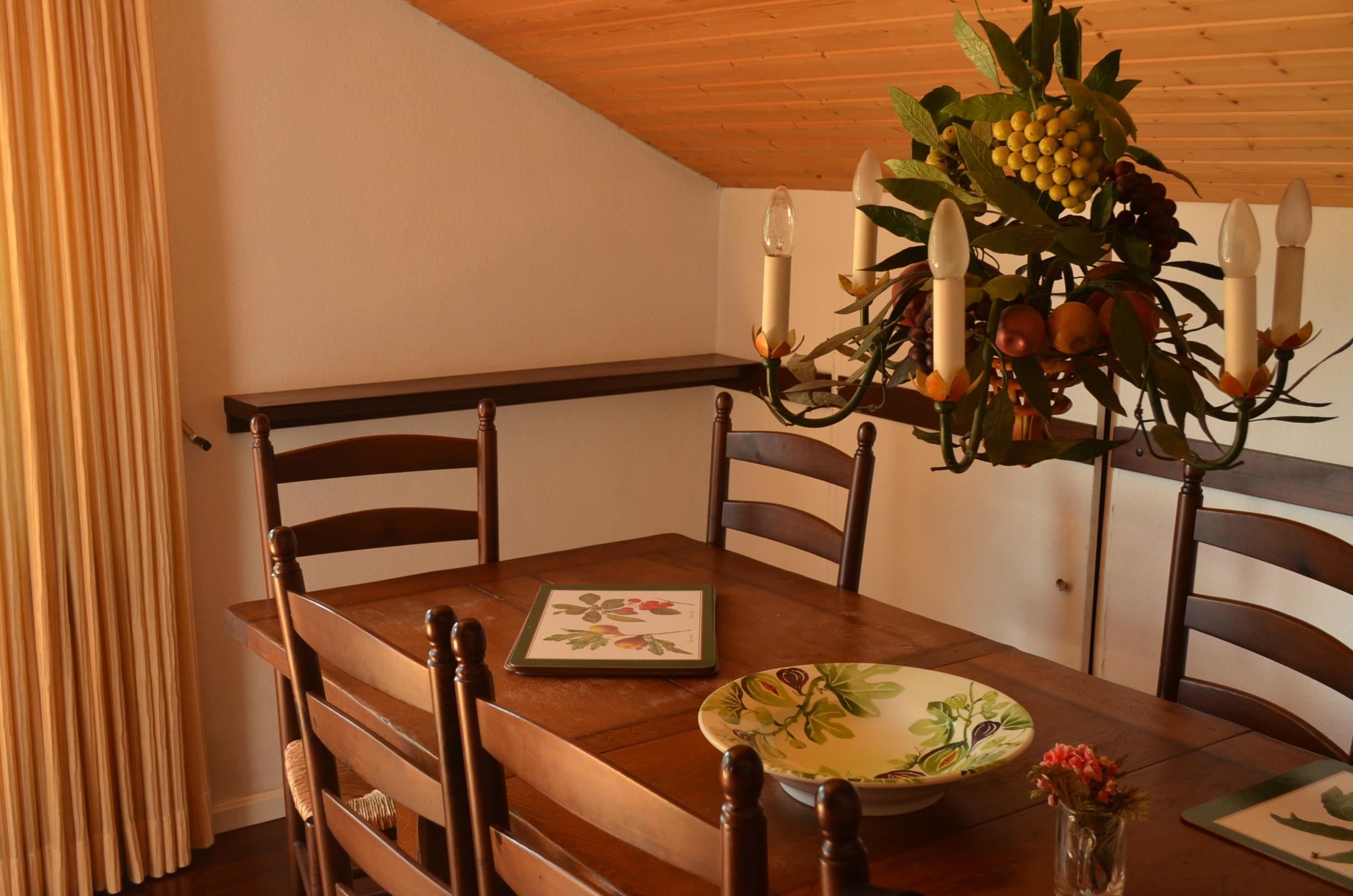 Unsere schöne Dachwohnung (62 qm) mit großem Balkon liegt mitten in Steibis. Wohn-und Esszimmer sind mit schönen zum Teil antiken Echtholzmöbeln ausgestattet. Fernsehen, Bücher, CD-Player stehen zur Verfügung.  Bad mit Dusche und zwei Waschbecken ist getrennt vom WC. Die Küche ist klein, hat aber eine praktische Durchreiche zum Esszimmer. In der Küche gibt es eine Kaffeemaschine, Kühlschrank mit Minieisfach, Mikrowelle, Herd mit vier Kochstellen und einen Backofen. In der geräumigen Diele befindet sich eine Garderobe und Platz für Schuhe zum Abstellen. Das Schlafzimmer ist mit einem Doppelbett (140 x 200), einem Einzellbett und einem Etagenbett ausgestattet. Für Kinder gibt es dort eine kleine Spielecke mit Tisch und Sitzgelegenheiten. Auf dem Balkon mit Blick auf den Hochgrat sind ein Liegestuhl, ein Tisch und zwei Gartenstühle. Im Keller befindet sich eine Waschmaschine, ein Trockner, Möglichkeiten Wäsche aufzuhängen, eine Tischtennisplatte und einen Platz, um die Skier abzustellen.
