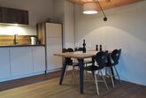 Der Wohn-/Essbereich mit sichtbarem Dachstuhl, Küche, Eßtisch und gemütlicher Couch lädt zum Entspannen ein. Wird das Sofa zum Schlafen genutzt, hat es eine Liegefläche von 143 x 205 cm.