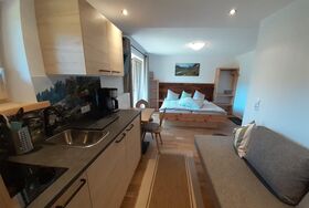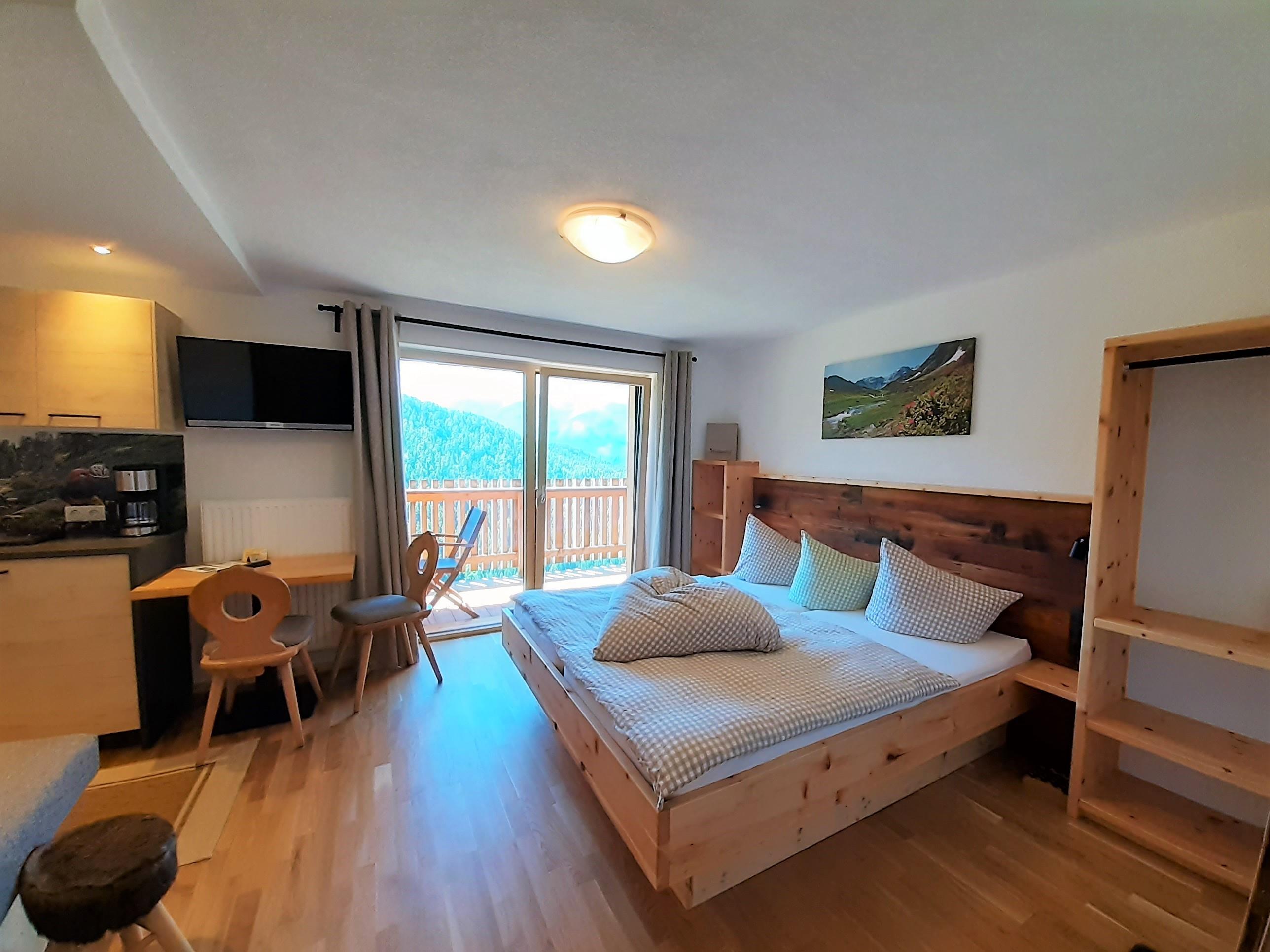 Studio Tessadina (25m²) -Klein aber fein - mit einem gigantischen Blick auf die Ötztaler Bergwelt, in die man sich beim täglichen Anblick verlieben muss. Im 1. Stock, Wohn-Essplatz mit Kochecke, Doppelbett, TV, Safe, Massageroller, Föhn und Balkon zur Südseite. Badezimmer mit Dusche/WC. Kann durch eine Verbindungstüre mit unserer Fewo Talissa als Fewo mit 2 Schlafzimmer genutzt werden.