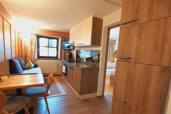 Komfortable, gemütliche Ferienwohnung für 2-3 Personen bestehend aus: 1 Schlafzimmer, Wohnzimmer mit Schlafcouch, Safe, TV, vollausgestattete Küche mit Sitzecke, DU/WC und Föhn, Waschmaschine und Bügeleinrichtung (im Keller), privater Eingang und Balkon mit Bergblick. Kann durch eine Verbindungstüre mit unserem Studio Tessadina als Fewo mit 2 Schlafzimmer, 2 Bäder und Südbalkon gebucht werden.