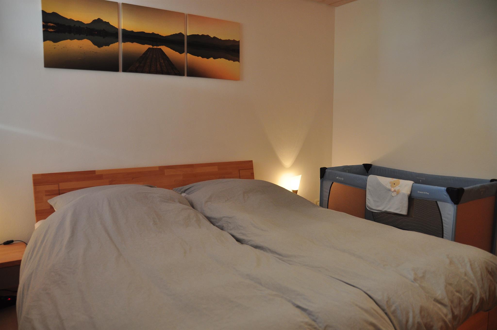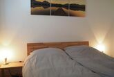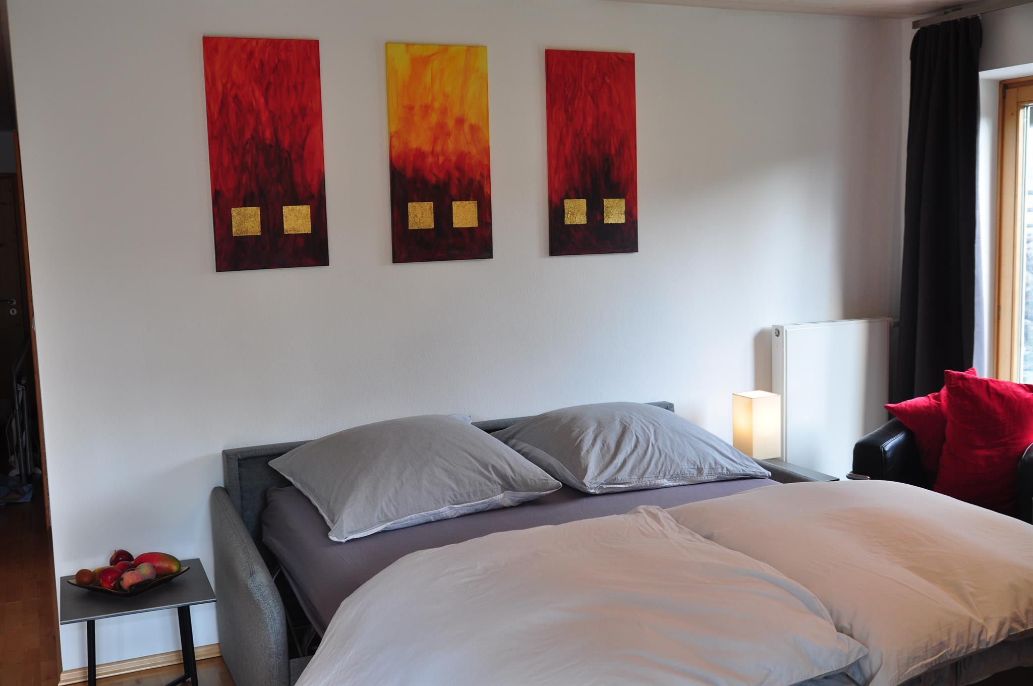 Schlafzimmer mit Doppelbett (180x200cm). Hochwertige Ausklappcouch mit vollwertiger Matratze (160x200cm) bietet im Wohnzimmer Schlafplatz für 2 weitere Personen.