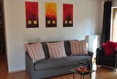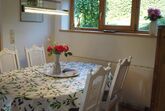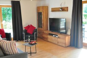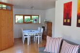 Die 60 Quadratmeter große Ferienwohnung ist über einen separaten Eingang begehbar und verfügt über ein großzügiges Wohn- und Esszimmer, ein Schlafzimmer sowie Küche, Bad/WC und Garderobe. Fliesenboden und Parkett.