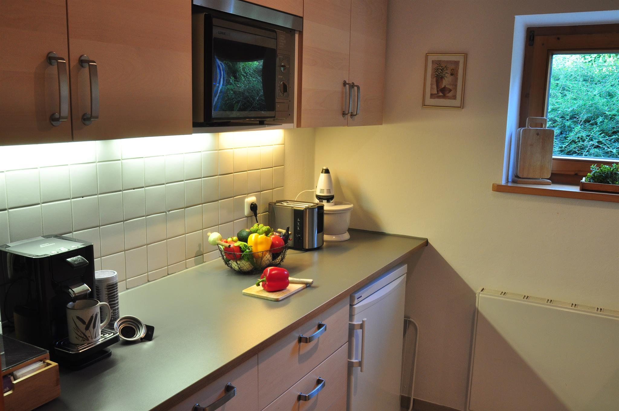 Die Küche ist voll ausgestattet mit Elektroherd, Geschirrspüler, Kühlschrank/kleines Gefrierfach, Kaffeemaschine (Senseo Pads), Wasserkocher, Toaster, Handrührgerät und ausreichend Geschirr und Küchenutensilien vorhanden um nach Herzenslust kochen zu können.