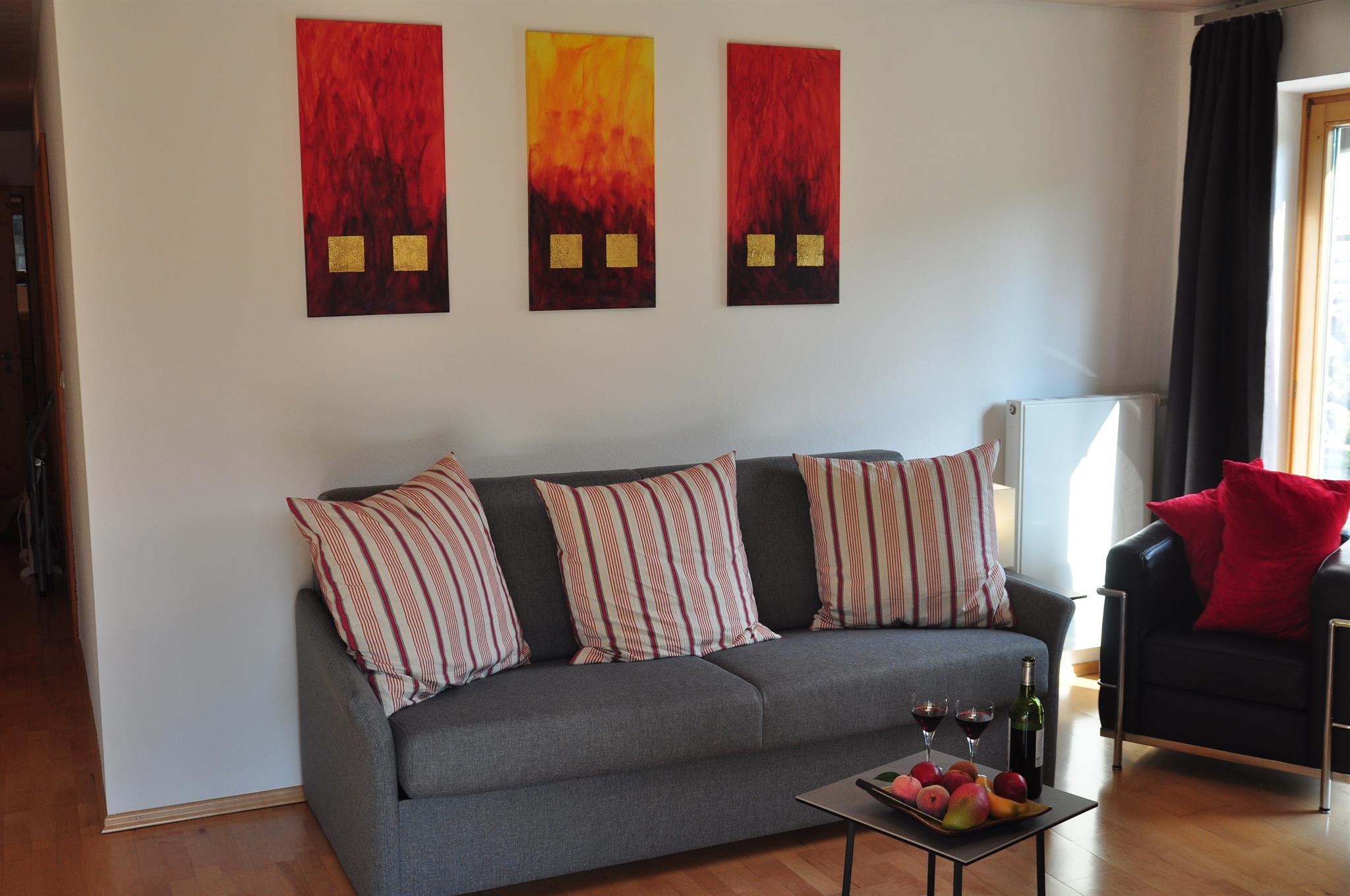 Die modern eingerichtete, etwa 60 Quadratmeter große Ferienwohnung befindet sich im Souterrain eines Einfamilienhauses und ist über einen separaten Eingang begehbar. Sie verfügt über ein großzügiges kombiniertes Wohn- und Esszimmer, ein Schlafzimmer sowie Küche, Bad/WC und Garderobe. Von der Terrasse genießen Sie die Aussicht auf den Saneberg und die Skilifte in Sinswang und hören von dort während der Sommermonate auf der Terrasse die Kuhglocken der grasenden Kühe.