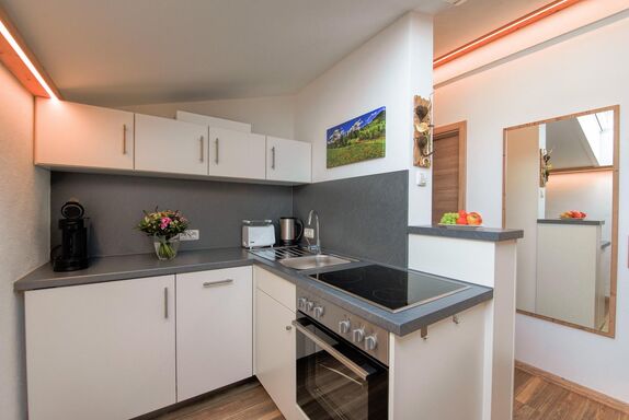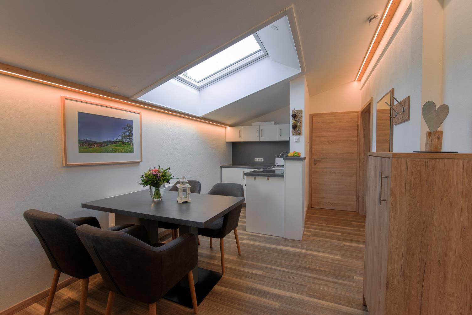Die Ferienwohnung Staufenblick ist geräumig und mit jeglichem Komfort ausgestattet. Sie verfügt über ein Schlafzimmer mit großem Kleiderschrank. Im Wohn- Essbereich befindet sich eine Ausziehcouch. Von beiden Räumen aus kommen Sie auf den Balkon.