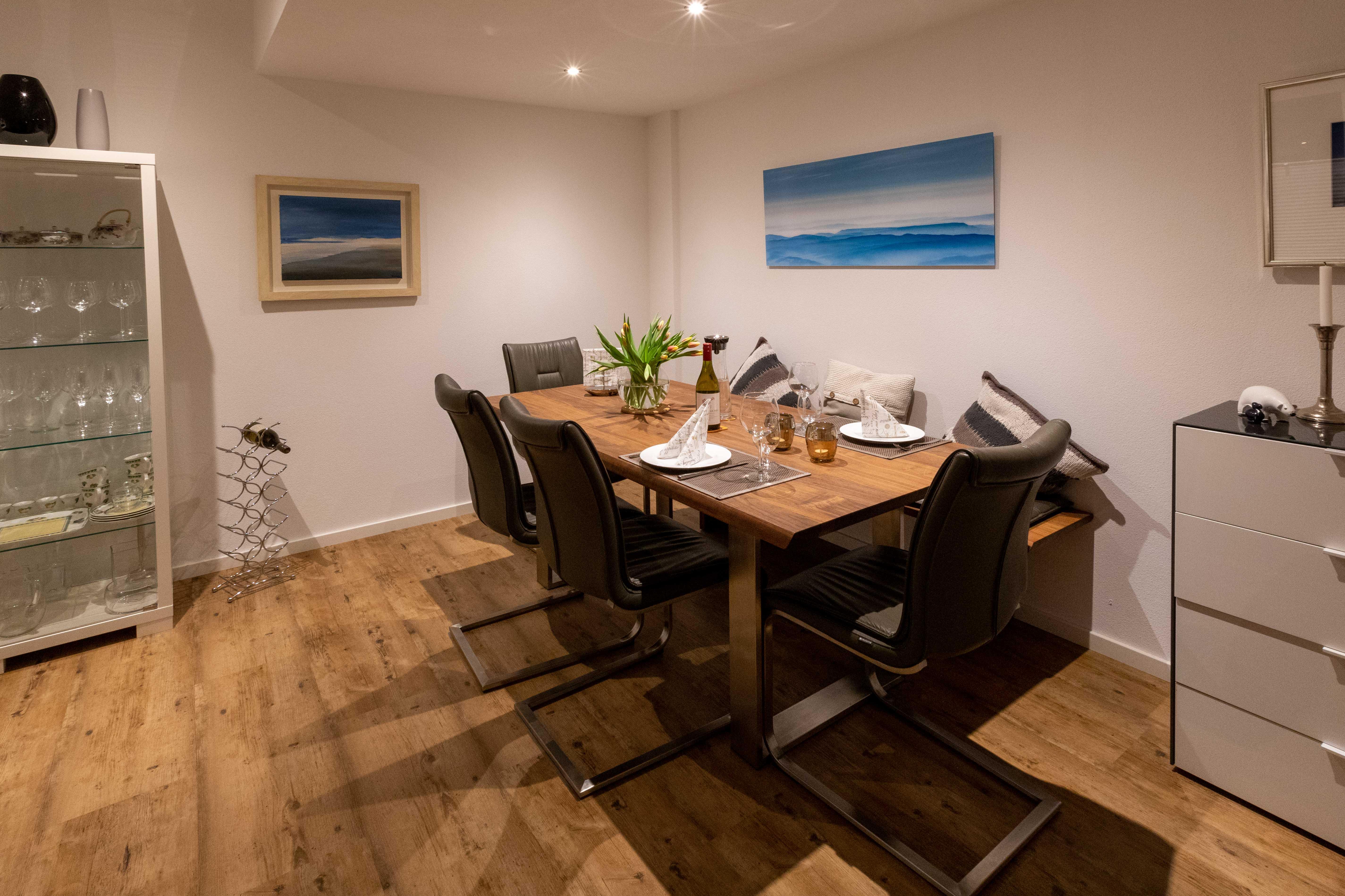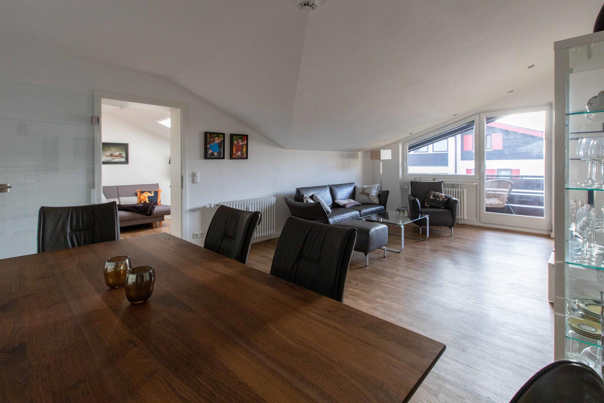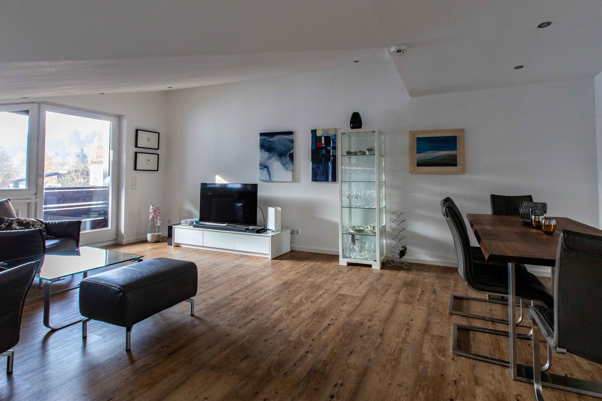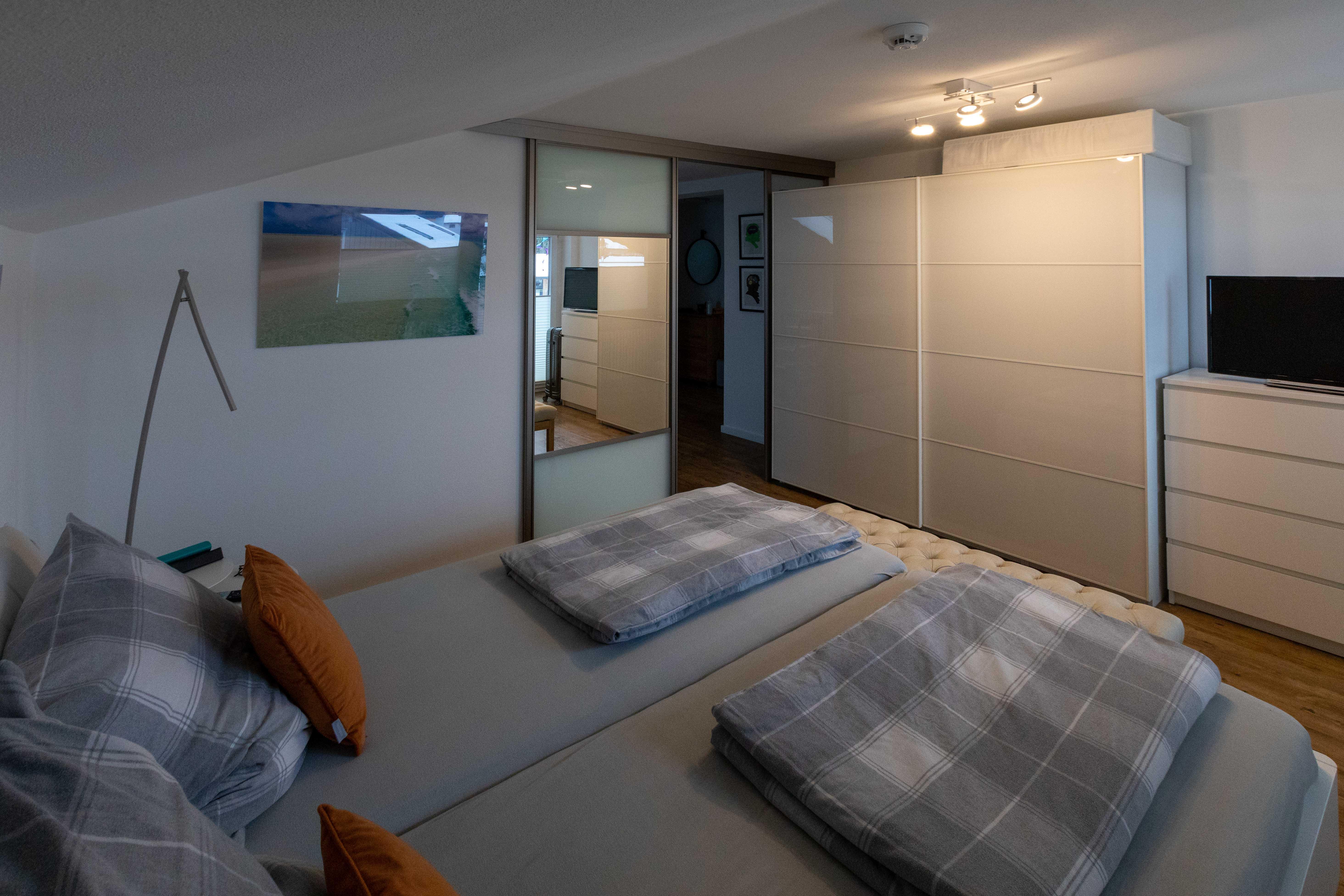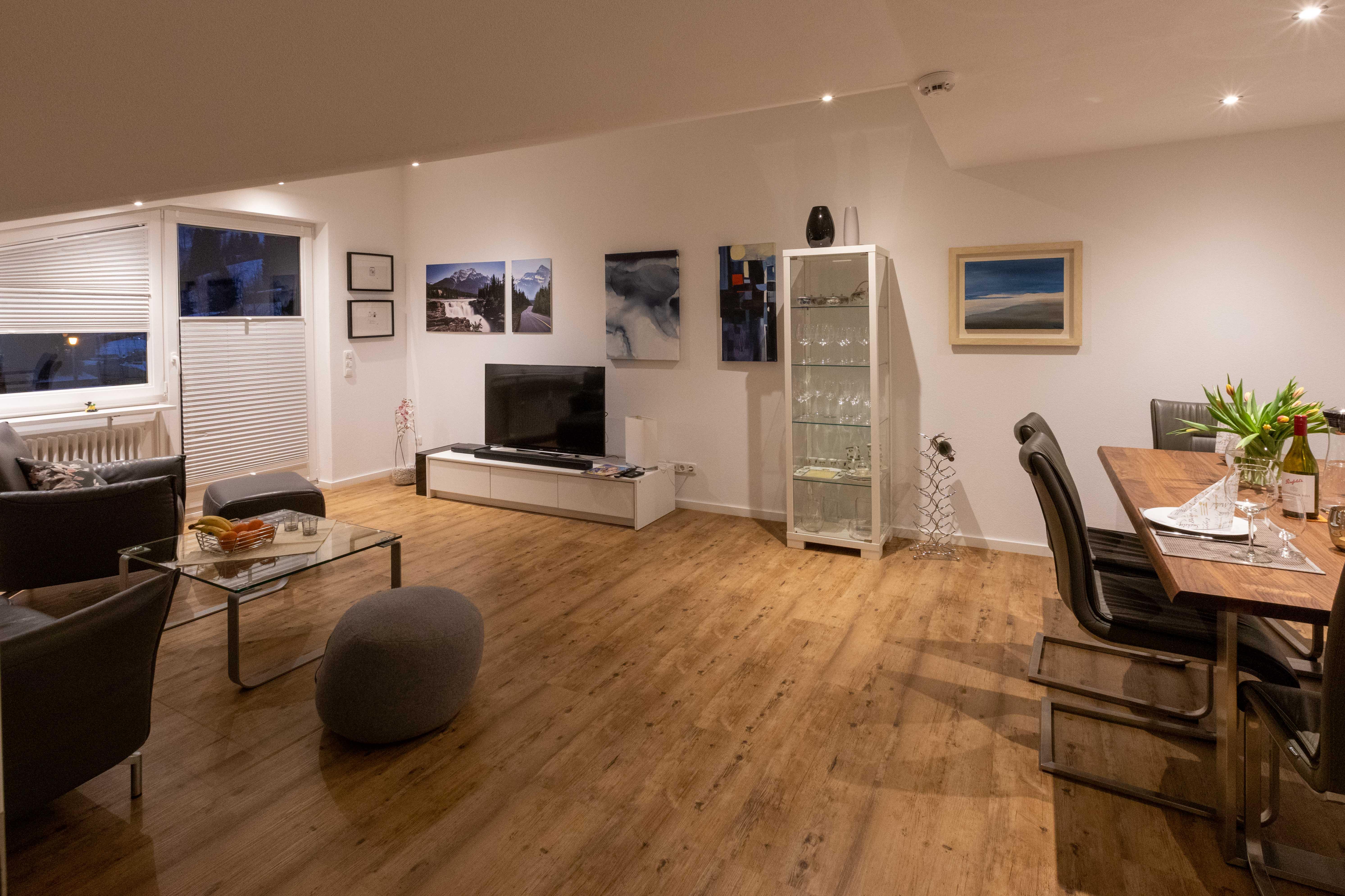 Das hochwertig möblierte Wohnzimmer bietet Entspannung beim Fernsehen oder Musikhören von modernster Technik (TV Soundbar, Blue-Ray-Player.)Besonders gemütlich ist die Essecke, wo Sie auf Lederstühlen oder der Bank am Massivholztisch Platz nehmen. Verschiedene echte Bilder und Grafiken tragen zu dem besonderen Ambiente bei.Vom Wohnzimmer gelangen Sie auf den Südbalkon und können es sich in den Loungesesseln bequem machen. Das Schlafzimmer ist ebenfalls mit bequemen und wertigen Möbeln ausgestattet. Der Kleiderschrank und eine Bank bieten ausreichend Platz für Ihre Garderobe. Hier nutzen Sie den zweiten Flachbildfernseher oder lassen sich von den großen Fotografien für besondere Träume inspirieren. Ein fest installierter Safe steht zur Verfügung.In Schlafzimmer, Küche und Wohnzimmer erlauben Plissees und elektrische Rollläden absolute Privatsphäre. Vom Schlafzimmer und von der Küche gelangen Sie auf den nach Osten gerichteten zweiten Balkon,wo ebenfalls ein Tisch und vier Stühle stehen