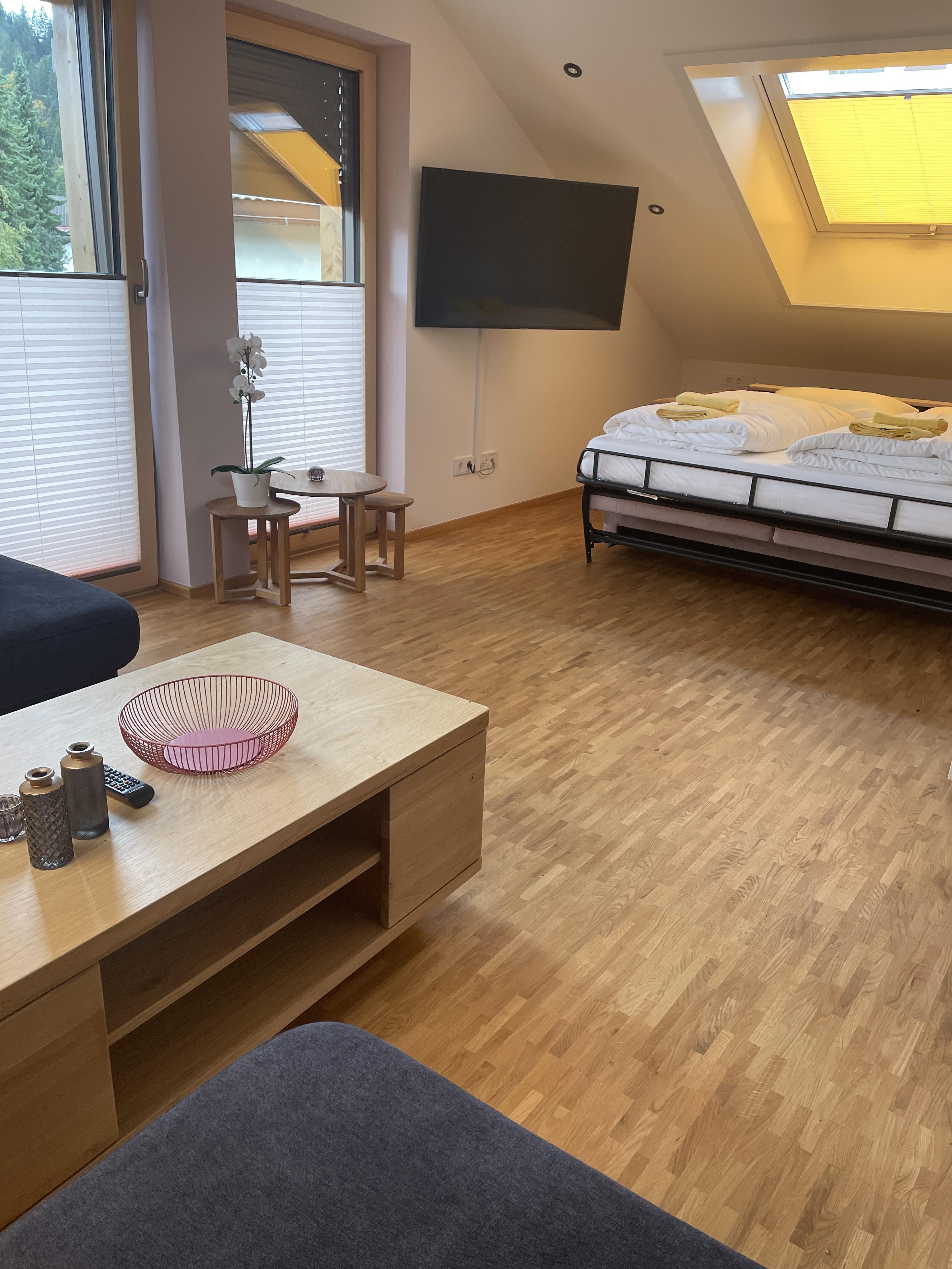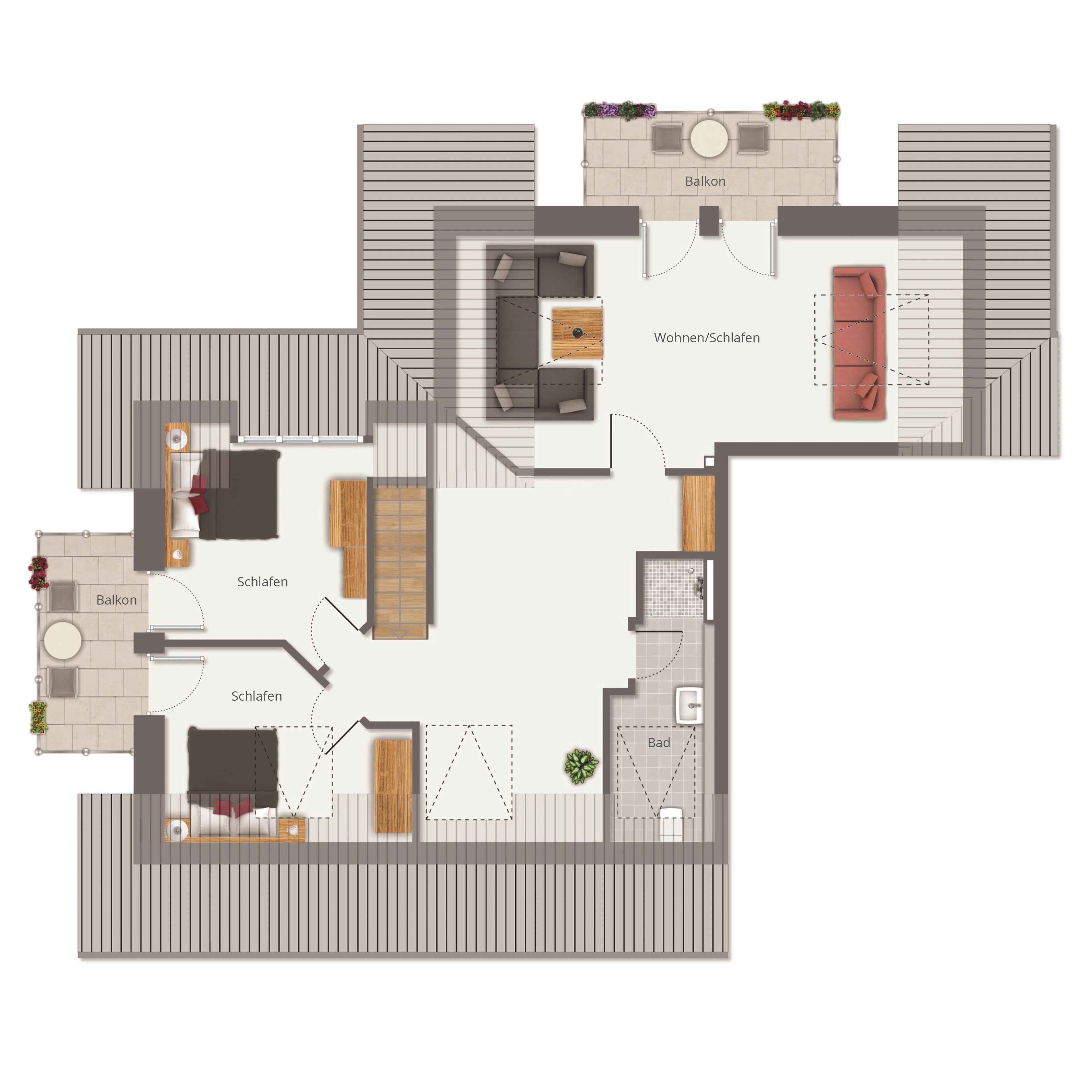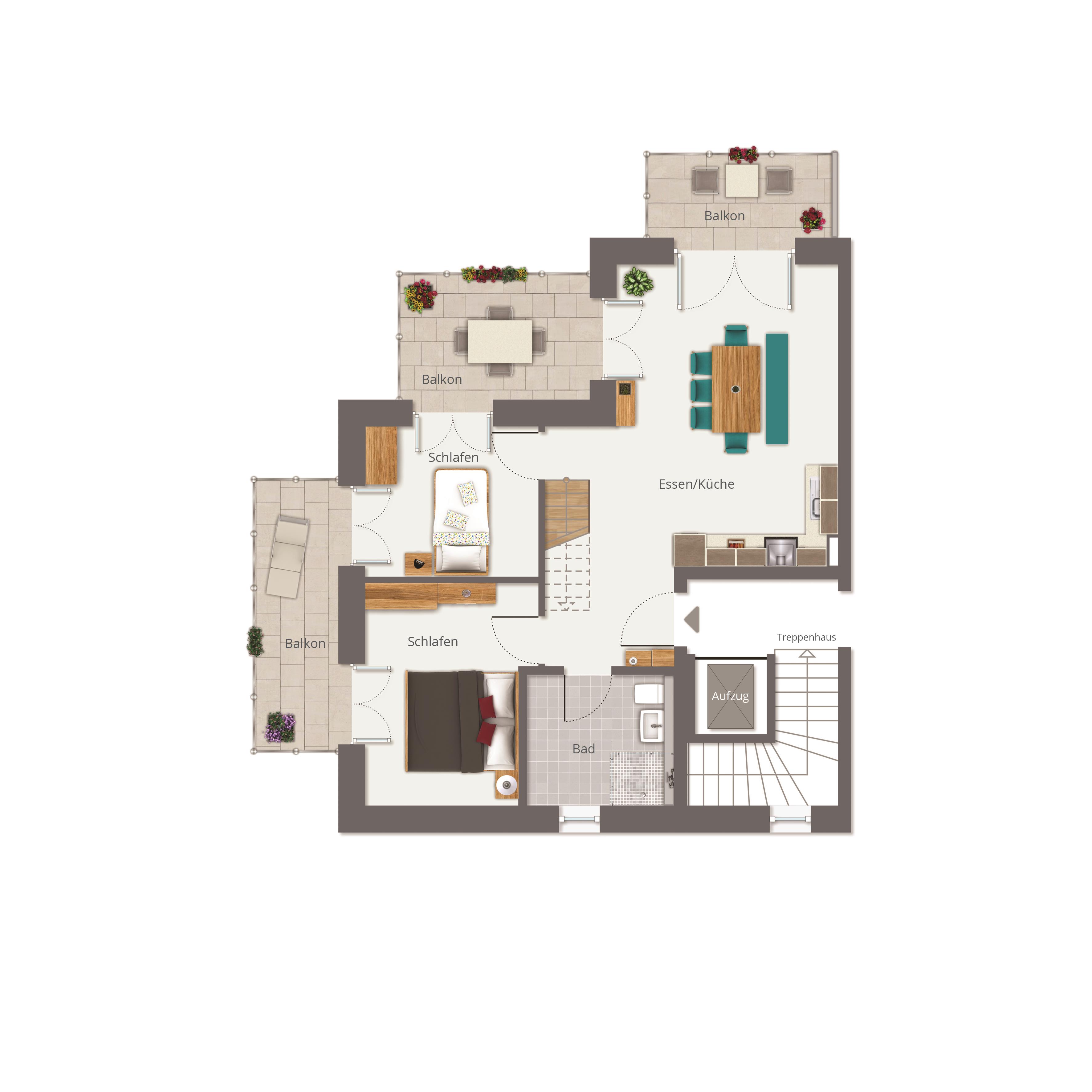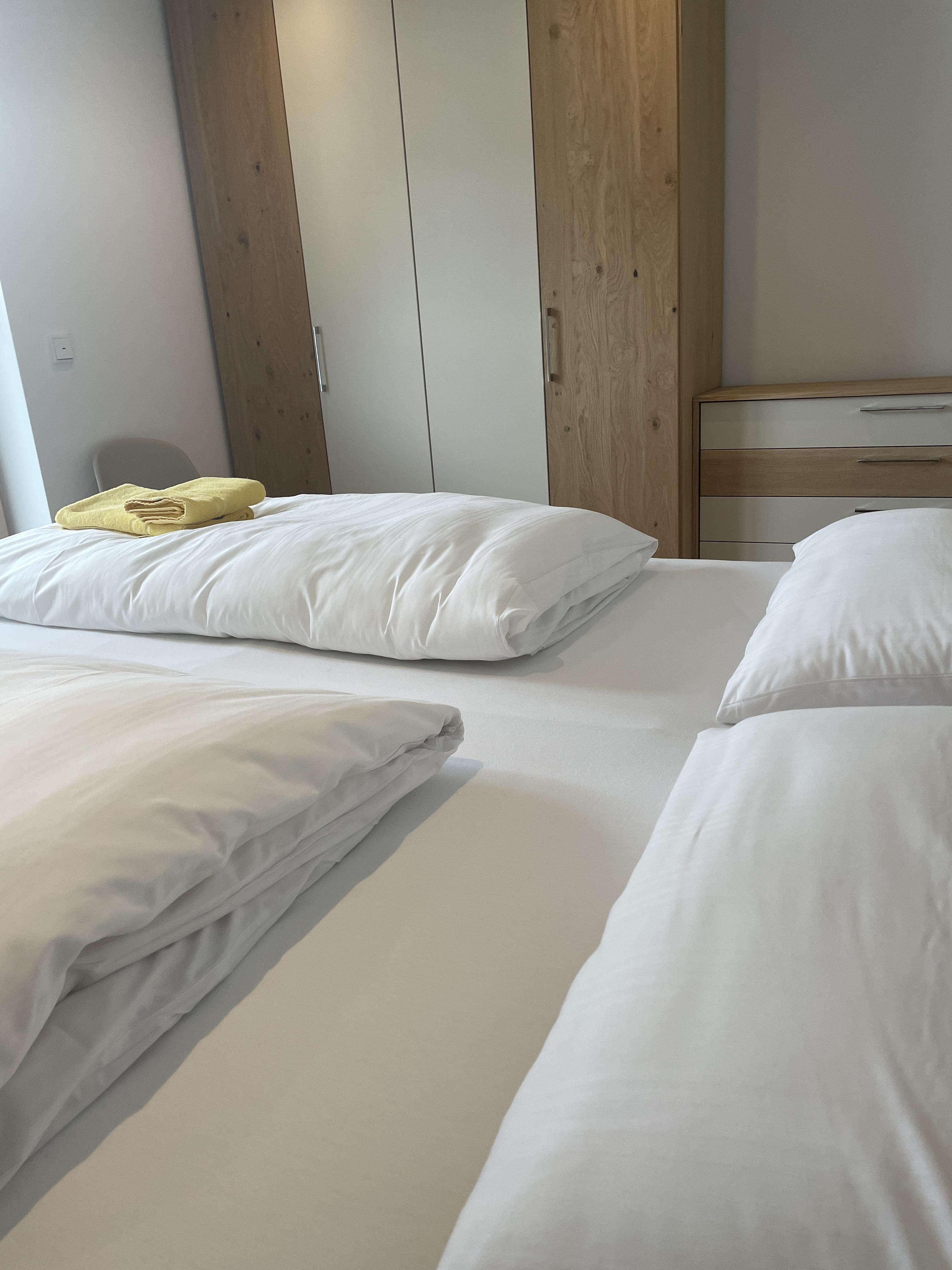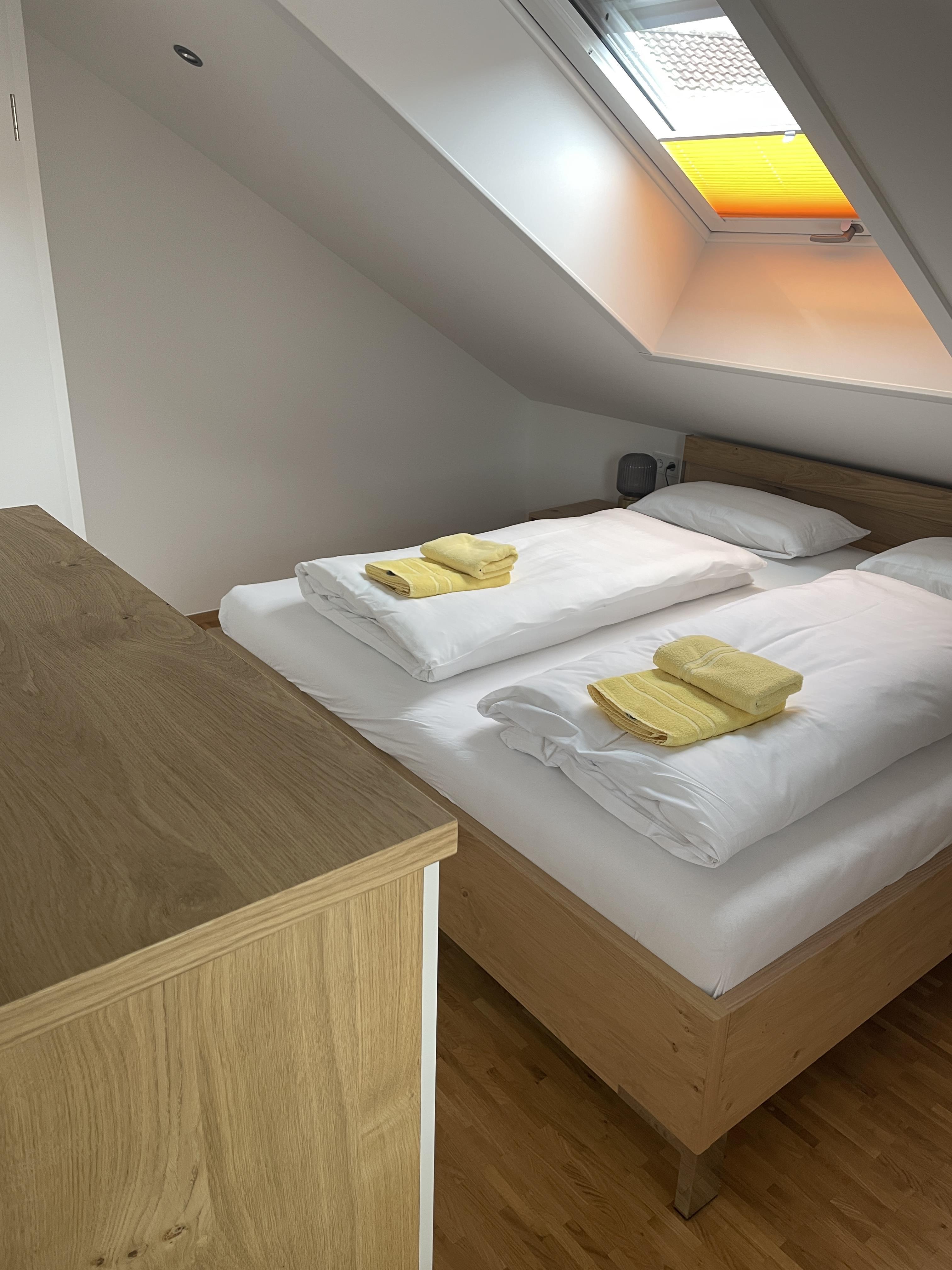Über eine interne Treppe kommt man in das Dachgeschoss dieser Wohnung. Die Wohnung verfügt über 4 Schlafzimmer (3 Schlafzimmer mit Doppelbett, 1 Schlafzimmer mit franz. Bett).