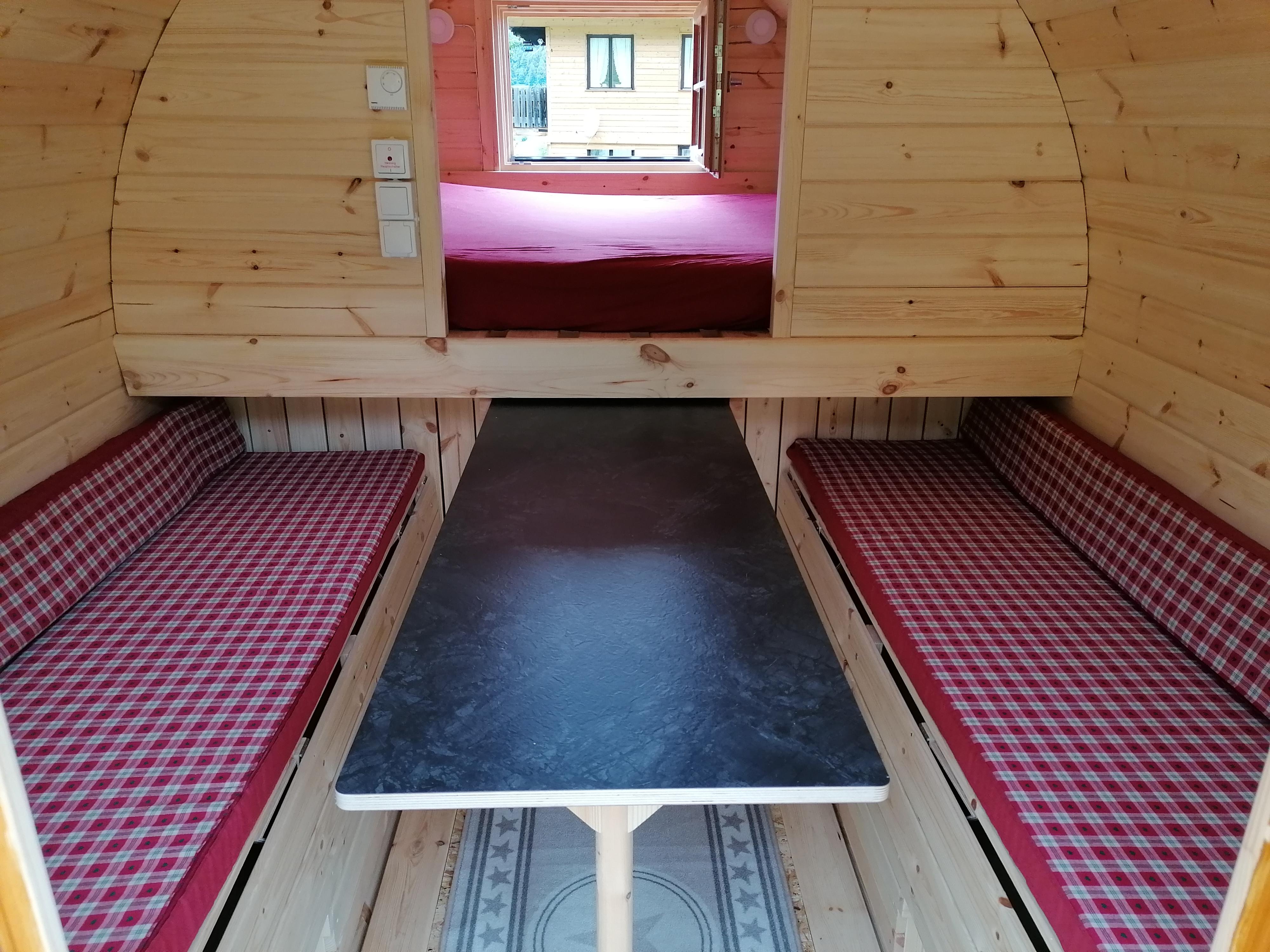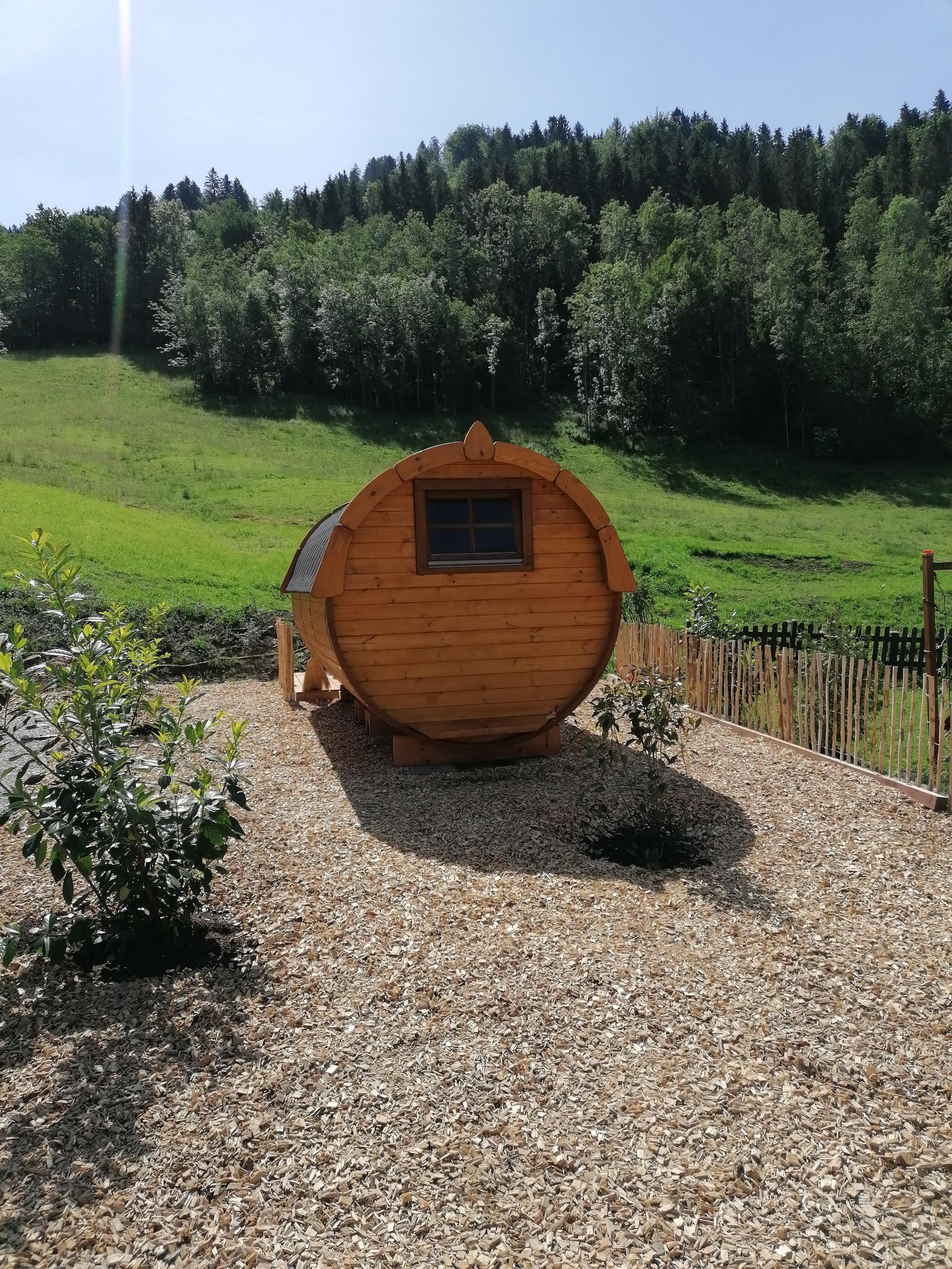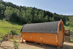 Das rustikale Schlaffass „Wolpertinger“ befindet sich bei Oberstaufen, nahe der österreichischen Grenze auf dem Camping-Aach, und bietet einen fabelhaften Blick auf die Berge. Das Fass verfügt über einen ausziehbaren Tisch mit 6 Sitzplätzen, ein 200x200cm großes Familienbett, sowie zwei Wandelbetten mit einer Größe 210x70 cm.