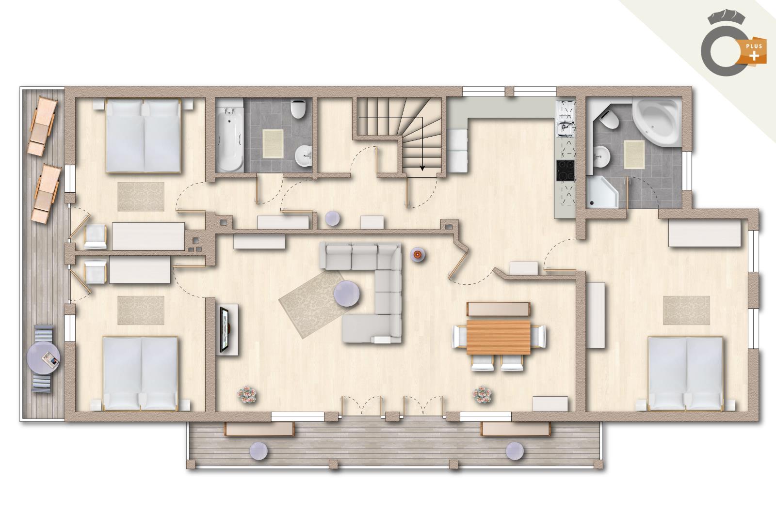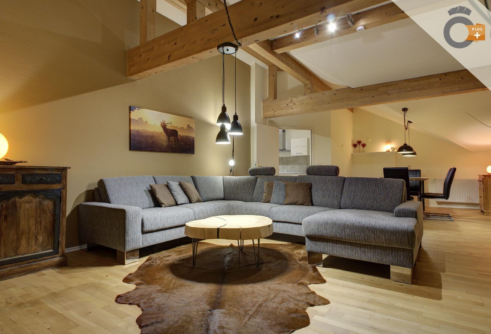 Ideal für Gruppen- und Mehrgenerationen-Urlaub! Die sehr großzügig geschnittene und helle Ferienwohnung erstreckt sich auf ca. 160qm über das gesamte Dachgeschoss des Mehrfamilienhauses.
