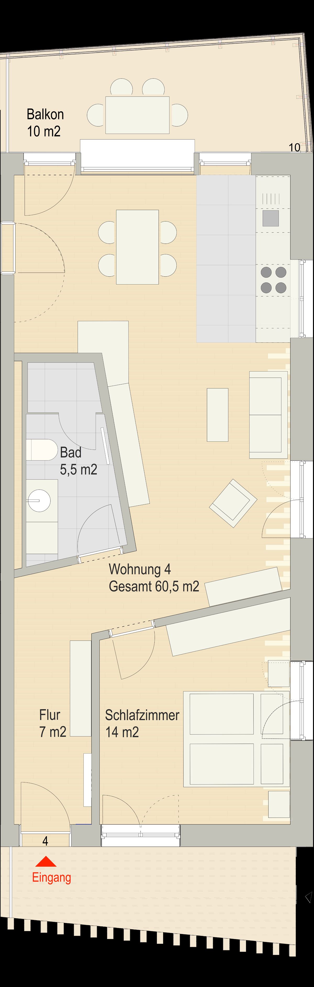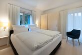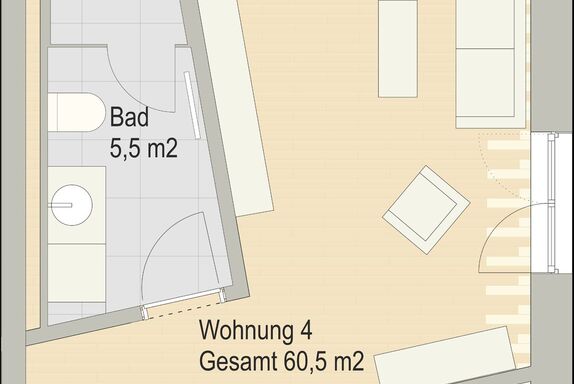 Unsere 65qm große Wohnung mit überdachtem Südbalkon und Westfensterfront ist ausgestattet mit einem Schlafzimmer mit hochwertigem Boxspringbett von 180x200cm. Sie hat eine offene Wohnküche, ein gemütliches Wohnzimmer und ein modernes Badezimmer.