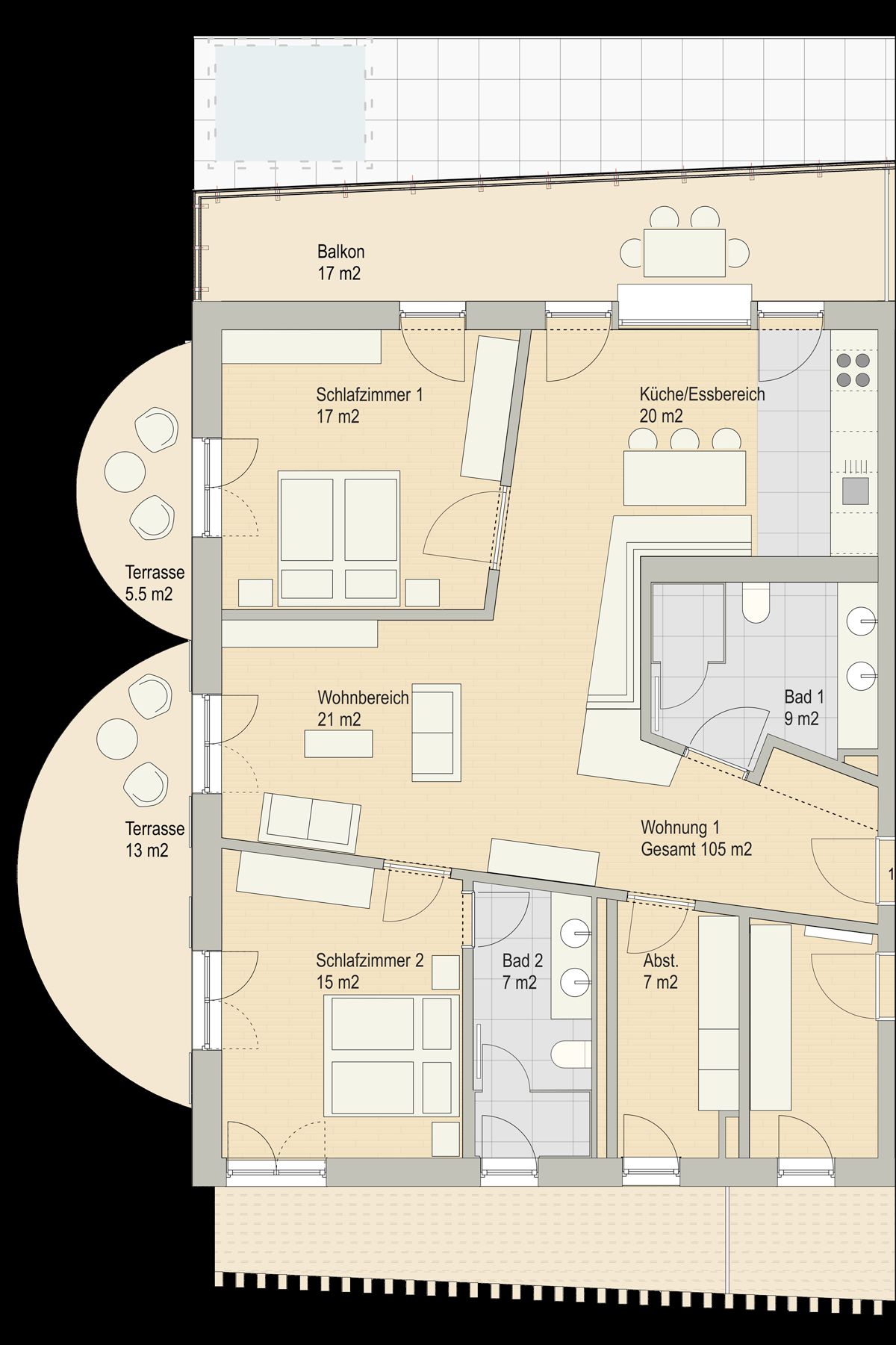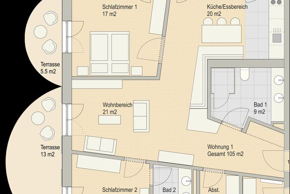 Unsere 110 qm große Wohnung 1 befindet sich im Erdgeschoss mit überdachten Südbalkon und eigenem eingezäunten Garten mit Ostterrasse, wo Sie Ihr Frühstück in der Morgensonne genießen können. Die Wohnung hat zwei Schlafzimmer mit hochwertigen Boxspringbetten und Fernseher. Ein Schlafzimmer hat ein 180x200cm großes Bett das andere ein 180x220cm großes Bett. Es gibt einen großzügigen Ess- und Wohnbereich, einen Infrarotofen mit Ofenbank, zwei Bäder und eine voll ausgestattete Küche.