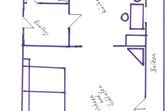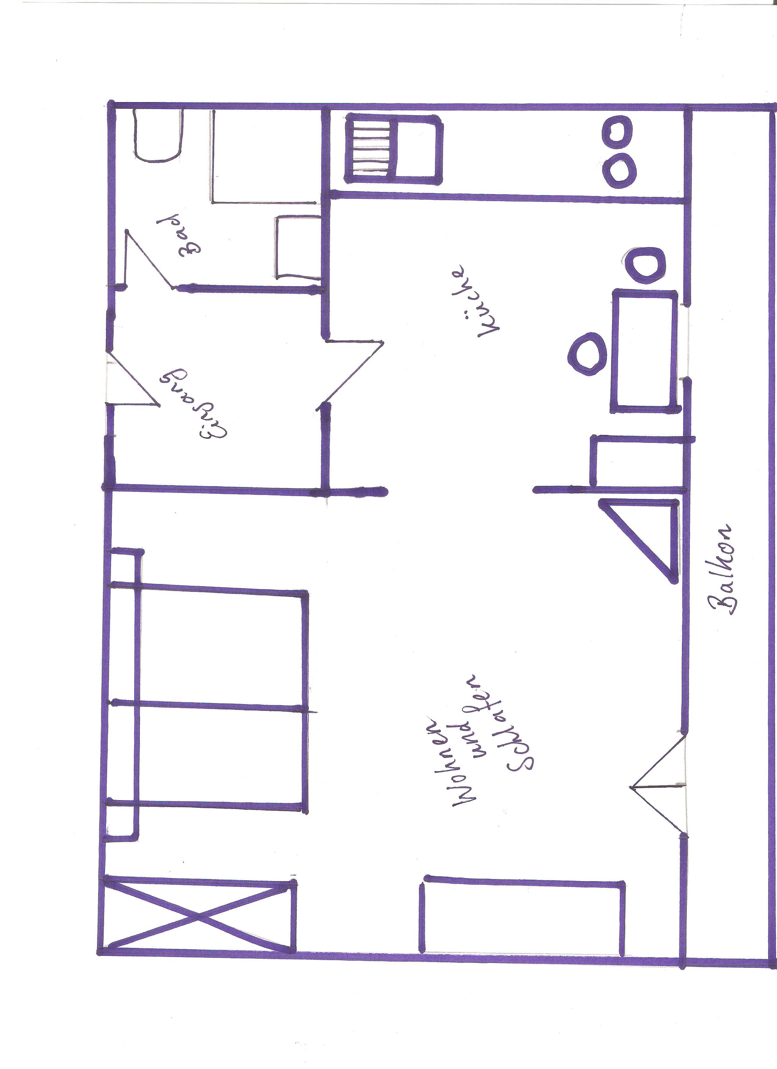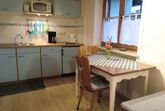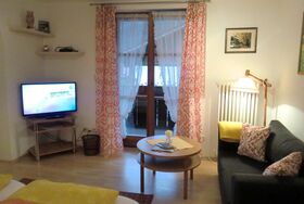 Couch, TV mit DVD player, Wohn-Küche mit Essecke, Dusche und WC und großer Südbalkon.