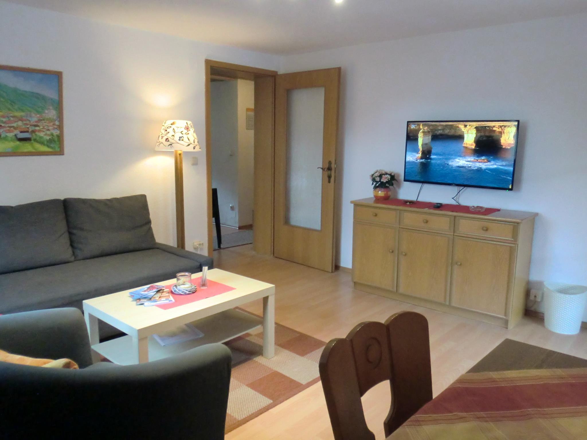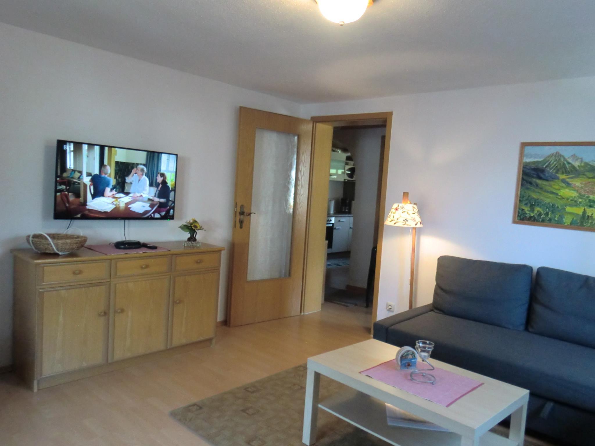 Separates Schlafzimmer mit Doppellbett, Wohnzimmer mit Schlafsofa und Wand TV für gemütliche Abende. Essecke in Wohnzimmer