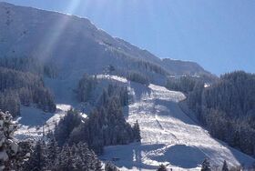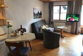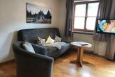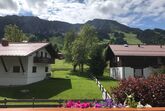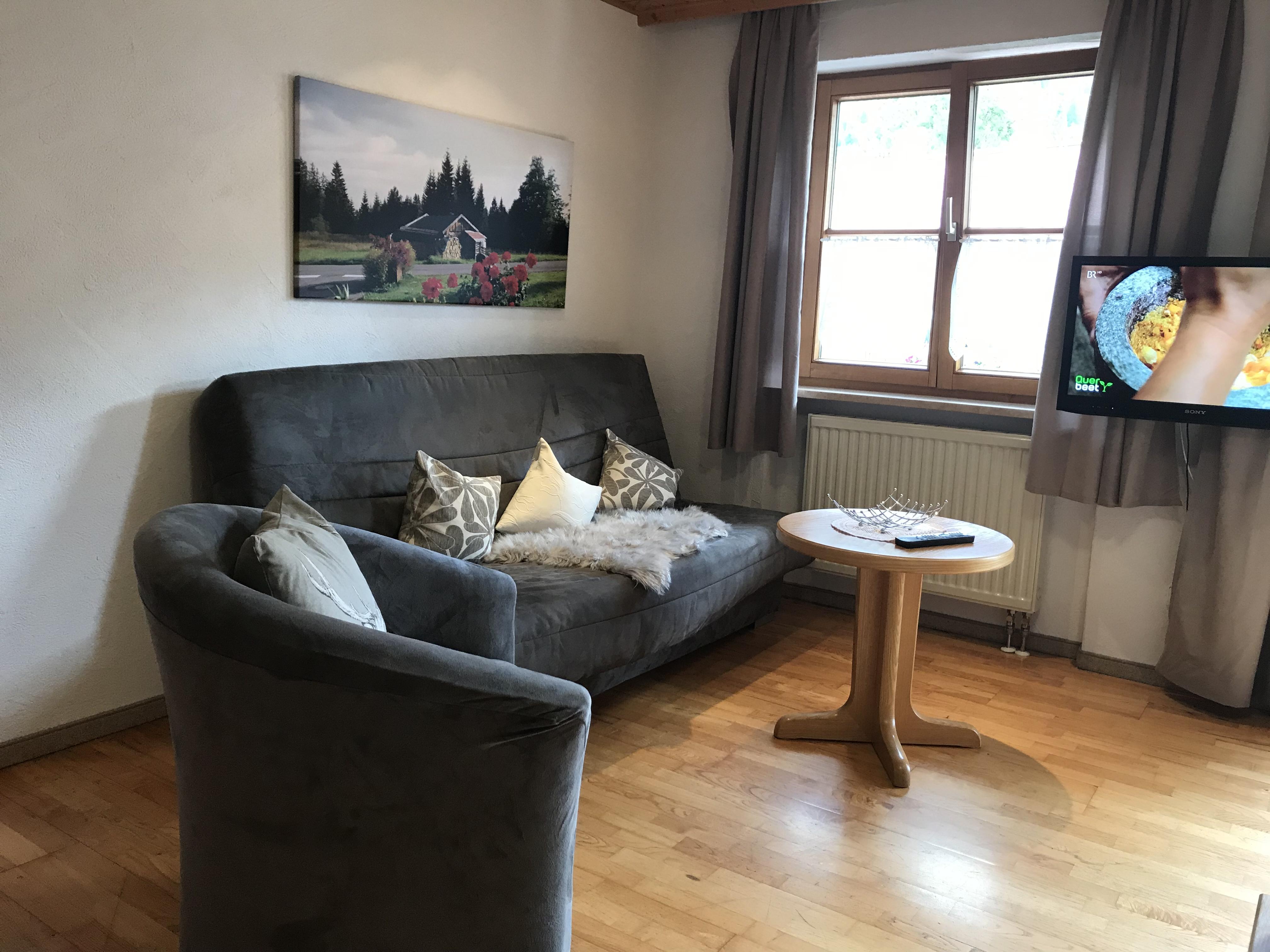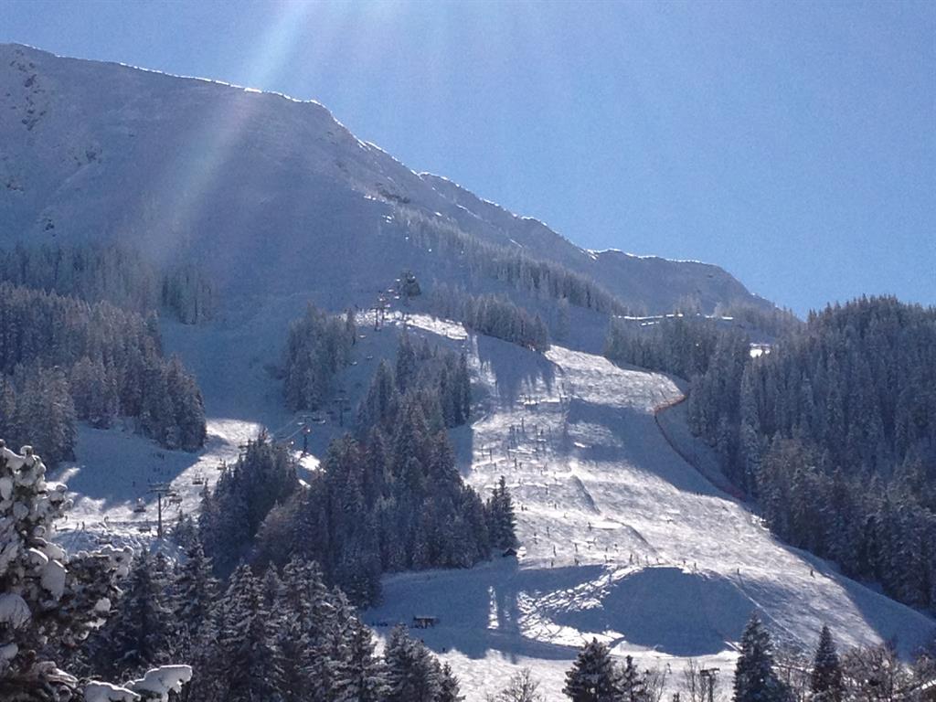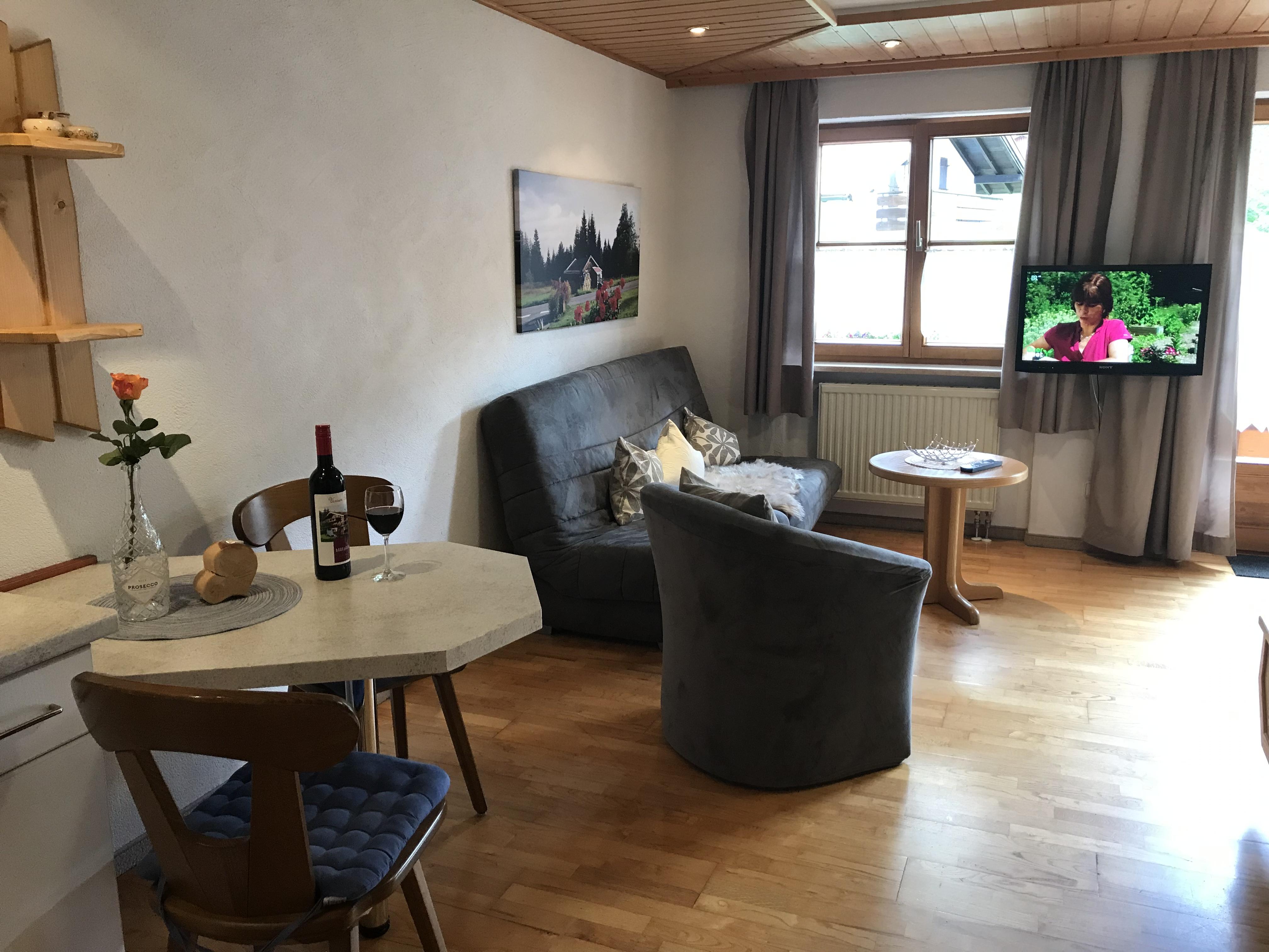 LCD Fernseher , Safe , möblierter Balkon mit Blick zum Hausberg Iseler und Skipiste .