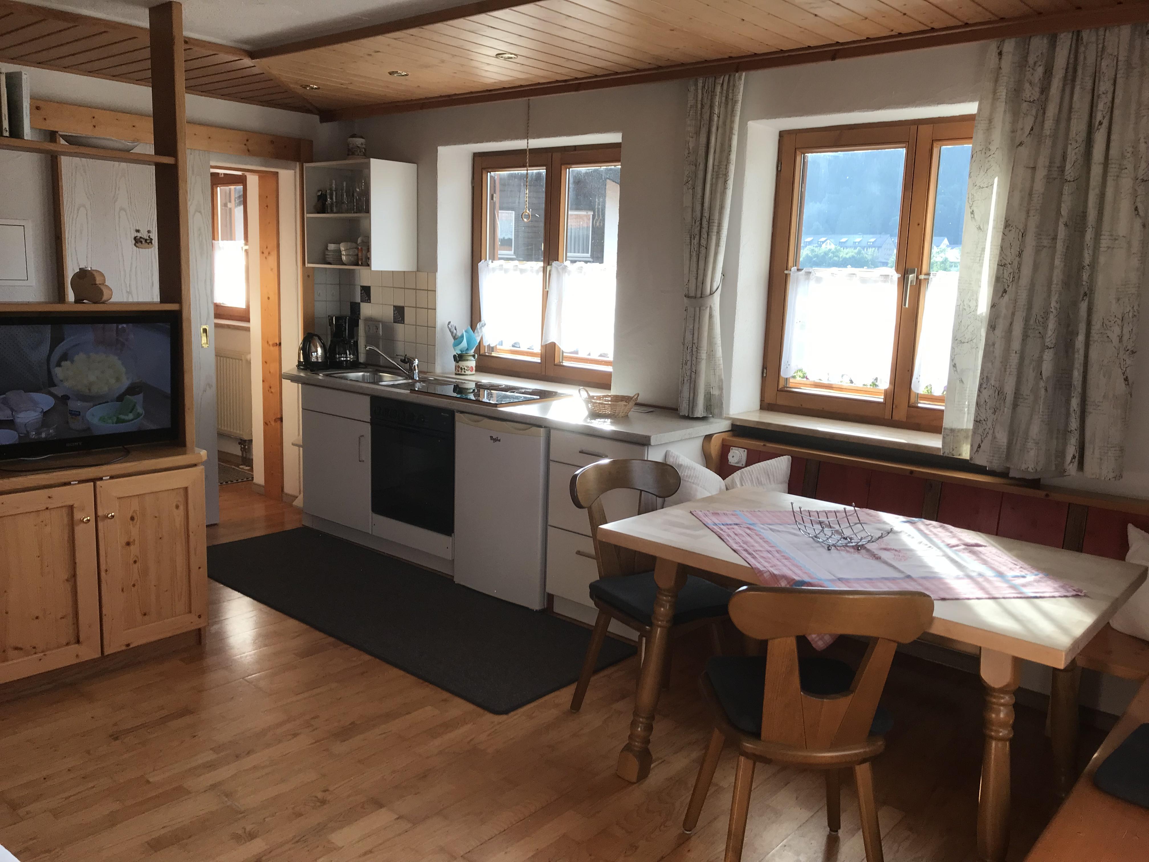 Küchenzeile mit Geschirrspüler, Backofen, Micro auf Anfrage, Wasserkocher, Kaffeemaschine, Toaster, gemütliche Eckbank . Dusche WC , Handtücher und Föhn.