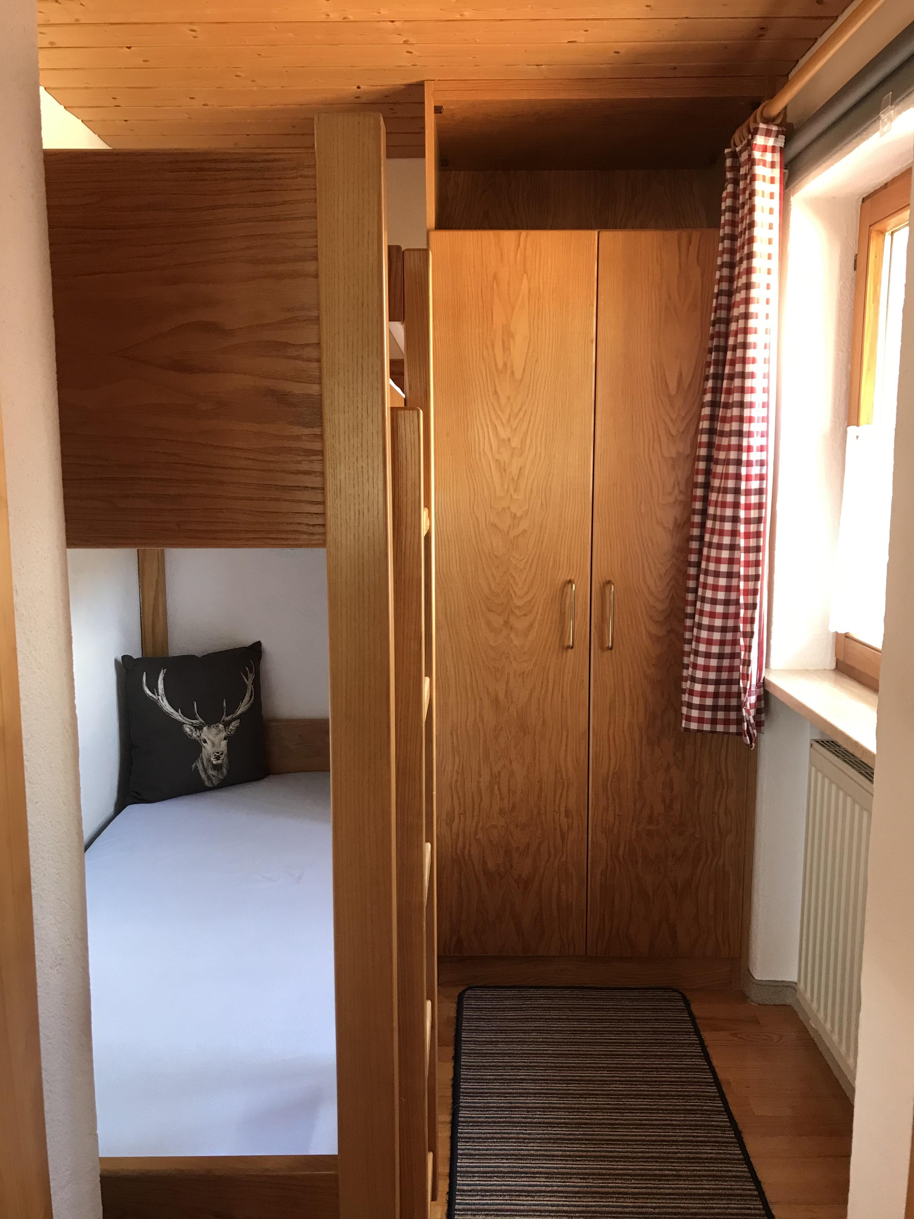 Kinderzimmer mit Stockbetten, großes Elternschlafzimmer mit Komfortbetten,Sitzhöhe 0,45m offenes Fußende mit der möglichkeit ein 3-Bett aufzustellen. Dusche , WC , Handtücher und Föhn