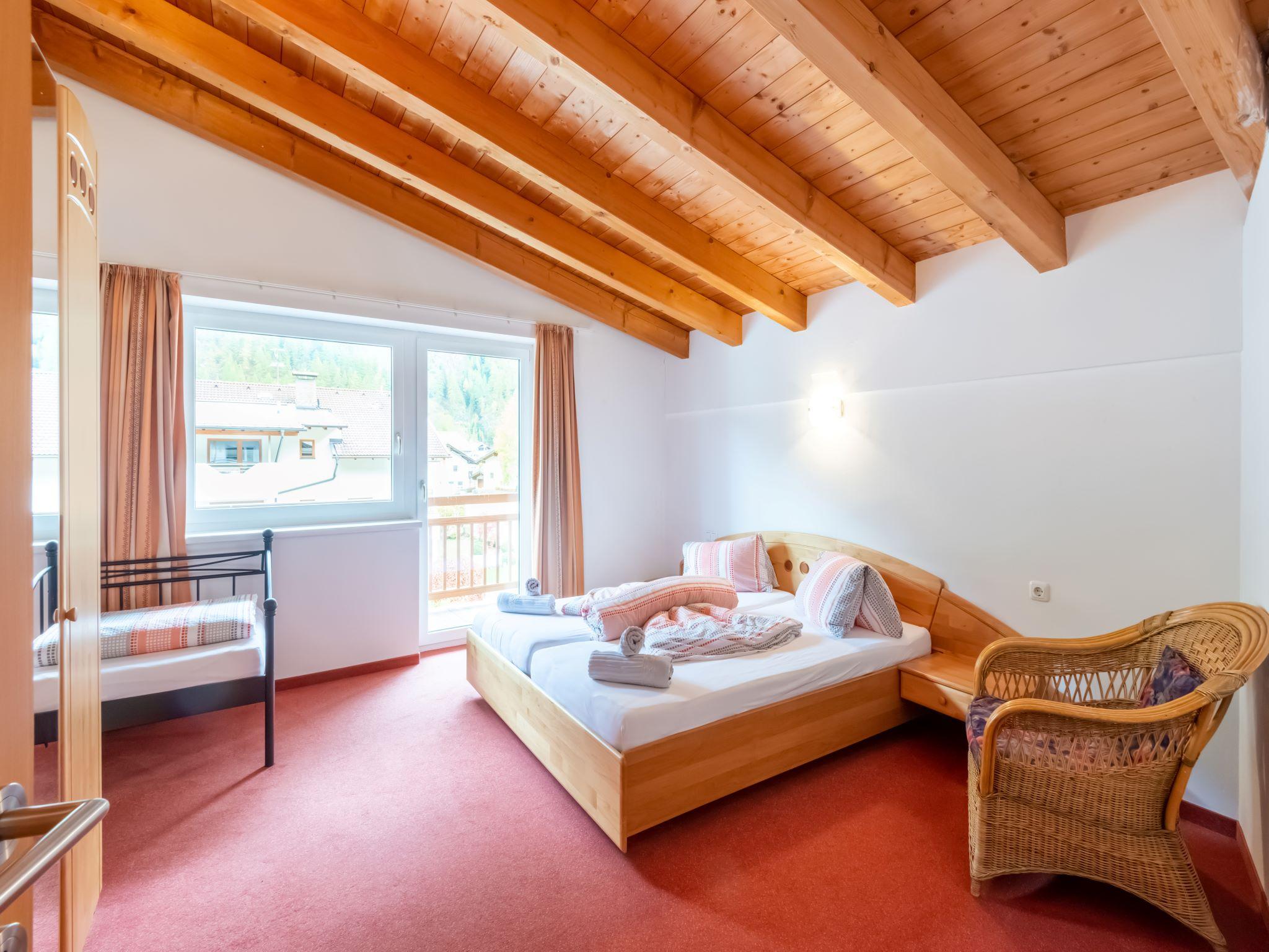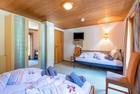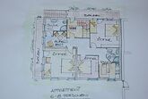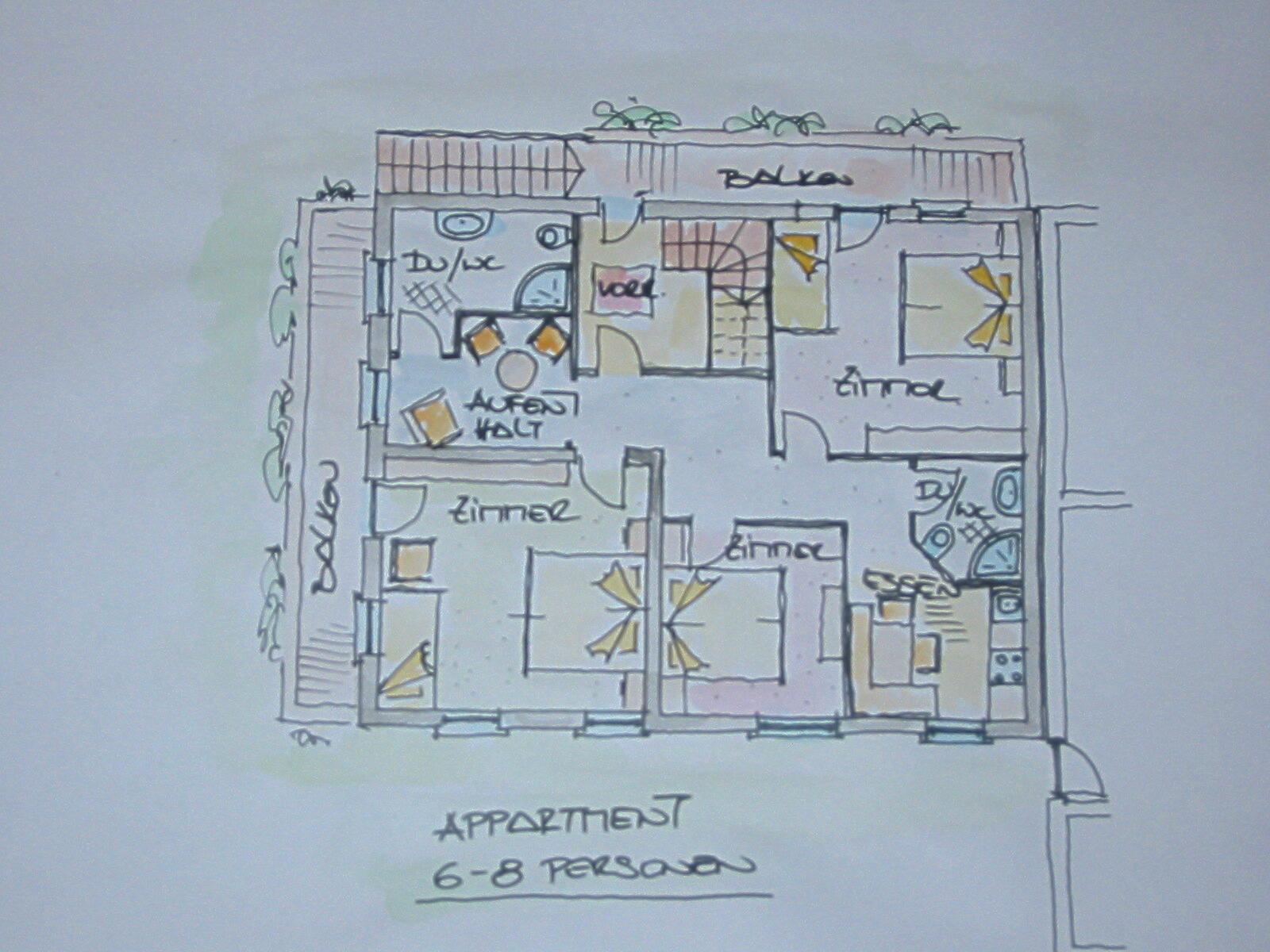 2 Dreibettzimmer, 1 Doppelzimmer, 2 Dusche/WC, 1 Küche. Die Wohnung befindet sich im Altbau.