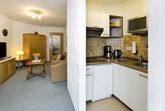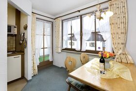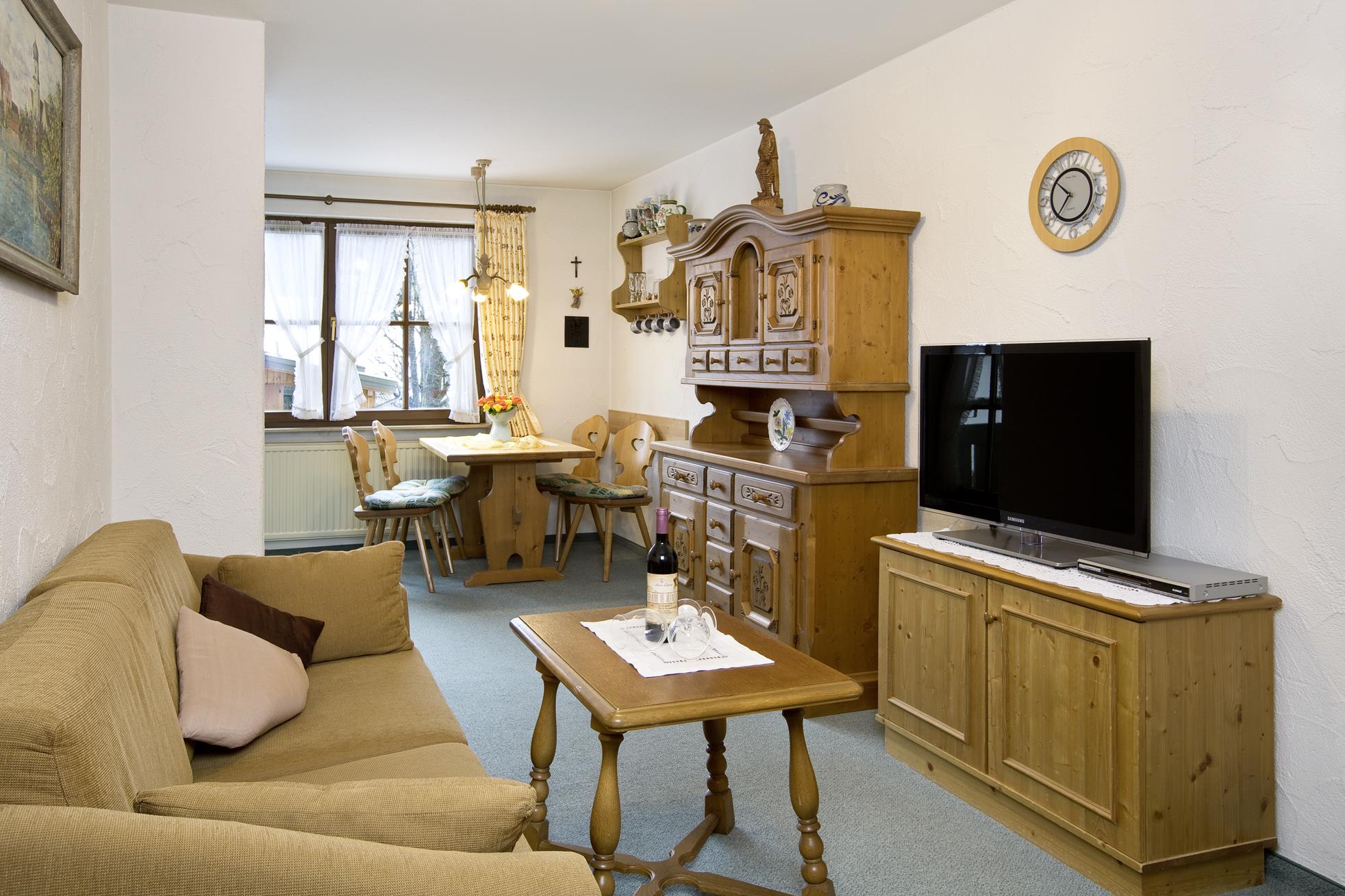 Gemütliches, im Landhausstil eingerichtetes Wohn-, Esszimmer mit Esstisch für 4 Pers. und Vogelauer Kredenz mit guter Geschirrausstattung und vielen Schubladen, Bettcouch (2 einzeln ausziehbare Betten) bieten guten Wohnkomfort. Vom Wohn- und separaten Schlafzimmer Zugang zum überdachten und möblierten Südbalkon.