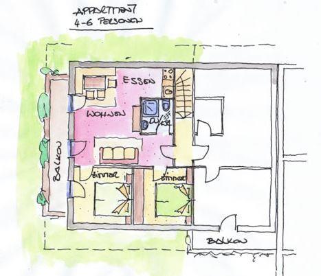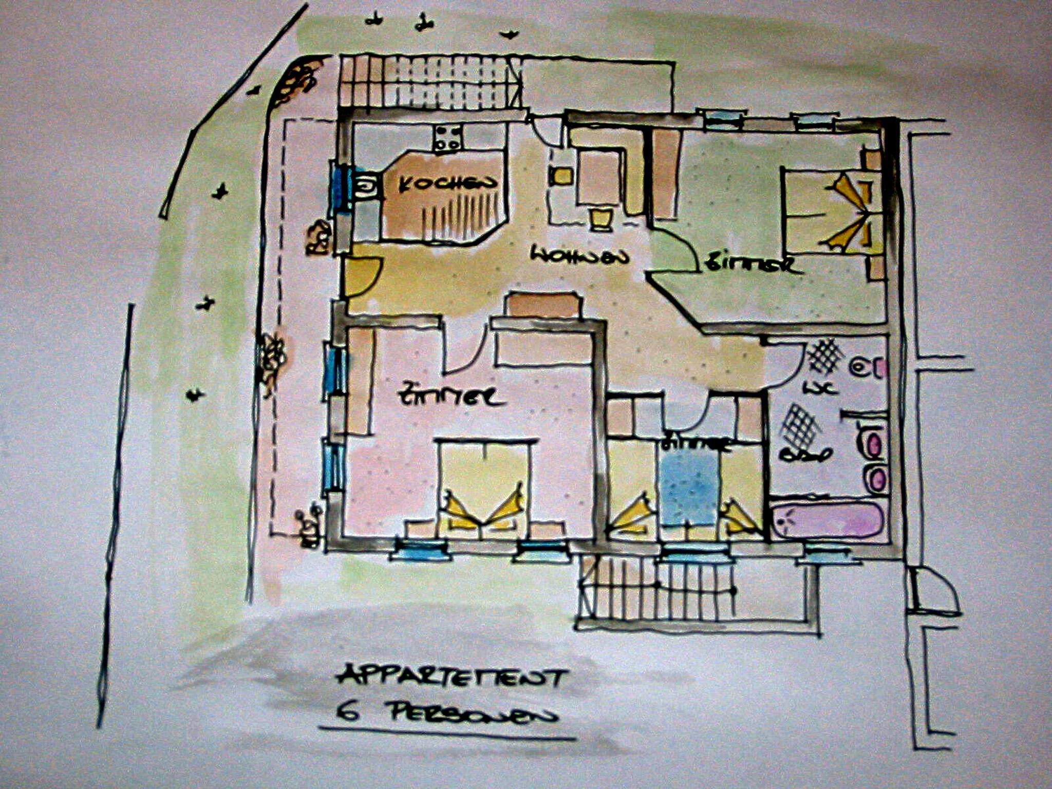 2 Schlafzimmer, 1 Bad/WC, 1 Küche, 1 Wohn-Schlafraum. Die Wohnung befindet sich im Altbau.