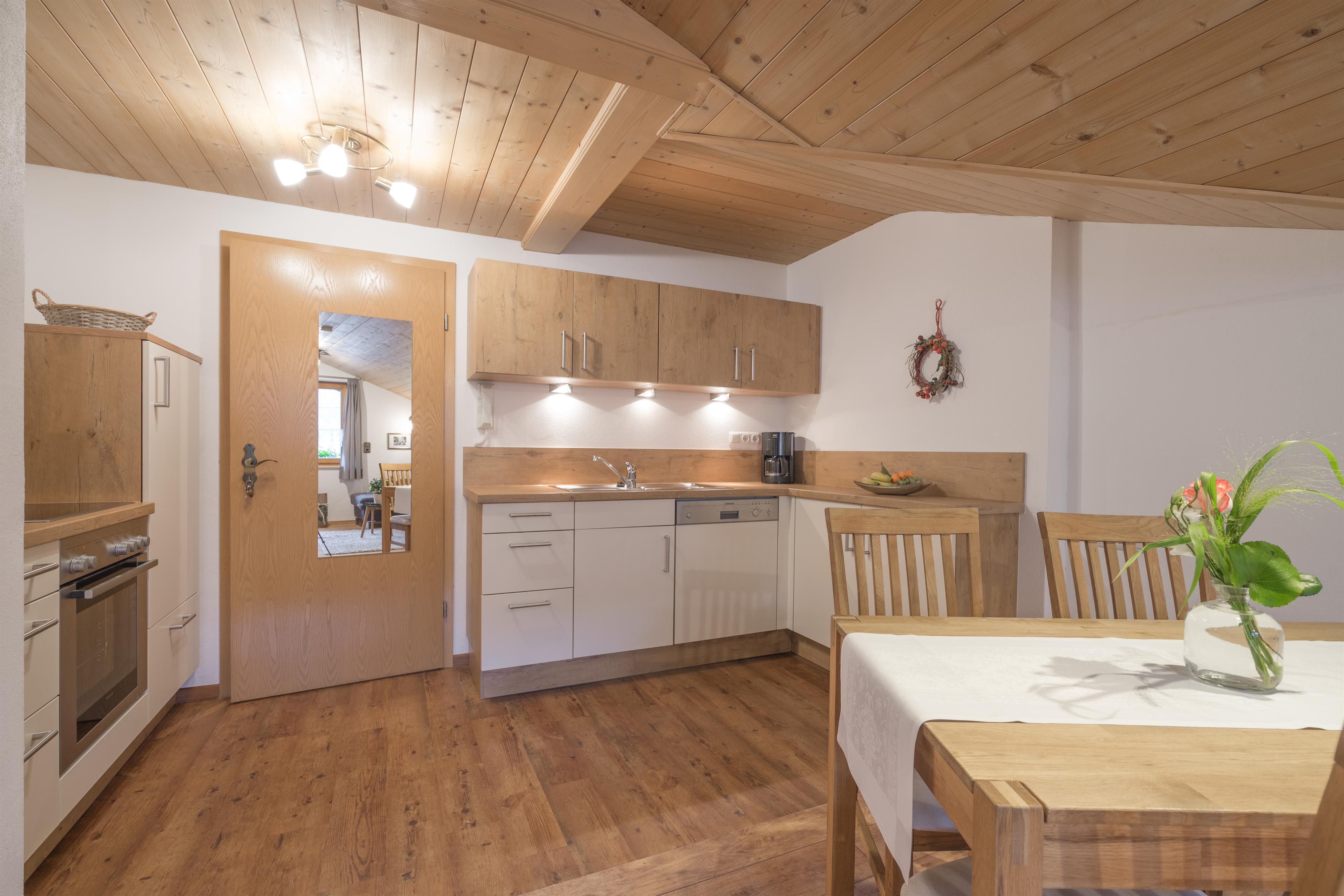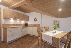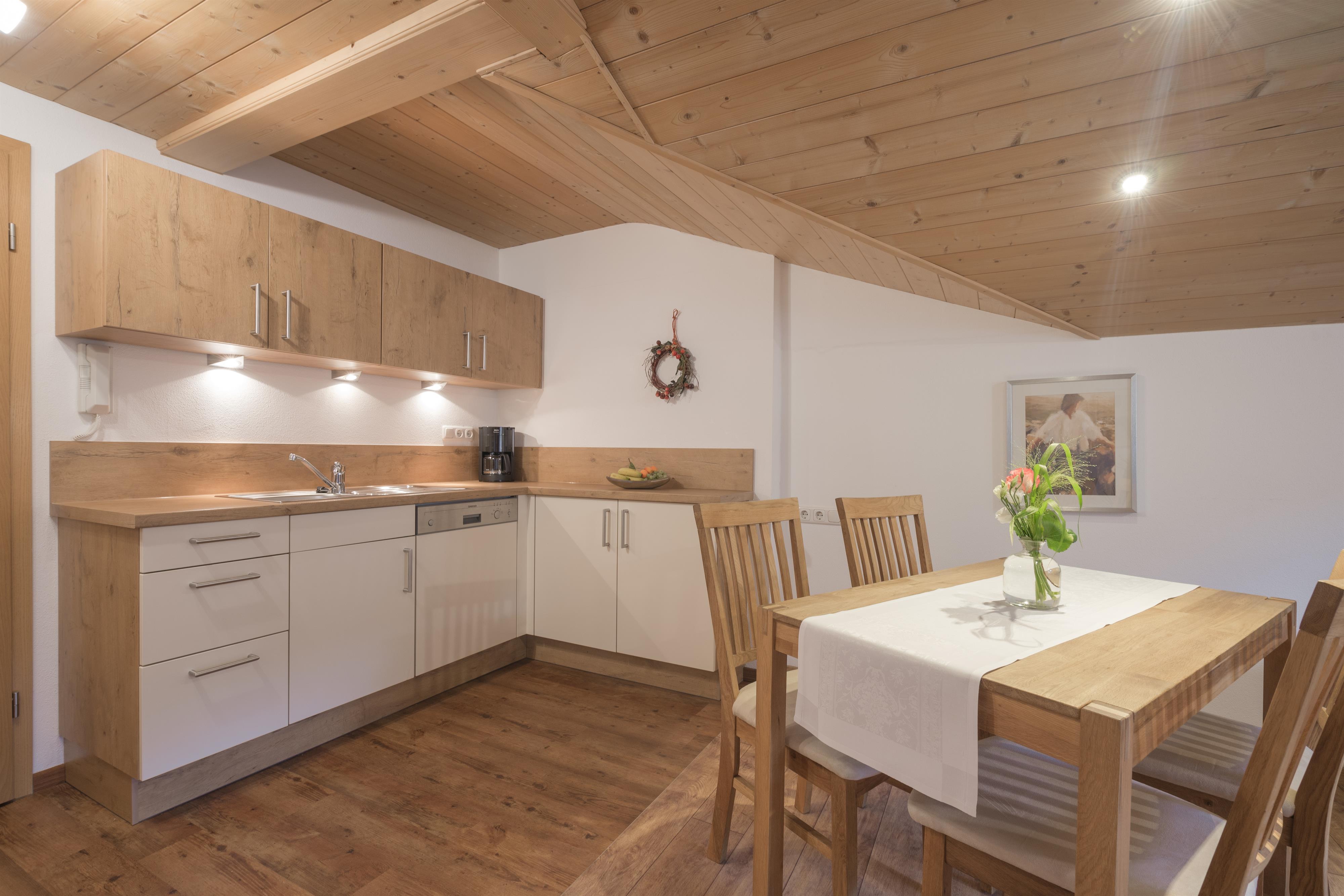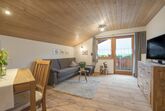 Ferienwohnung Hochvogel-Stube (55m² - für 2 Personen) - Wohnzimmer mit SAT-TV und Radio - 1 sep. Schlafraum, Wecker - Küchenzeile komplett ausgestattet mit Backofen und Geschirrspüler - Dusche, WC, Fön und Kosmetikspiegel - Südbalkon mit Sitzecke und Relaxliege.