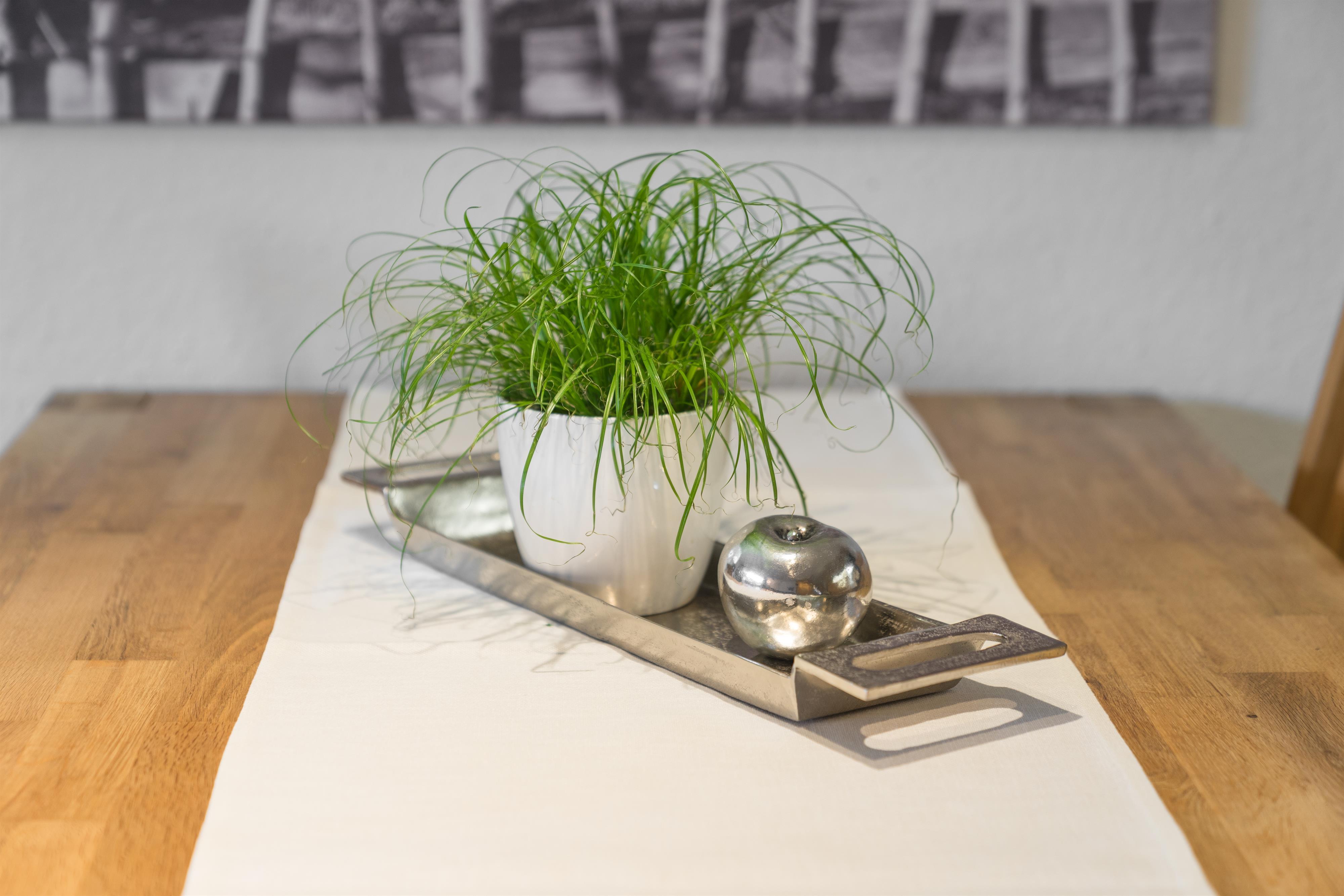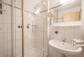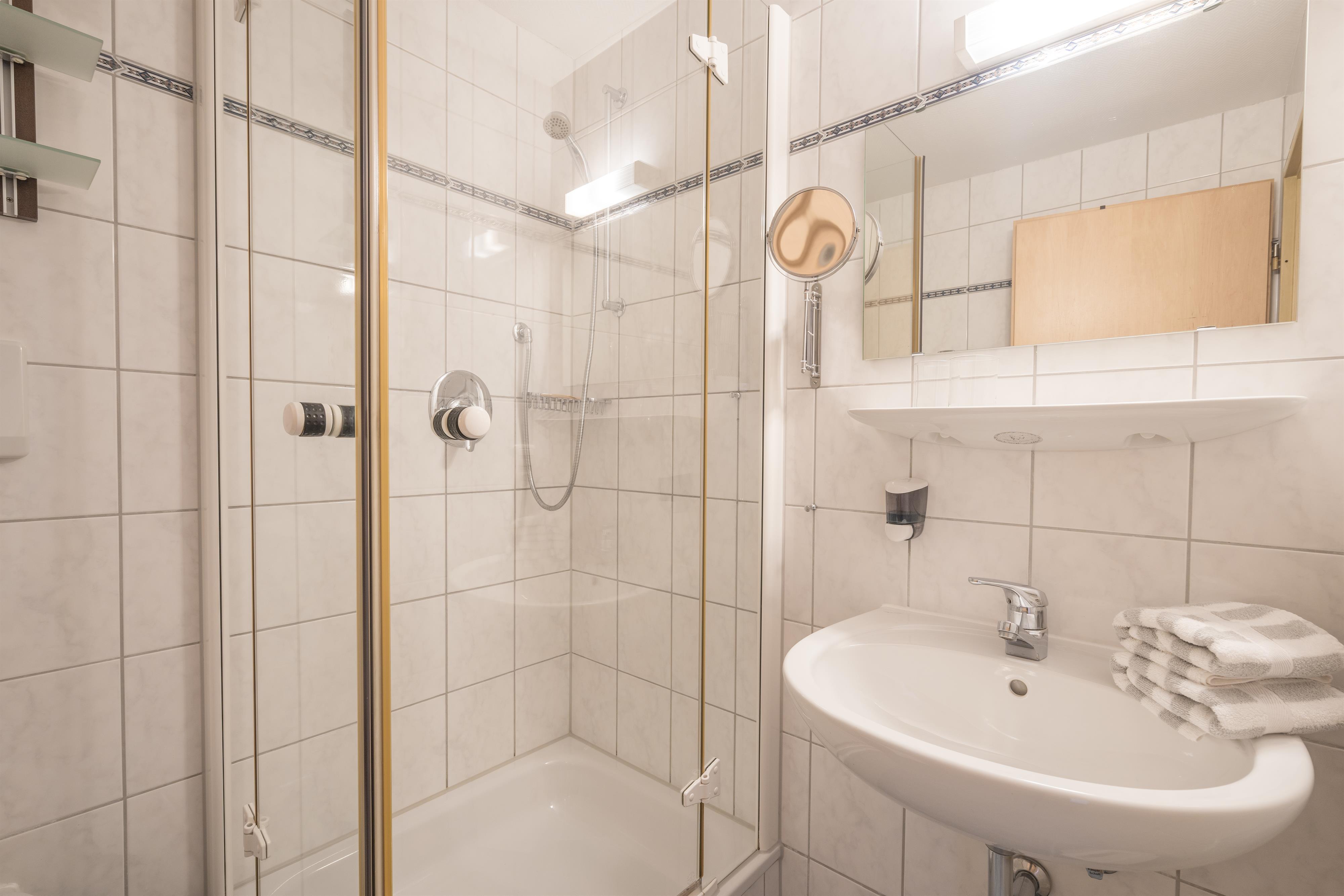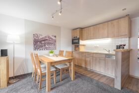 Ferienwohnung Rotspitz-Stube - Wohnraum mit Küchenzeile (Spülmaschine, Backofen, Toaster etc.) u. SAT-TV, Radio - 1 sep. Schlafzimmer, Wecker - Dusche / WC mit Fön und Kosmetikspiegel - Flur, Zimmersafe - Süd- u. Westbalkon mit Sitzecke und Relaxliege.