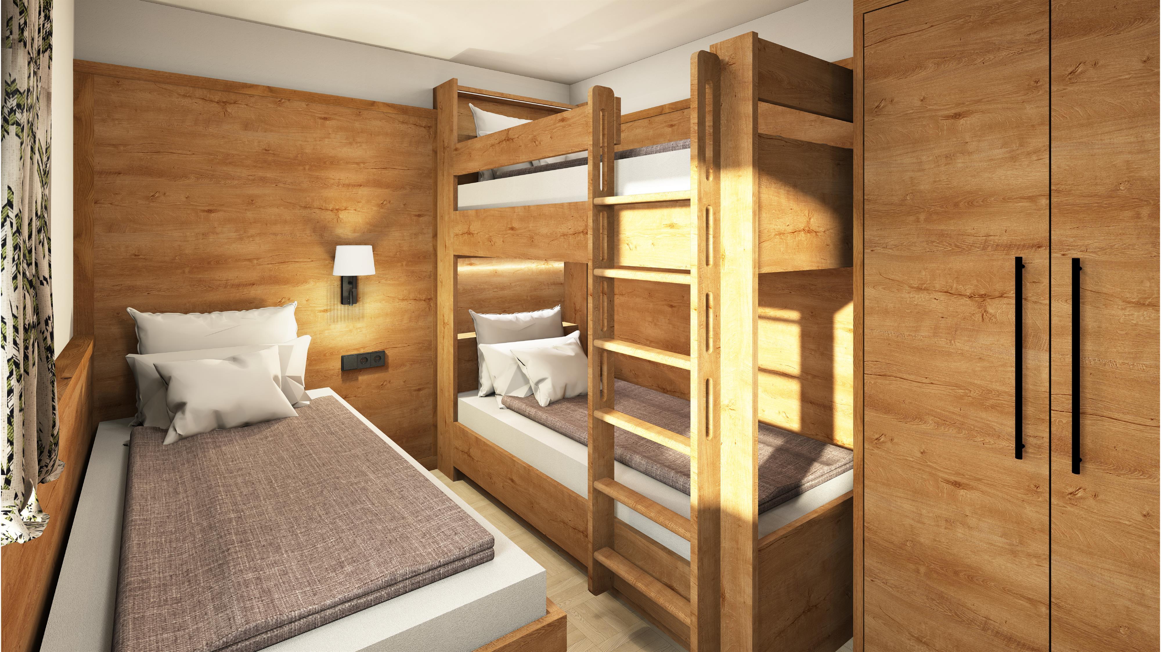 zwei getrennte Schlafzimmer, einmal Doppelbett, einmal 3 Betten,