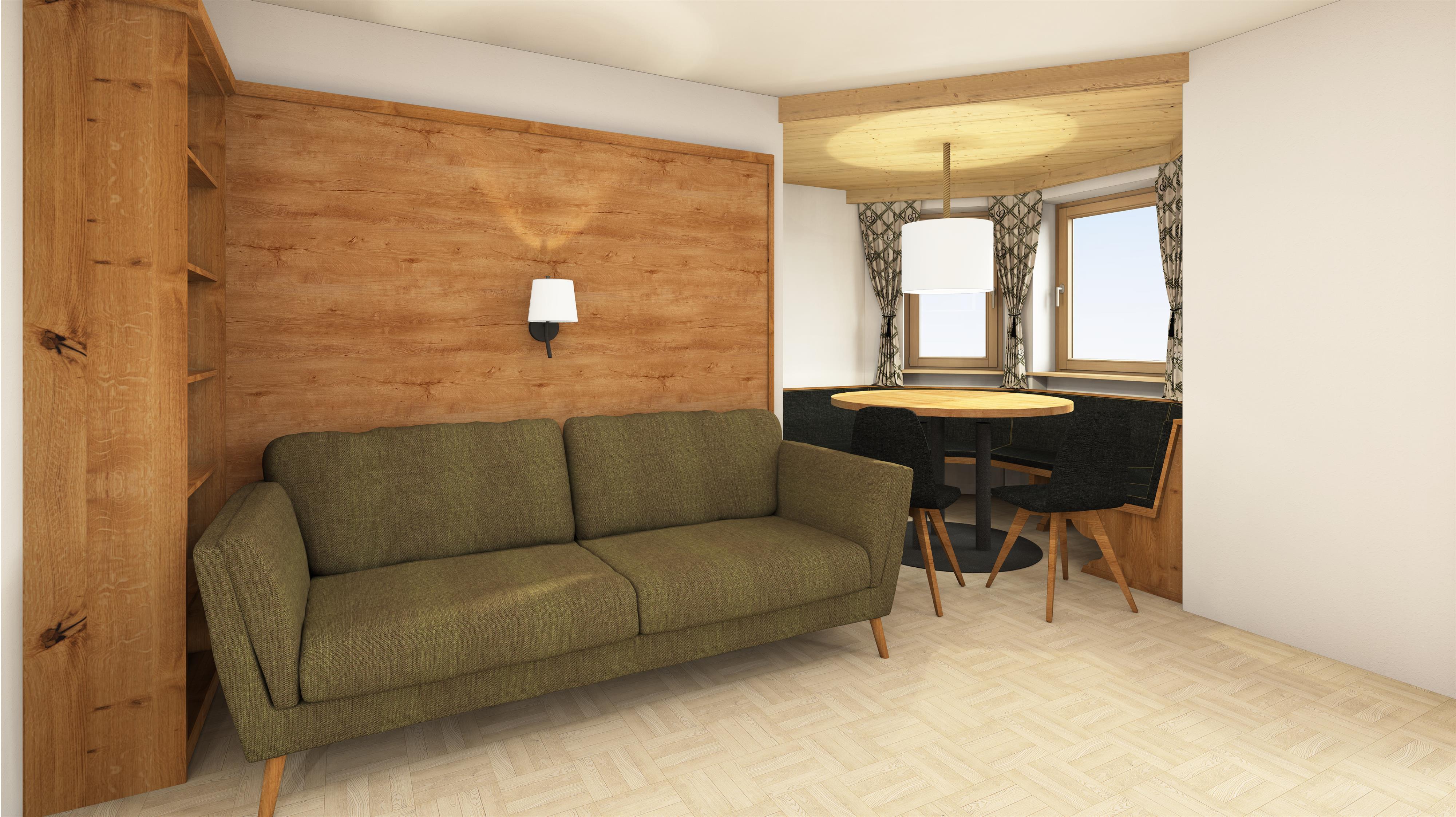 Wohnraum mit Erker, Sitzecke und Kochnische,