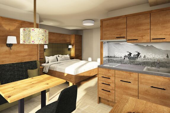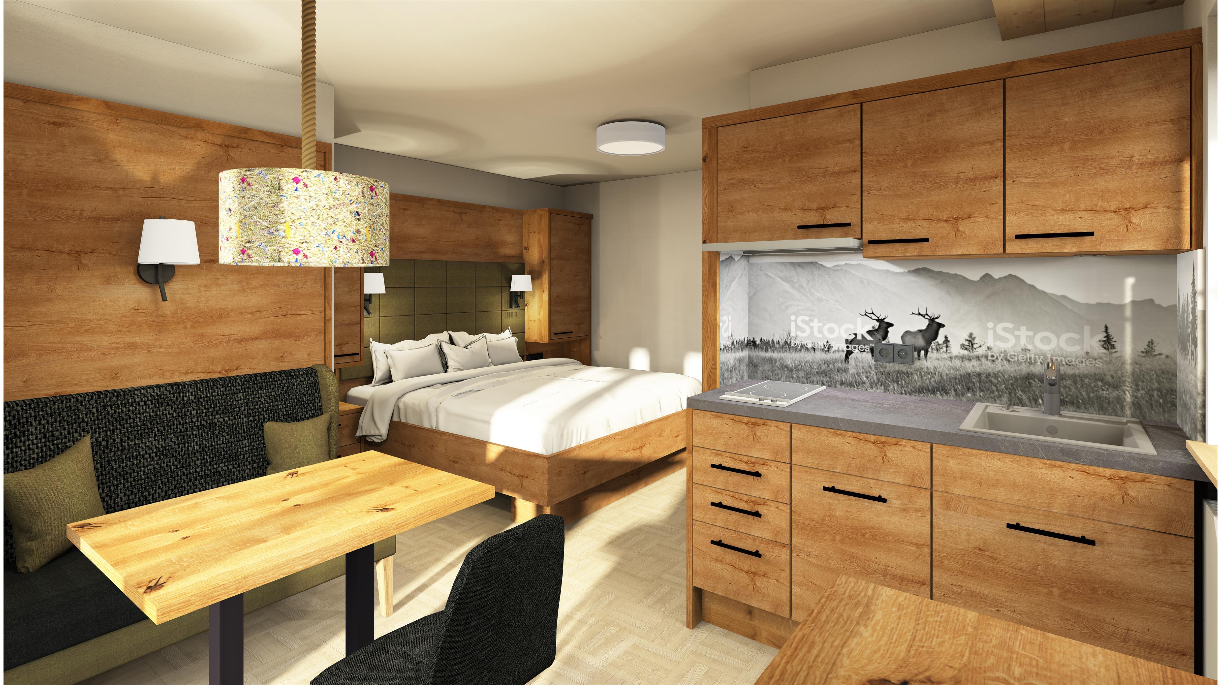 Wohn- Schlafraum, 20 m², separates Sofa und Essecke, Küchenzeile,