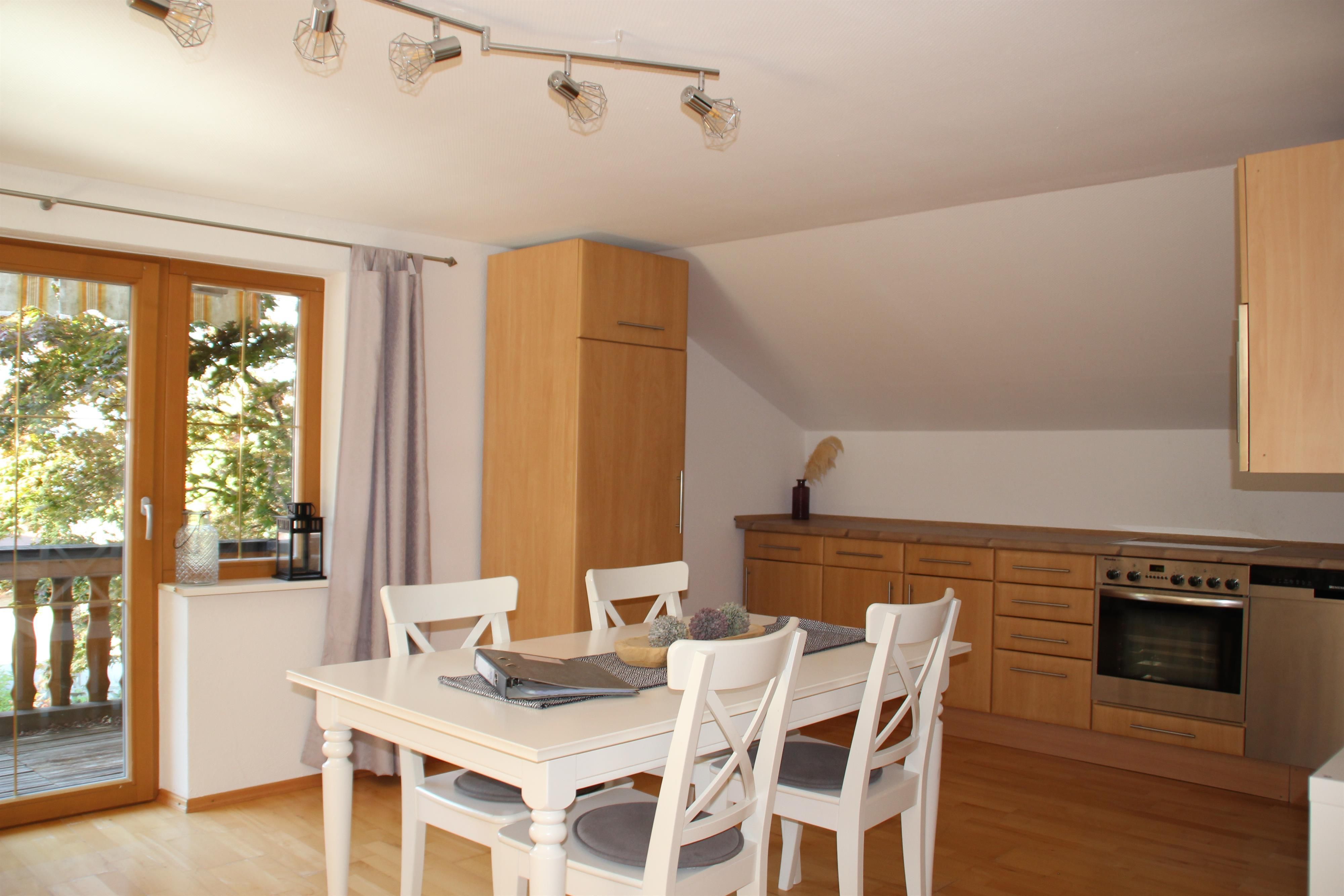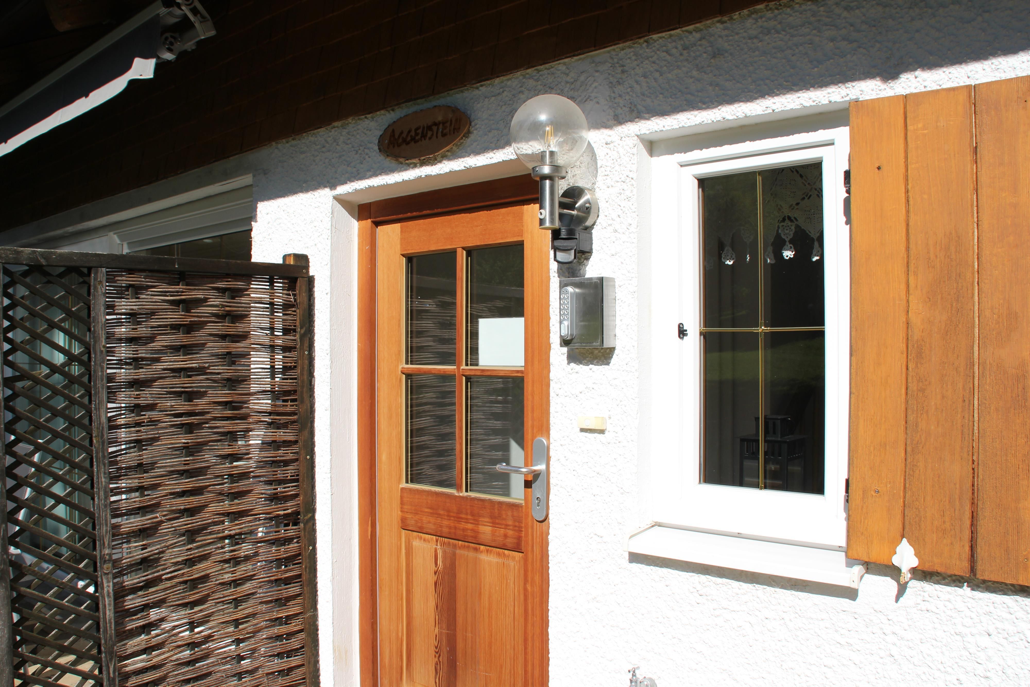 Die Ferienwohnung „Aggenstein“ im Obergeschoss bietet auf 66 m² Platz für Paare oder kleine Familien bis 4 Personen. Sie verfügt über ein Schlafzimmer mit Doppelbett, Bad mit Wanne/Dusche, separate Küche und einen Wohn-/Essbereich mit Schlafsofa. Von hier genießen Sie einen traumhaften Blick auf die Berge. Babybett und Hochstuhl stellen wir bei Bedarf gerne kostenlos bereit. Der Eingang befindet sich auf der Rückseite des Hauses und ist über die PKW-Stellplätze erreichbar.