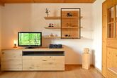 Wohnzimmer mit stilvoller Eßecke, hochwertiger Couchgarnitur, Holz-Kasettendecke, Flachbildschirm.