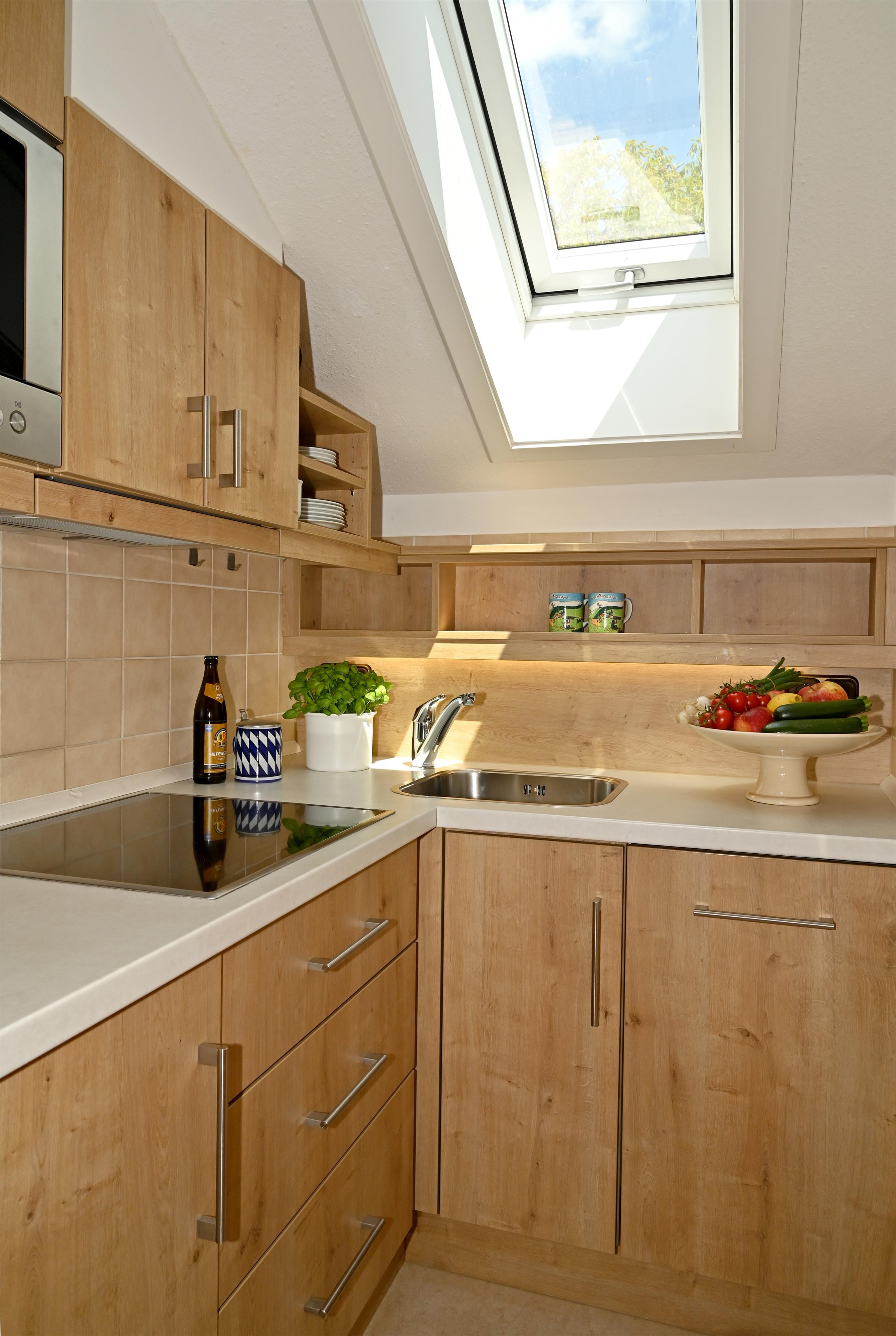 Getrennte, komplett ausgestatte Küche.