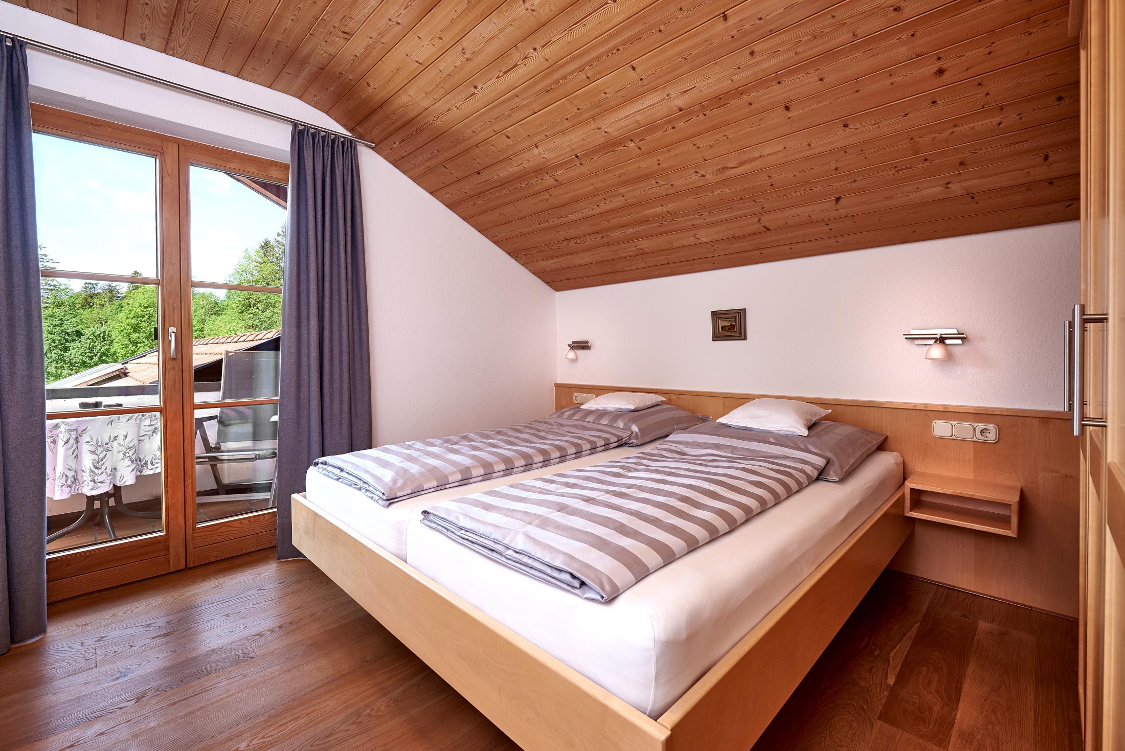 1 separates Schlafzimmer mit Doppelbett, Holz-Täferdecke.