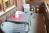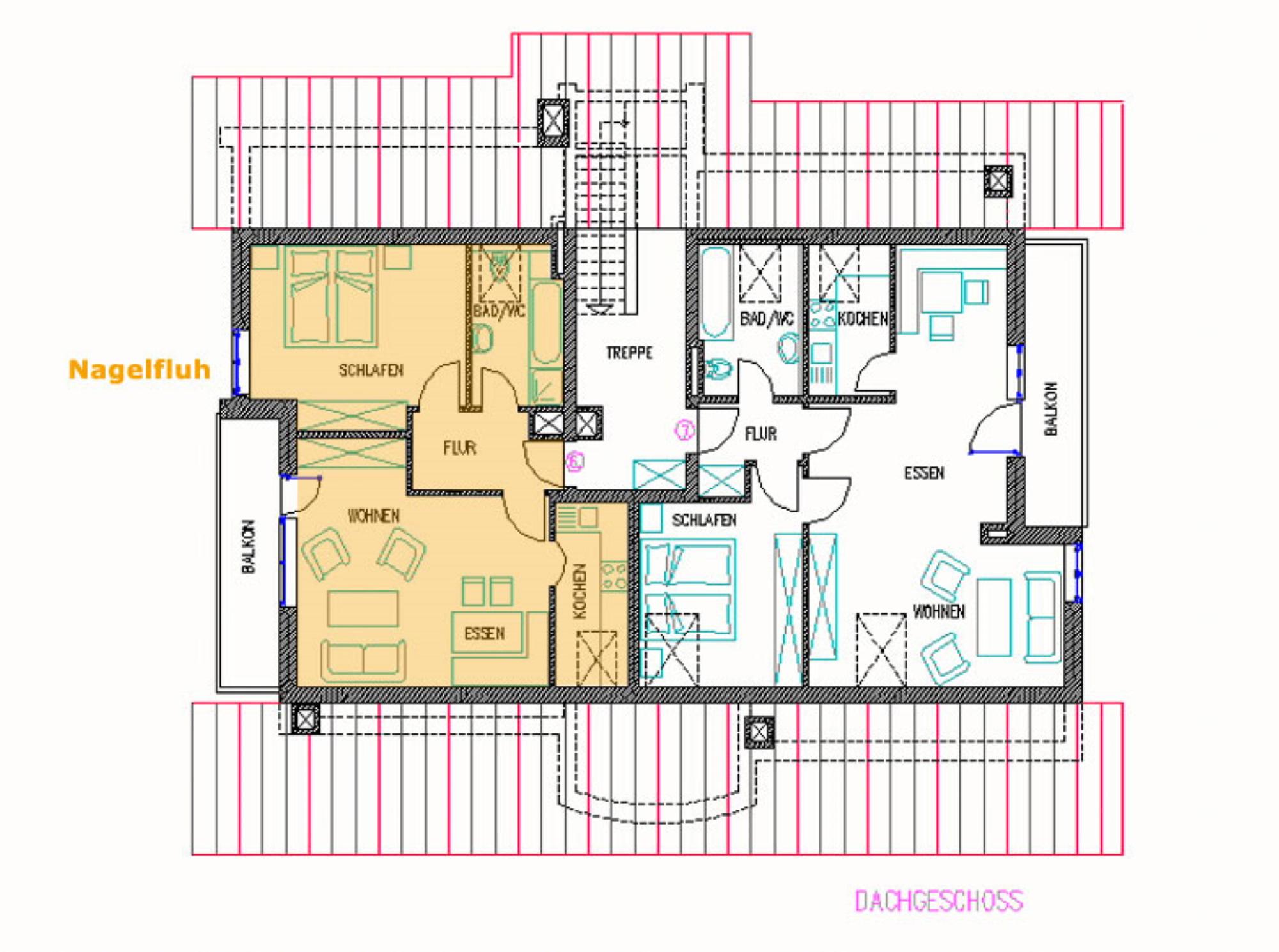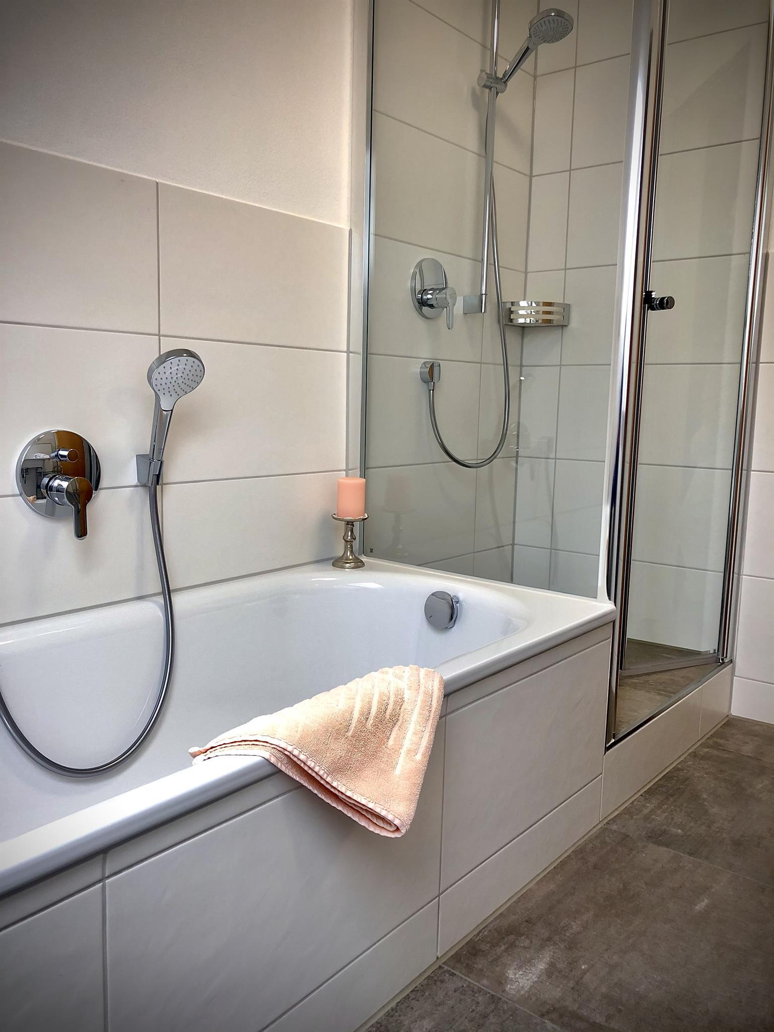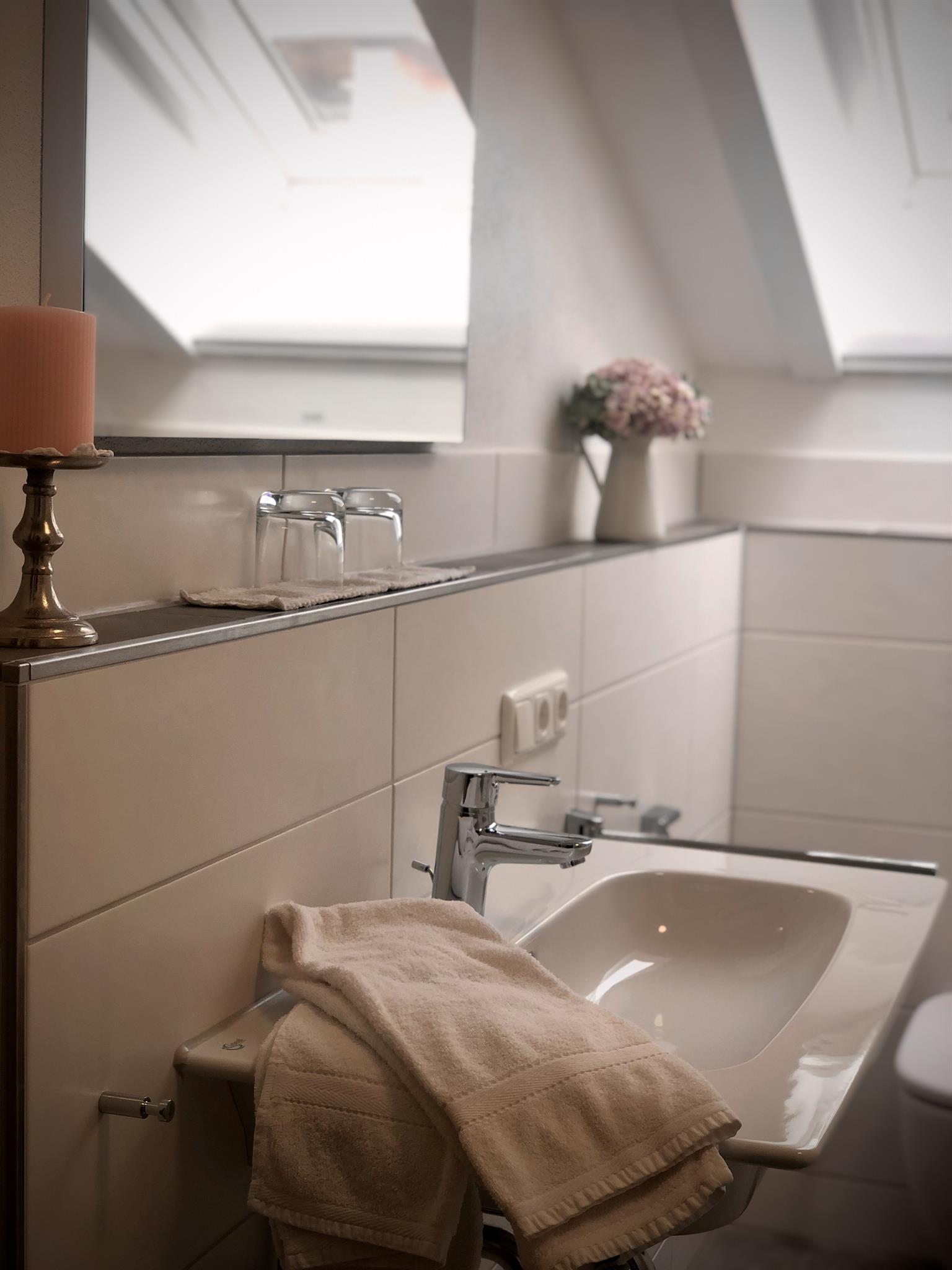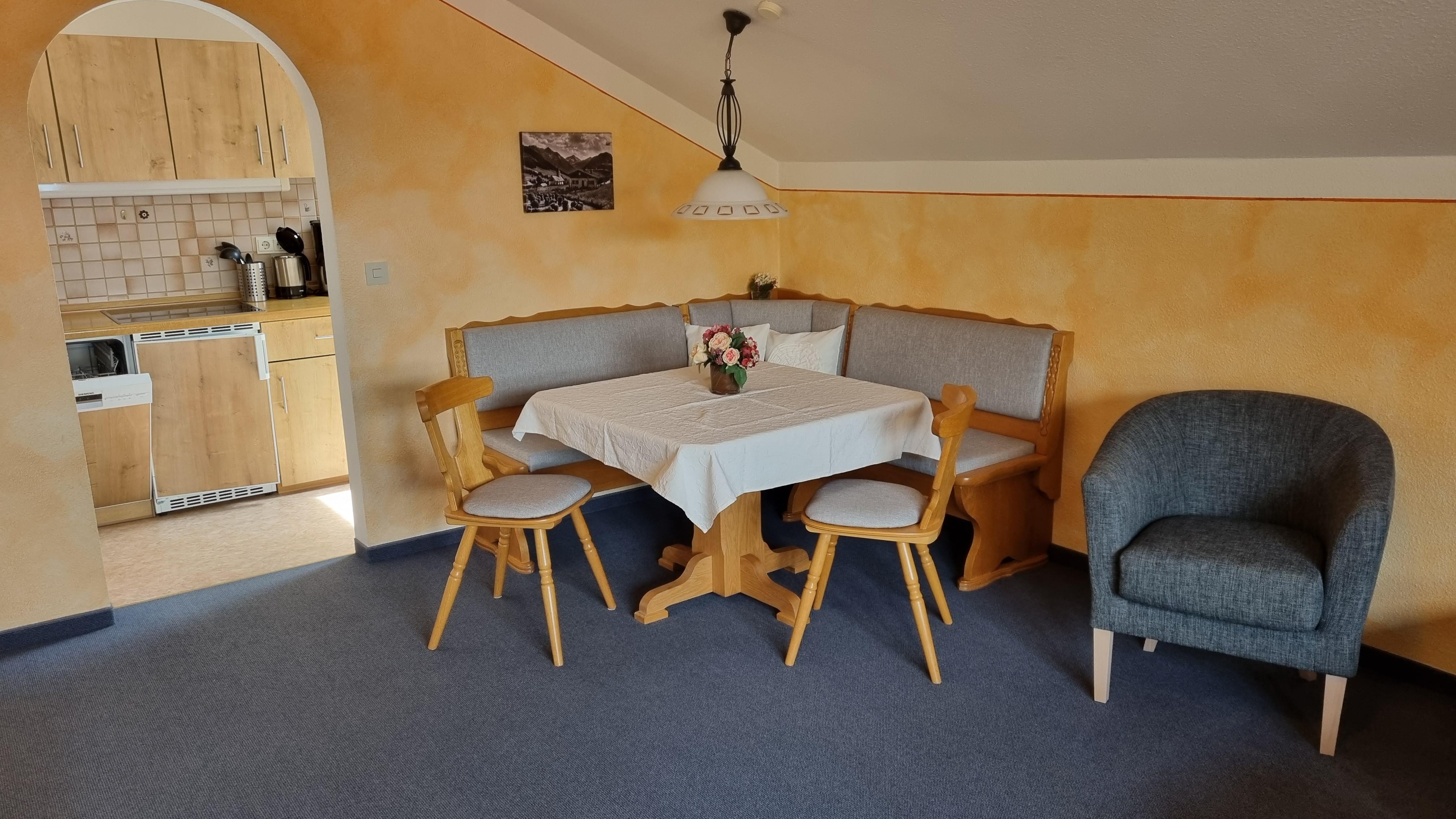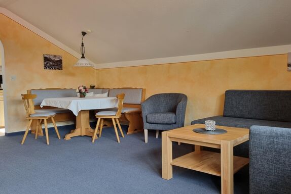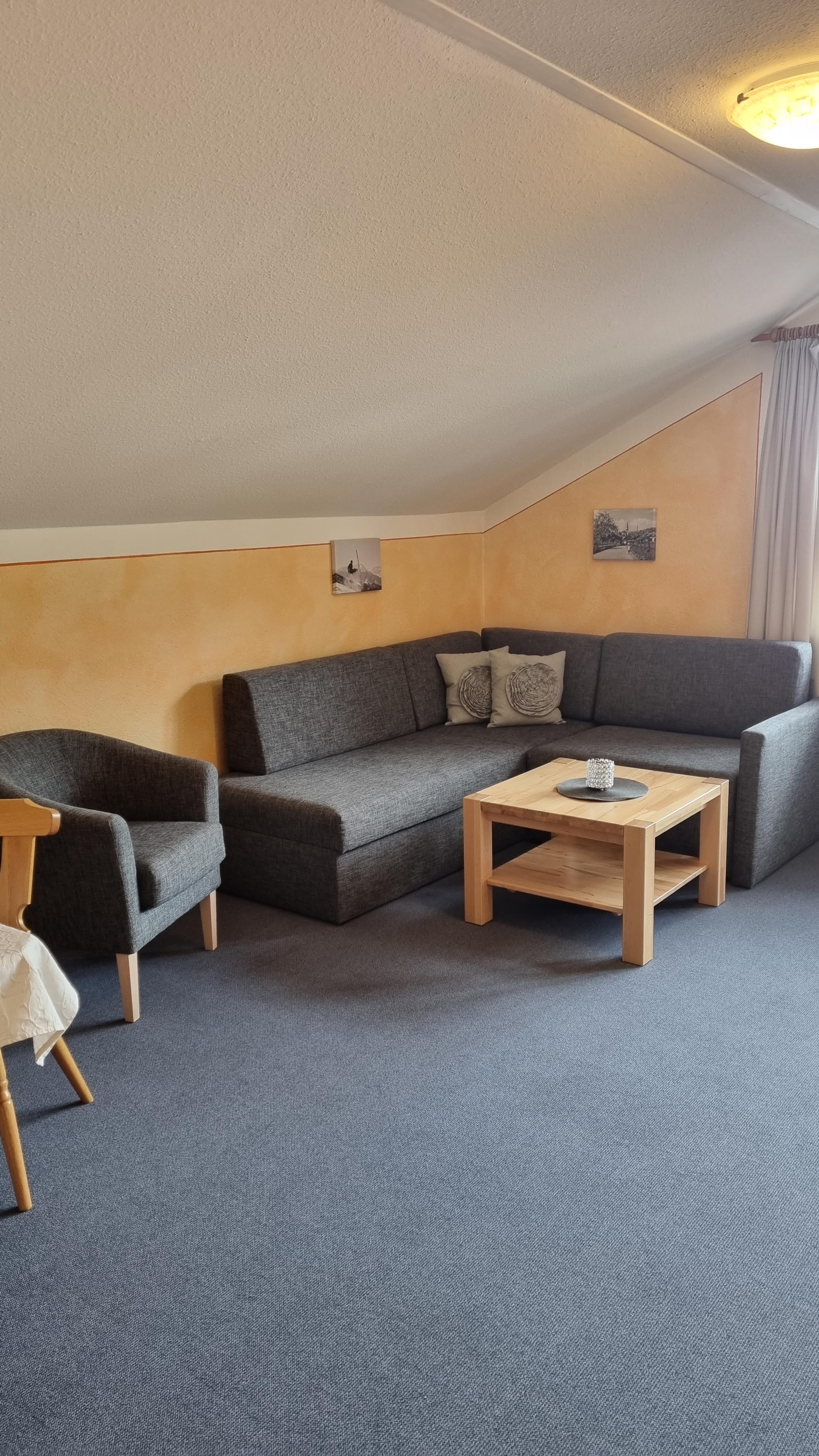 4 Sterne Ferienwohnung im DG, 1 Wohnzimmer mit Couch, 1 Schlafzimmer, Küche, Diele, Bad + Dusche, WC, Balkon ca. 58 qm. Landhausstil, Gebirgsaussicht.