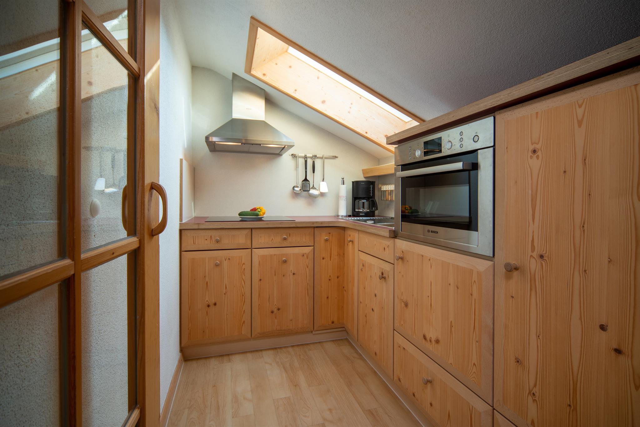 Küche mit 4 Kochplatten, Backofen, Spülmaschine, Kaffeemaschine, Espressokocher, Wasserkocher, Toaster, Eierkocher, diverse Arbeitsgeräte, Kochtöpfe, Gläser und Geschirr.