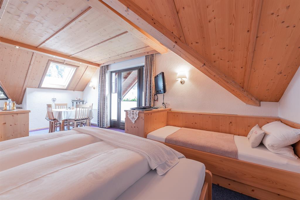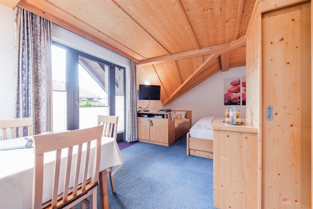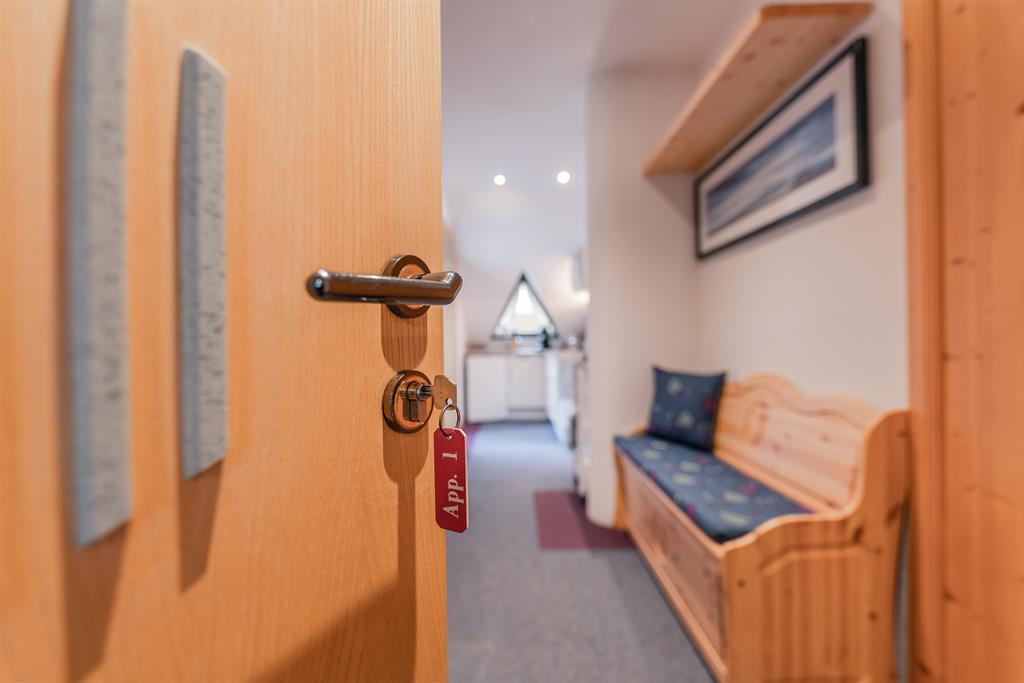 Das Stuido Apart Matteo für 2-3 Personen mit südseitigem Balkon verleiht eine heimelige und gemütliche Atmosphäre. Nach einem erlebnisreichen Tag, können Sie sich in unserer mit Liebe zum Detail eingerichteten Wohnung entspannen, den Tag Revue passieren lassen und die Ruhe genießen. Offener Schlaf- Wohnraum mit einem Doppelbett und einem Einzelbett, Sitzecke mit Esstisch, Sofa und einem Flachbild-Sat-TV, Safe. Kleine Küche mit Geschirrspüler, Kaffeemaschine, Senseo Maschine, Mikrowelle, Kühlschrank, Standbackofen, 2-Plattenceranherd, Toaster, Wasserkocher. Badezimmer mit Dusche/WC und Bademantel; Größe ca. 42 m²