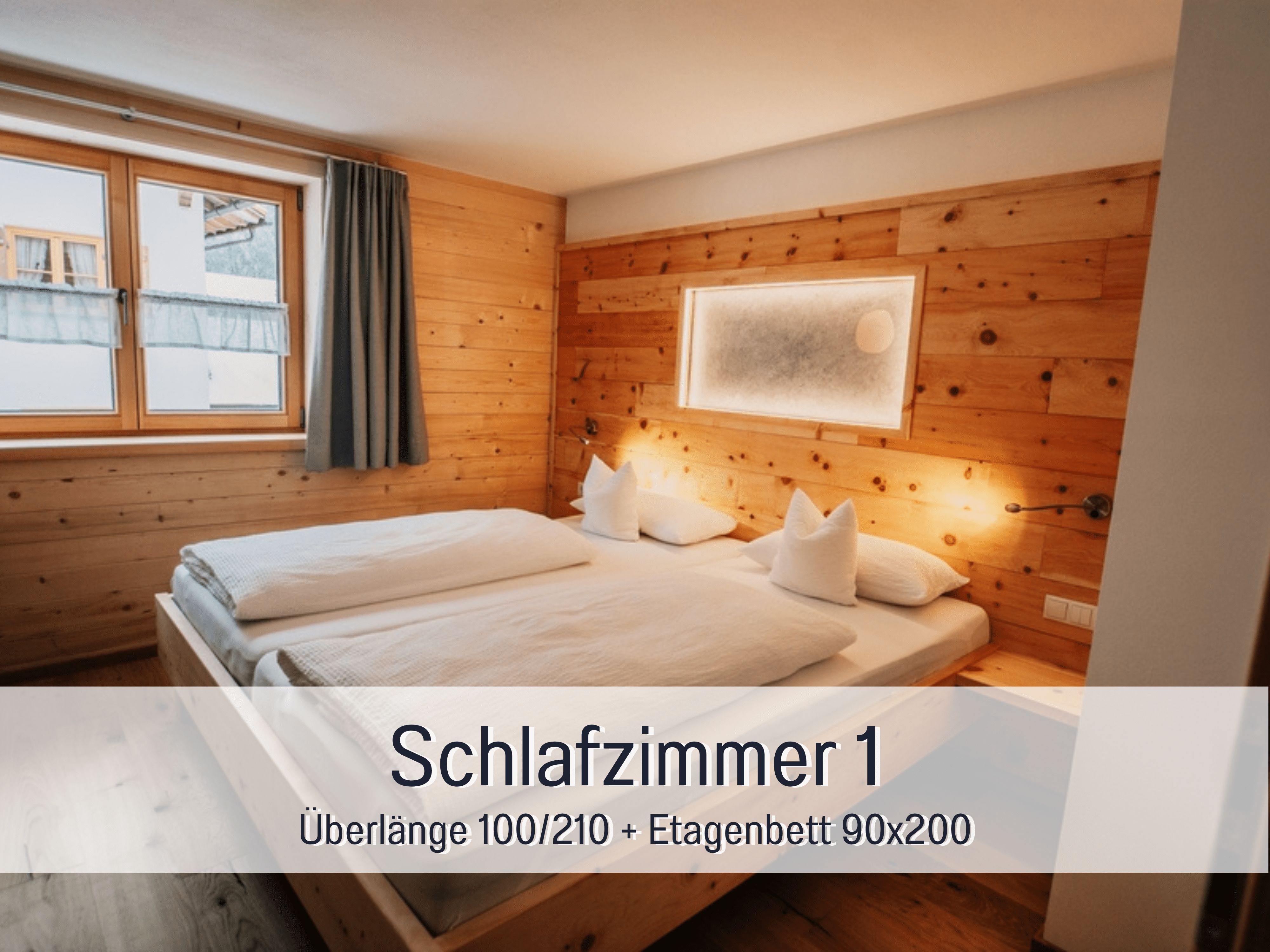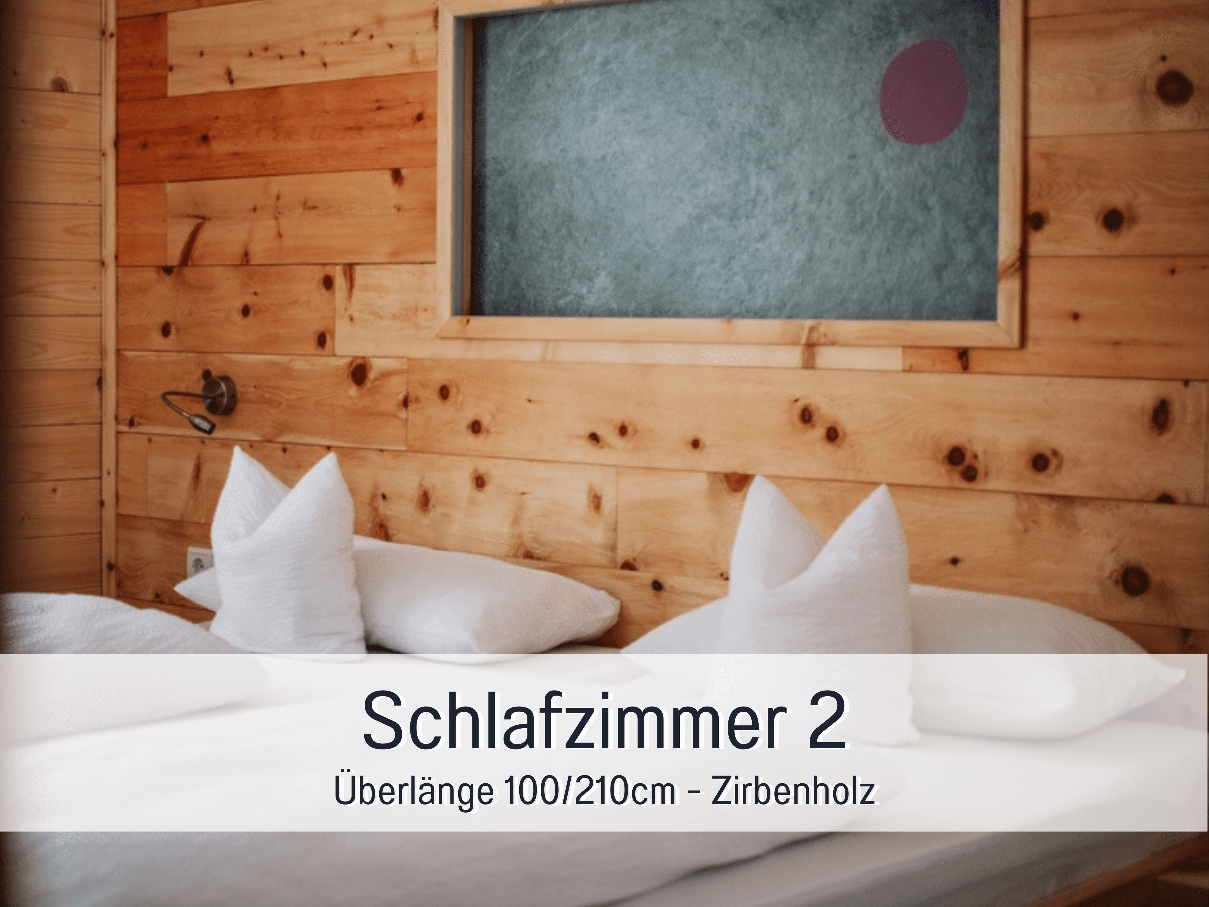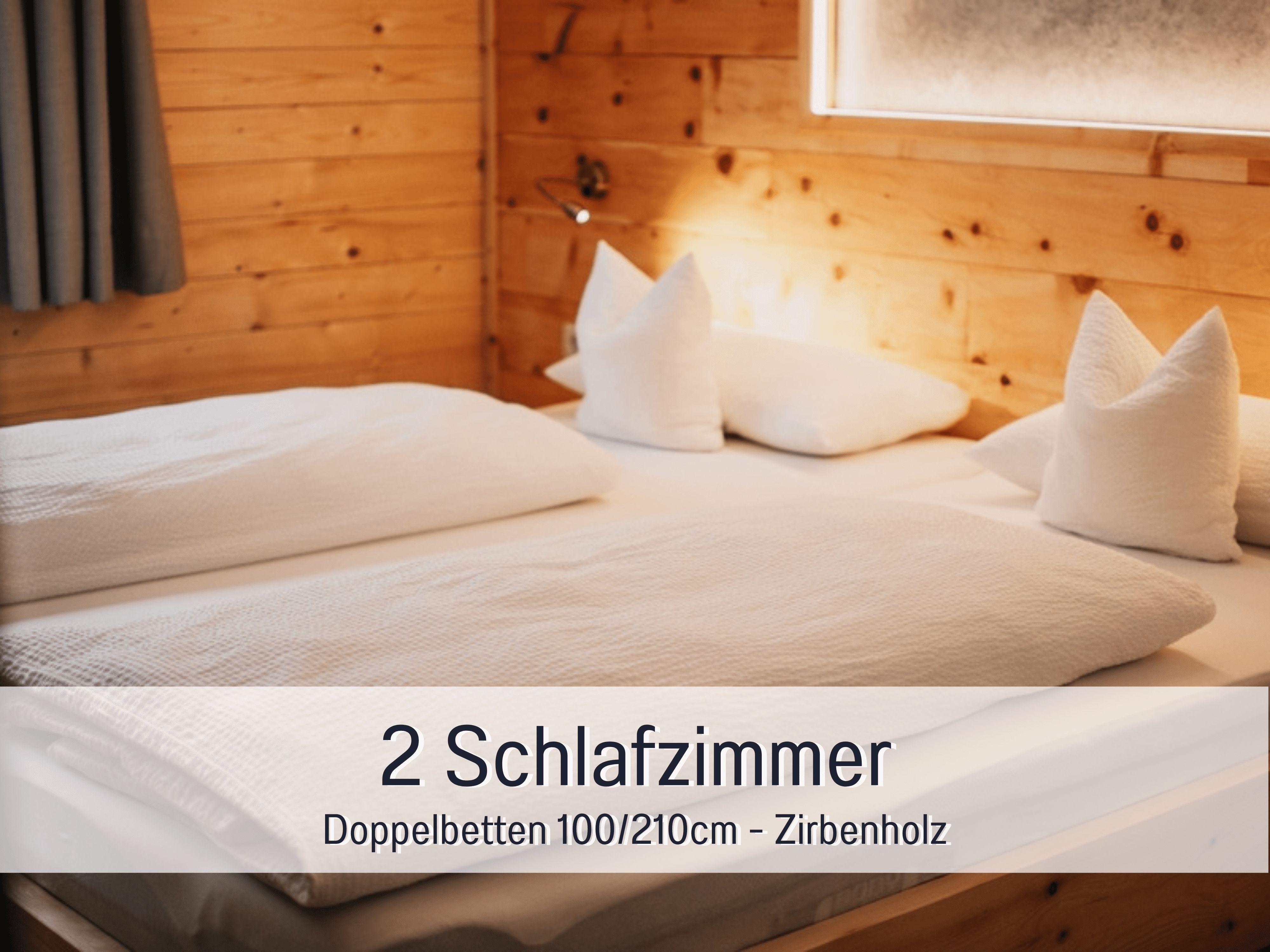 • zwei getrennte Schlafzimmer mit Doppelbetten aus Zirbe in Überlänge