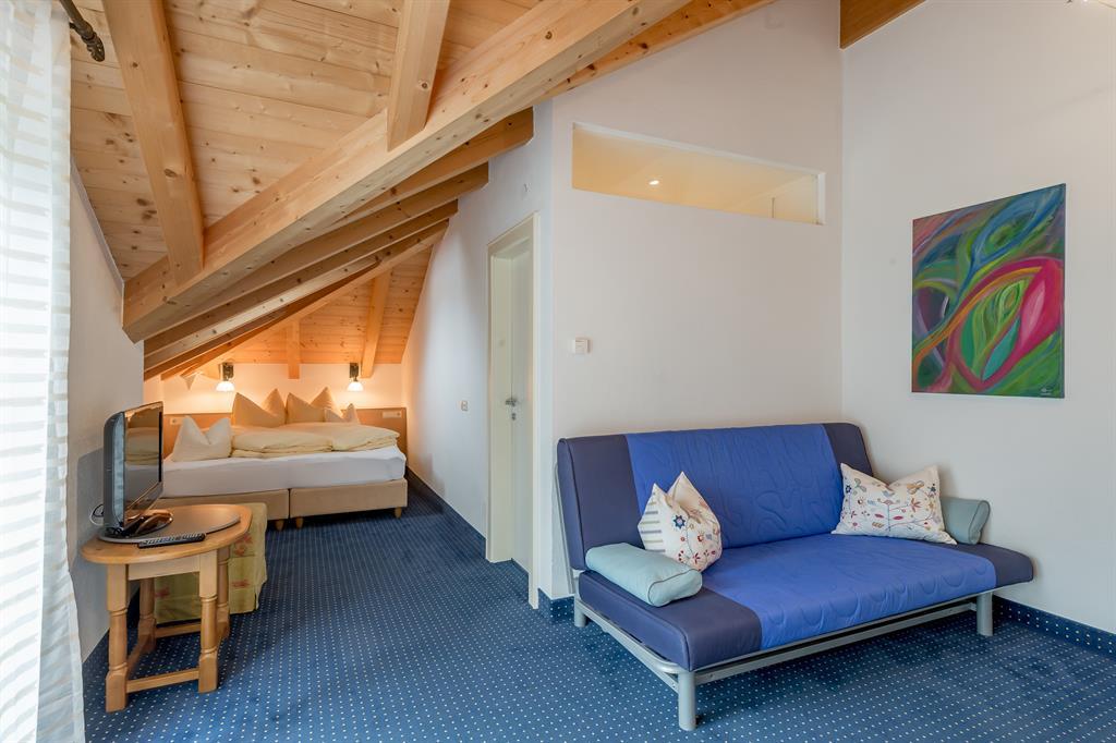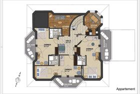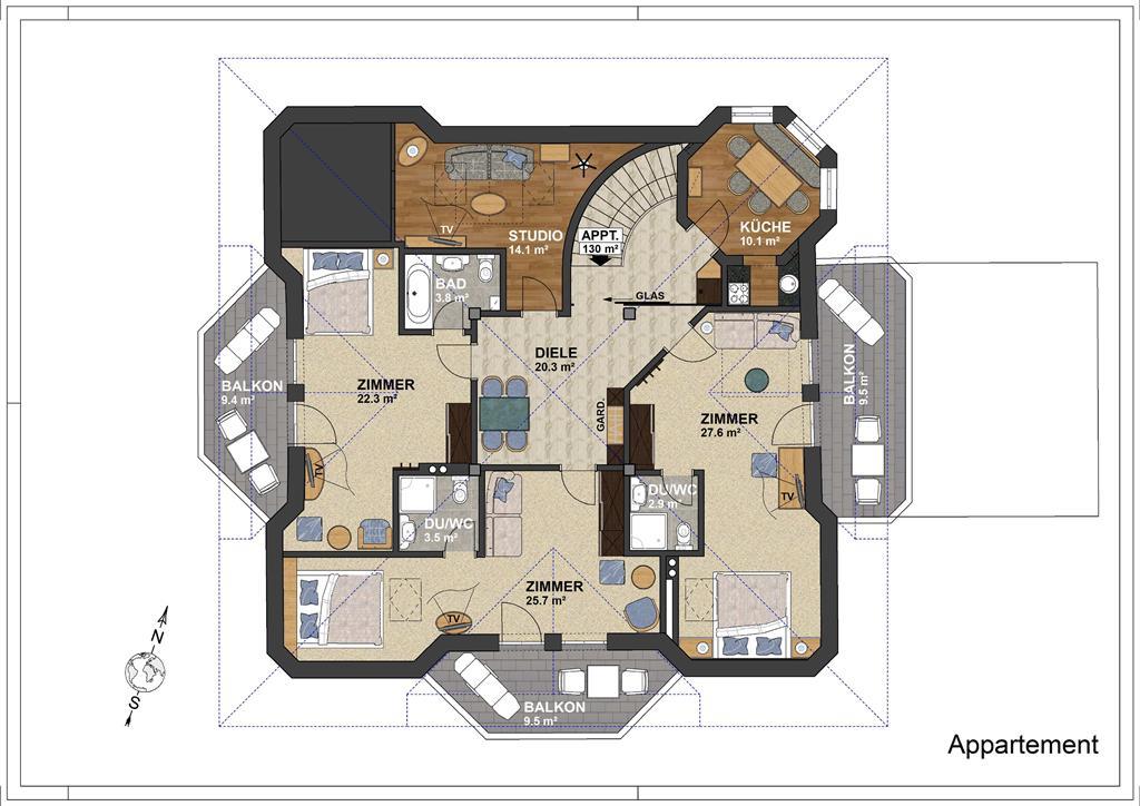 3 großzügige Doppelzimmer mit TV und jeweils einem Badezimmer (1x Badewanne/WC, 2x Dusche/WC) und Balkon. Zustellbett in den Zimmern möglich. Das Highlight des Appartements bildet die Essecke in unserem „Turm“ mit sehr kleiner Kochgelegenheit (4-Platten-Cerankochfeld, Kühlschrank, Geschirr, Kaffeemaschine uvm.) und ein zusätzlicher kleiner Wohn-Schlafraum mit einem Schlafsofa und TV. Gesamtgröße ca. 120 m².