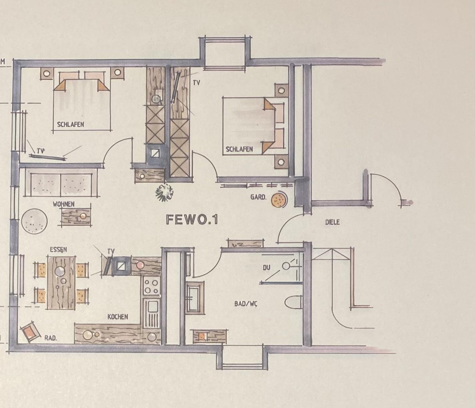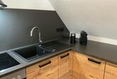 - einer Wohnküche (große Küchenzeile, Ceranherd, Backofen, Spülmaschine, Kühlschrank mit Eisfach, Dunstabzug, Nespressomaschine, Milchaufschäumer, Wasserkocher etc.), Sofa, Esstisch, Flachbild TV