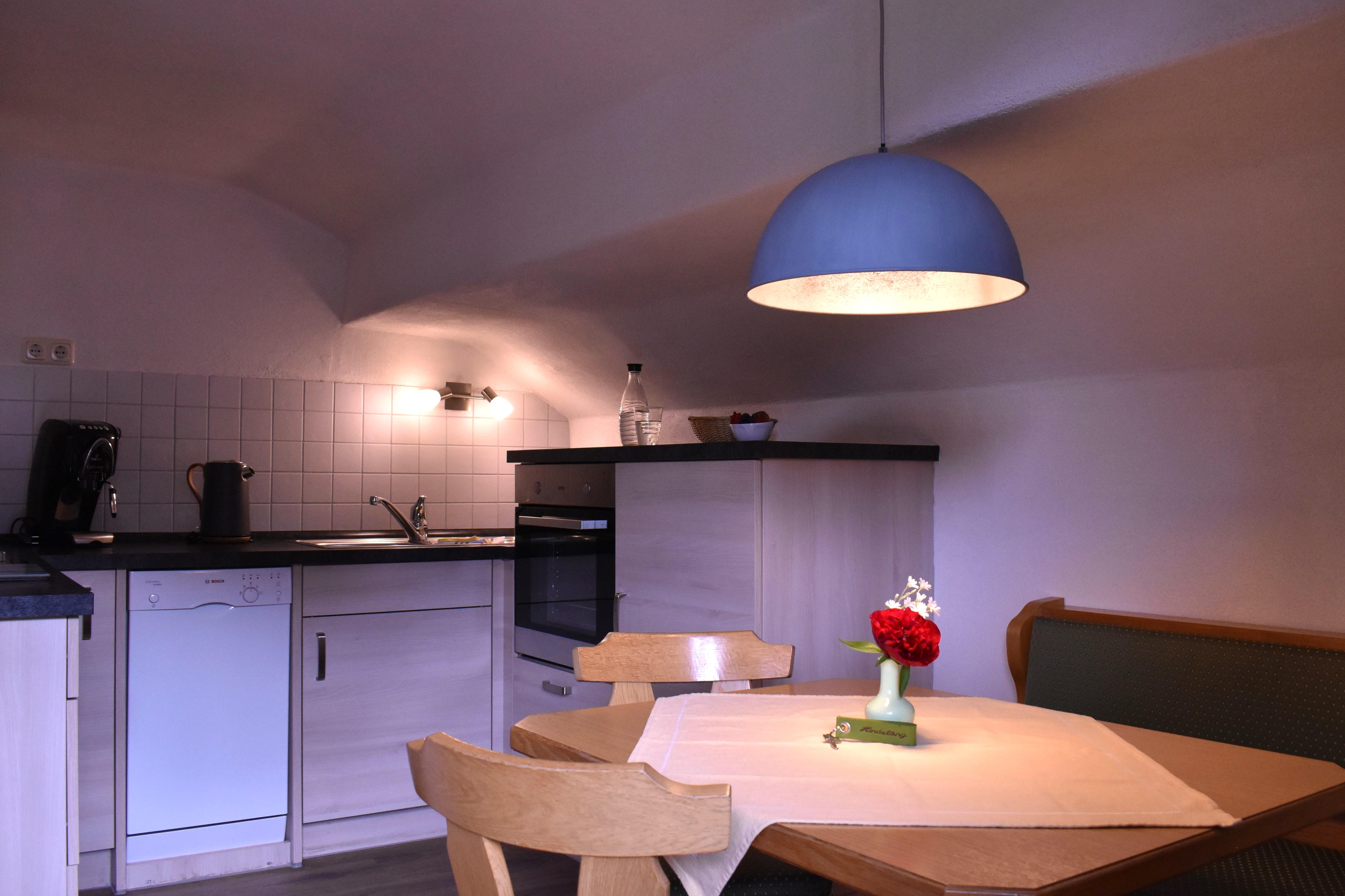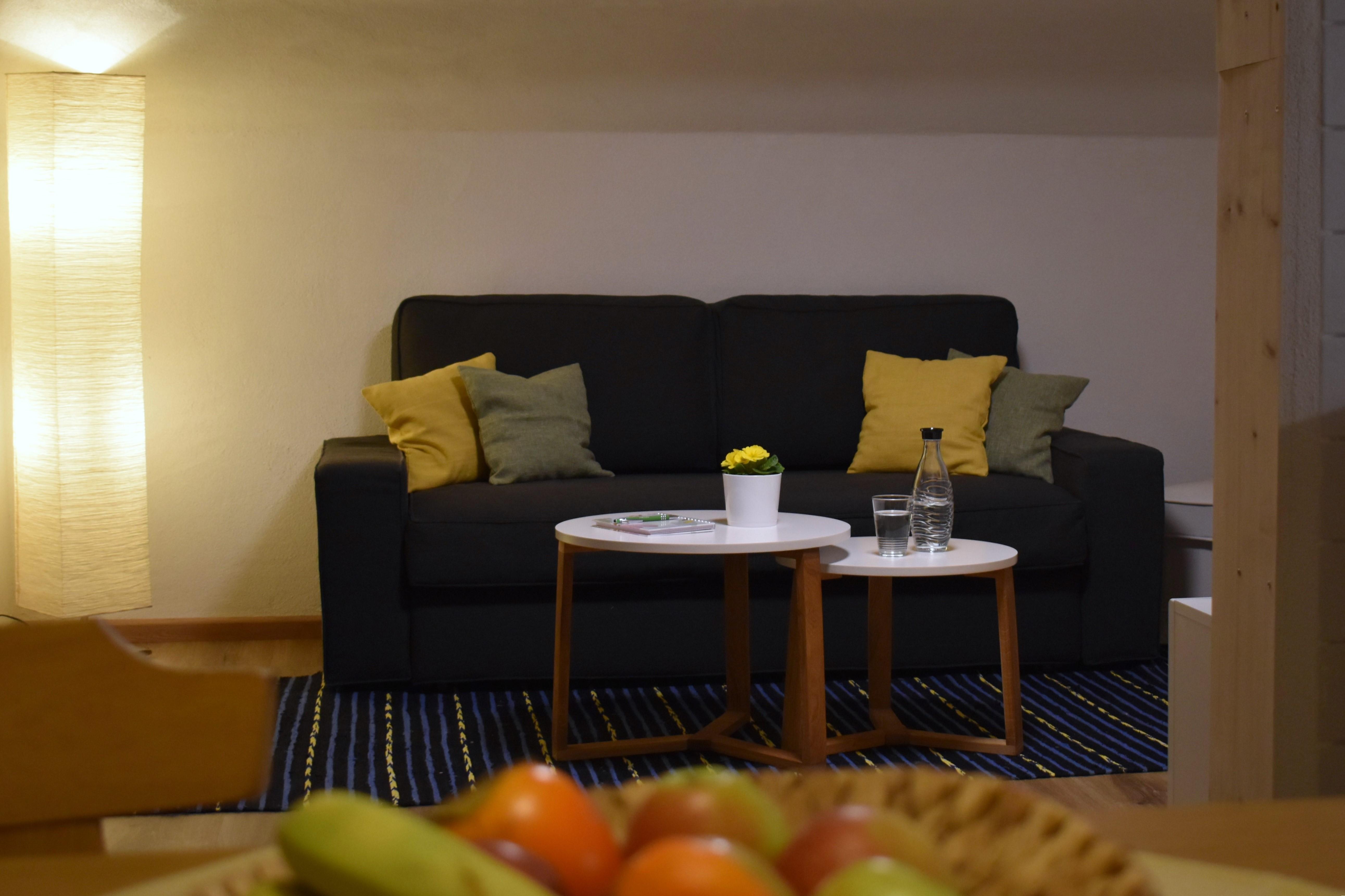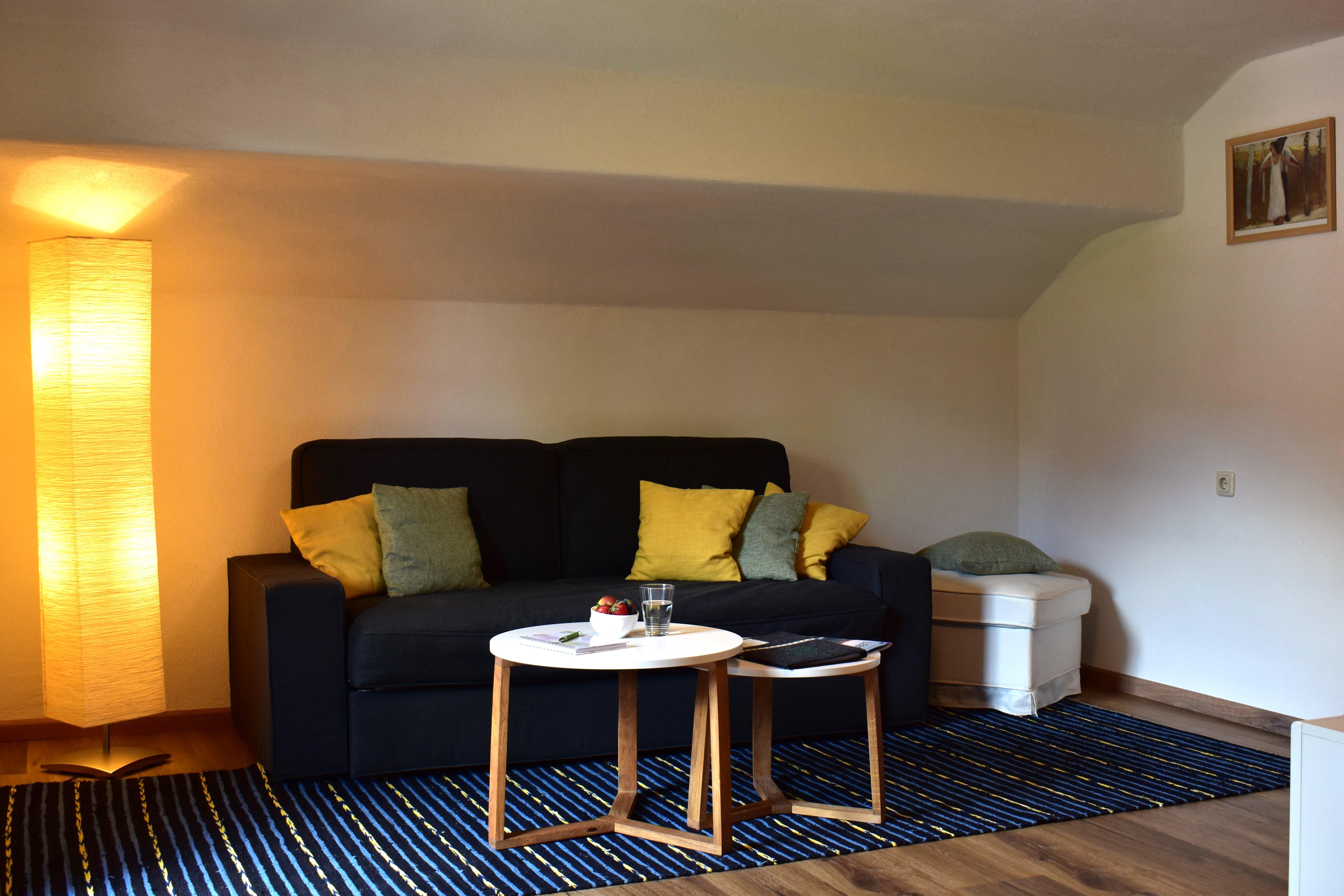 Unsere Wohnung Hornblick liegt im Dachgeschoss (Dachschrägen!). Ein separater Schlafraum (inkl. TV), Wohnraum und die Wohnküche lassen keine Wünsche übrig. Das Sofa im Wohnzimmer kann als Schlafcouch genutzt werden, ebenso ist ein Zustellbett im Schlafraum auf Anfrage möglich.