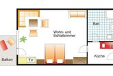 kombinierter Wohn- und Schlafraum mit Doppelbett