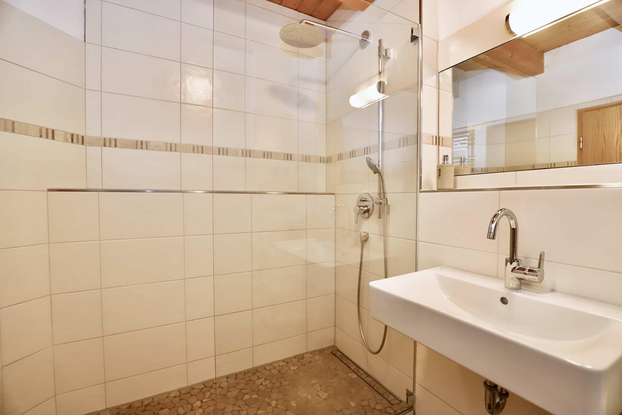 Bad mit Waschbecken und begehbarer Dusche, inklusive Handtücher und Bettwäsche. Großer Ostbalkon mit herrlichem Panoramablick zum Iseler. Beheizter Skikeller, Parkplätze direkt am Haus.