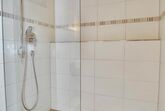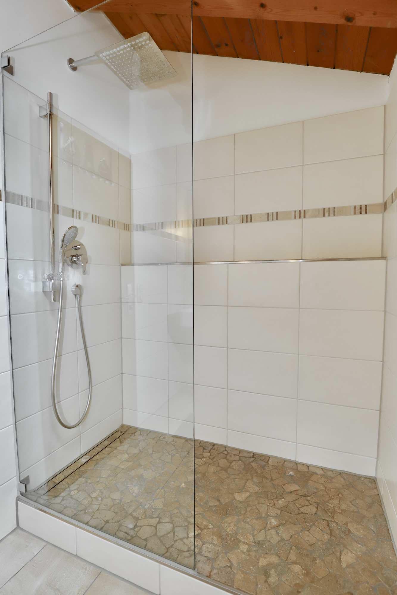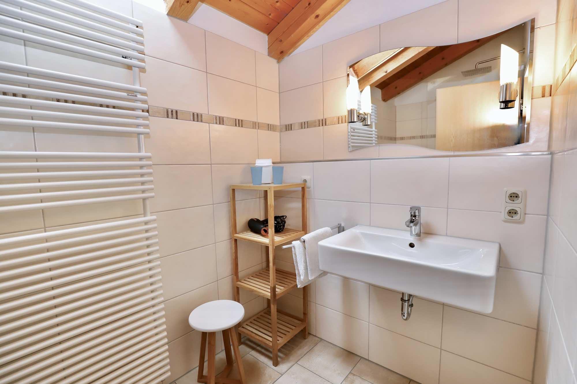 Bad mit Waschbecken und begehbarer Dusche, separates WC, inklusive Handtücher und Bettwäsche